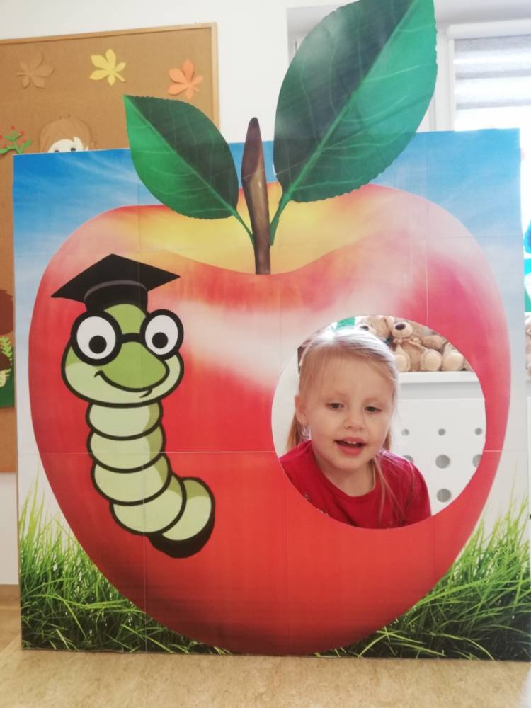 Podczas wspólnej zabawy był również czas na wykonanie zdjęć w jabłuszkowej budce oraz malowanie jabłka farbami. To był bardzo ciekawy i wesoły dzień w przedszkolu!