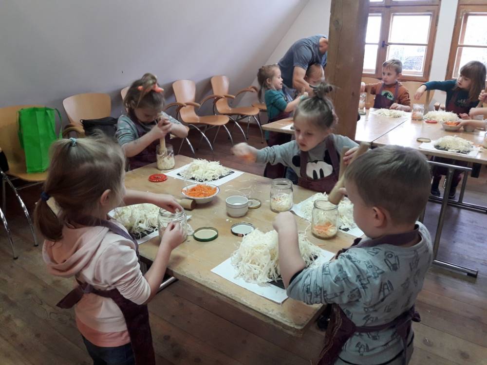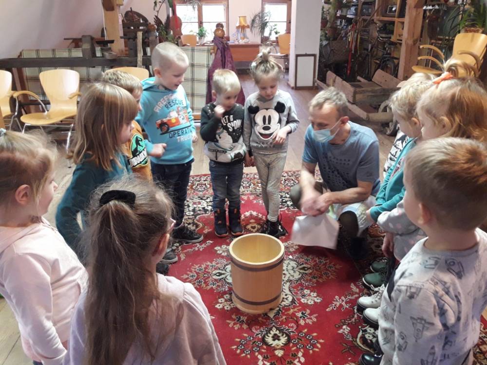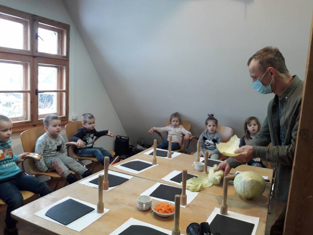 W dniu 8 grudnia 2021 roku dzieci z grupy "Motyle" uczestniczyły w warsztatach regionalnych pt. "Kapuściana przygoda" w Chacie Kaszubskiej. Prowadzący warsztaty pan Krzysztof przedstawił za pomocą obrazków rodzinę kapusty oraz zastosowanie kapusty w leczeniu niektórych dolegliwości. Każde dziecko miało okazję poszatkować kapustę, co było dla nich dużym wyzwaniem. Po umyciu rąk i po założeniu fartuszków dzieci pokrojoną kapustę wkładały do słoików, a następnie ubijały trampkiem, pamiętając o dodaniu marchewki i soli. Tak przygotowaną kapustę zabrały do domu, aby po ukiszeniu zrobić z niej pyszną surówkę. Na zakończenie "kapuścianej przygody" dzieci skosztowały surówek z ukiszonej kapusty i w podziękowaniu zaśpiewały piosenkę "Kapuściana piosenka". Dzieci z grupy "Motyle" serdecznie dziękują pracownikom Chaty Kaszubskiej za miłe przyjęcie, a panu Krzysiowi za przeprowadzenie warsztatów w atrakcyjny sposób.