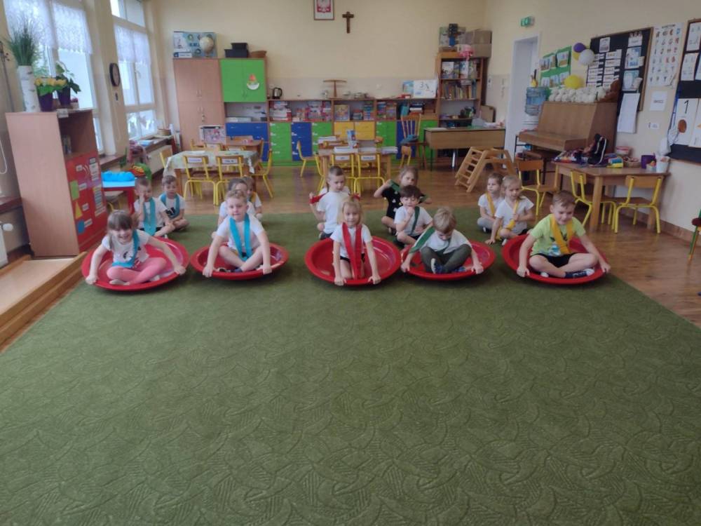 W kążdy piątek nasza grupa spotyka się na wspólnej gimnastyce. Zawsze pamiętamy, aby rozpoczynać każde zajęcia od rozgrzewki następnie pracujemy nad małymi, dużymi grupami mięśniowymi w zależności nad czym chcemy pracować. Dzieci z wielką ochotą przygotowują się do zajęć przebierając się w stroje gimnastyczne oraz odważnie pokonują przeszkody i uczestniczą we wspólnych zabawach.