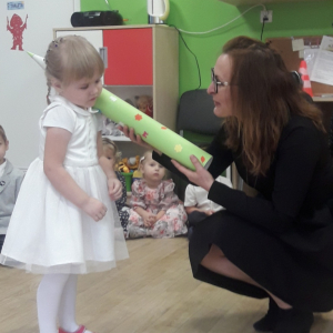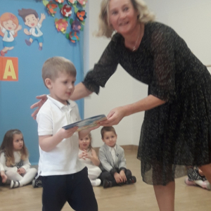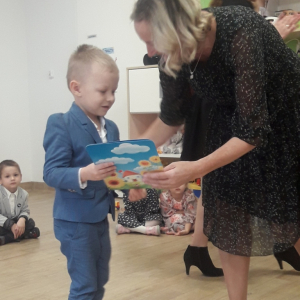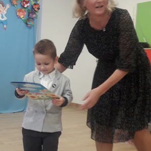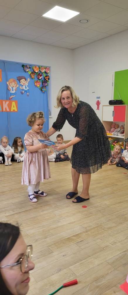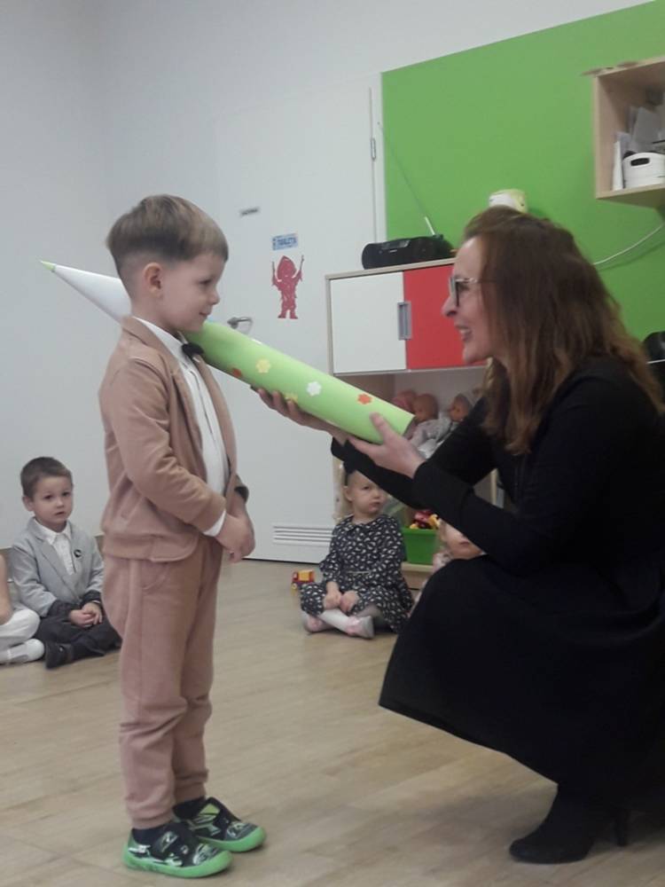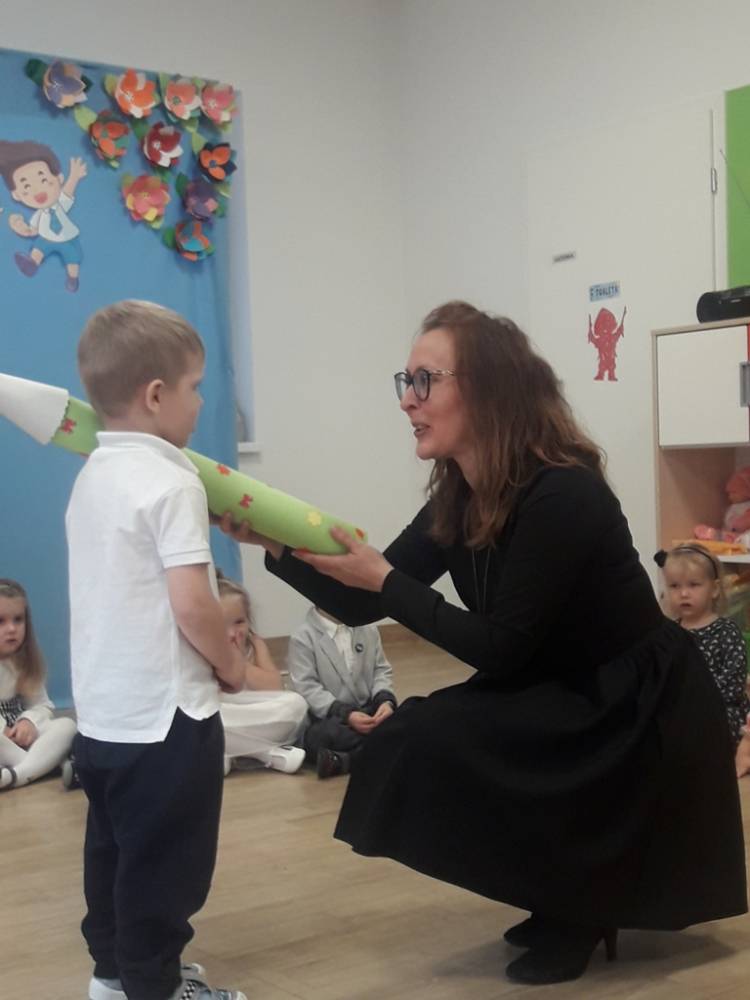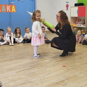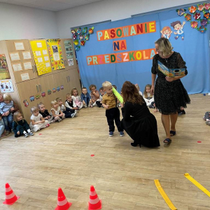 Dzień 26 października 2023 roku to wyjątkowy i ważny dzień dla dzieci z grupy "Słoneczka". Tego dnia miała miejsce uroczystość "Pasowania na Przedszkolaka" z udziałem zaproszonych Rodziców. Po powitaniu gości dzieci zaprezentowały swoje umiejętności recytatorskie, wokalno - muzyczne i sprawnościowe. Były piosenki, wiersze, zabawy ilustrowane ruchem, a także pokaz samodzielnego zakładania kapci i pokonywania toru przeszkód. Po występach nagrodzonych gromkimi brawami, wszystkie dzieci złożyły przyrzeczenie, w którym obiecały, że będą słuchać pań i rodziców, na spacerach chodzić zawsze w równym rządku, kulturalnie spożywać posiłki, w zgodzie bawić się z kolegami, a po zabawie odkładać zabawki na miejsce. Po części artystycznej Pani Dyrektor zaczarowaną kredką pasowała dzieci na dzielnych przedszkolaków. Wszystkie maluchy otrzymały pamiątkowe dyplomy, misie i upominki. Po zrobieniu zdjęć dzieci i rodzice usiedli do słodkiego poczęstunku przygotowanego przez mamy. Uroczystość "Pasowania na Przedszkolaka" była ważnym wydarzeniem dla maluchów i na zawsze pozostanie w ich pamięci. Dzieci i panie serdecznie dziękują rodzicom za pomoc w organizacji uroczystości, a mianowicie mamom: Julii, Jagny, Maurycego, Ignacego oraz Liwii i Leona.