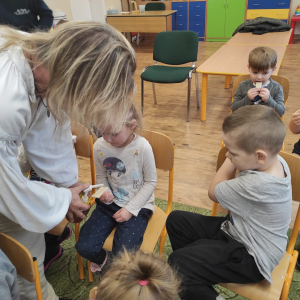 15 października "Stokrotki" poznawały tajniki życia pszczółek. Spotkanie było bardzo ciekawe i pełne niespodzianek. Dzieci zdobyły wiele ciekawych wiadomości o życiu pszczół, smakowały pyłek pszczeli i miodek, obserwowały pszczoły w ulu ze szkła... Dostały dyplomy i książeczki o pszczołach. A po powrocie do sali przygotowały woskową świeczkę.
