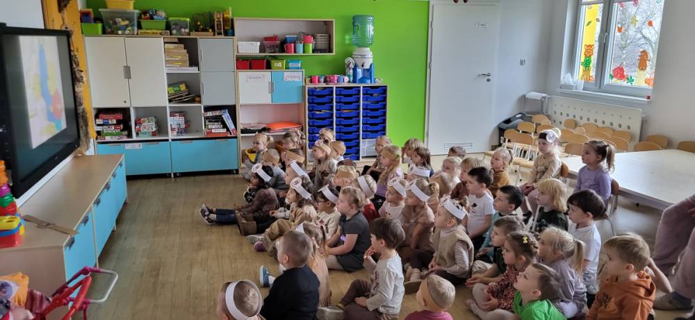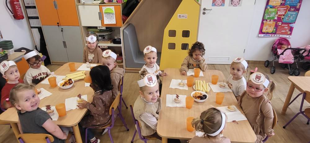 Następnie Jeżyki wraz z grupą Słoneczek i Krasnoludków obejrzały bajkę „Misiowanki”, która wprowadziła wszystkich w ciepły i przyjazny, misiowy nastrój. Po seansie dzieci wróciły do swojej sali, gdzie czekał na nie poczęstunek przygotowany przez rodziców.