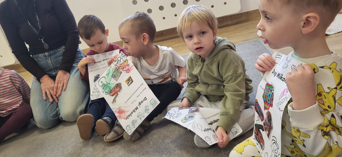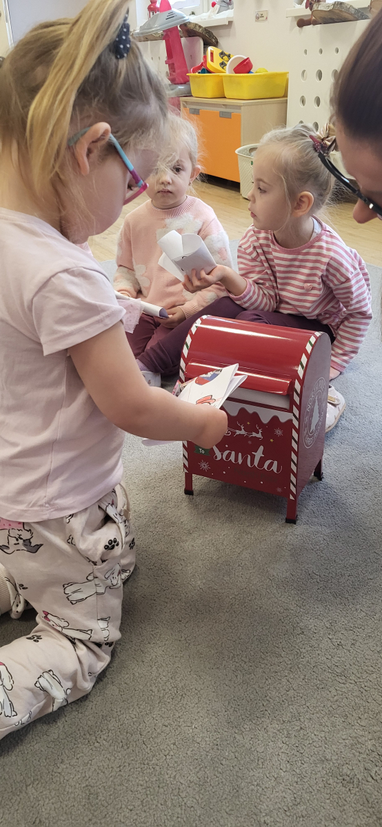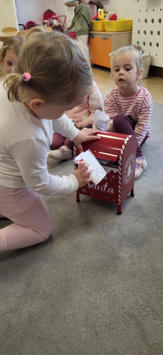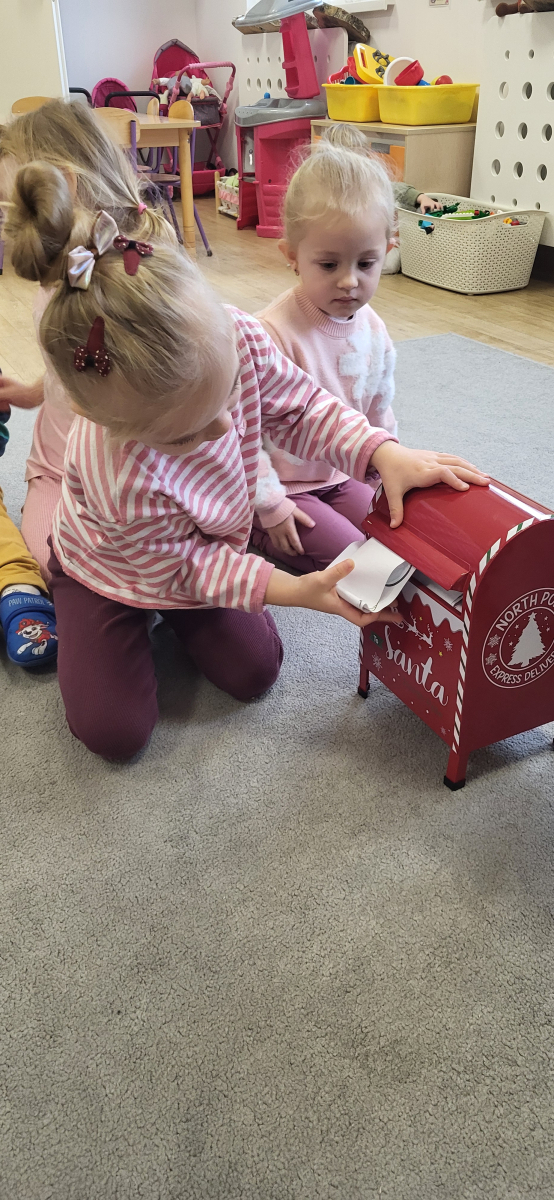 Kiedy listy były już gotowe, dzieci wrzucały je do naszej specjalnej mikołajowej skrzynki pocztowej. Teraz wszystkie listy wyruszą w daleką podróż – prosto do samej Laponii, gdzie czeka na nie św. Mikołaj.