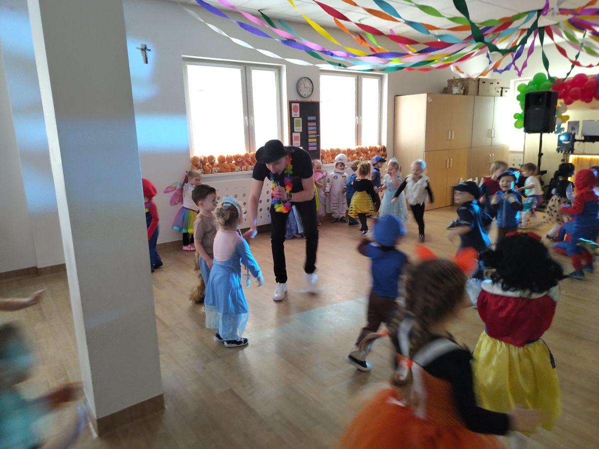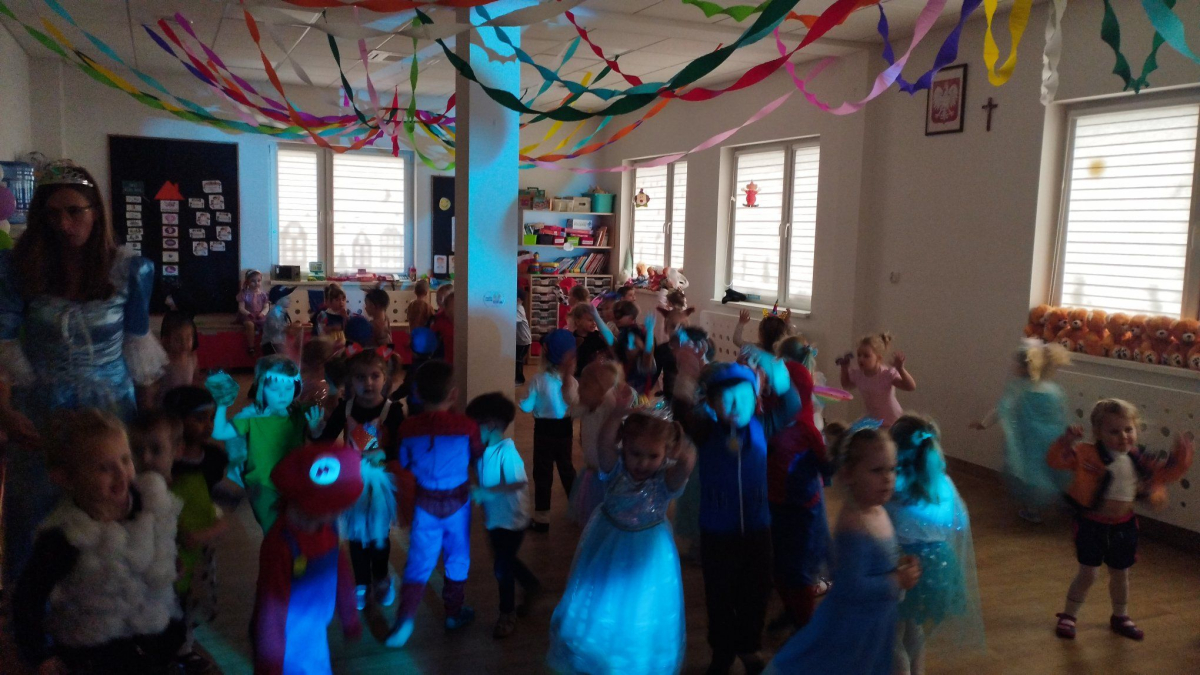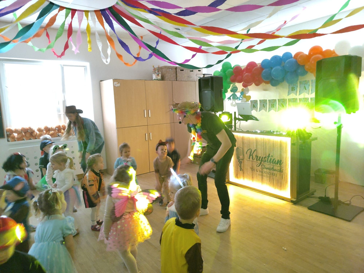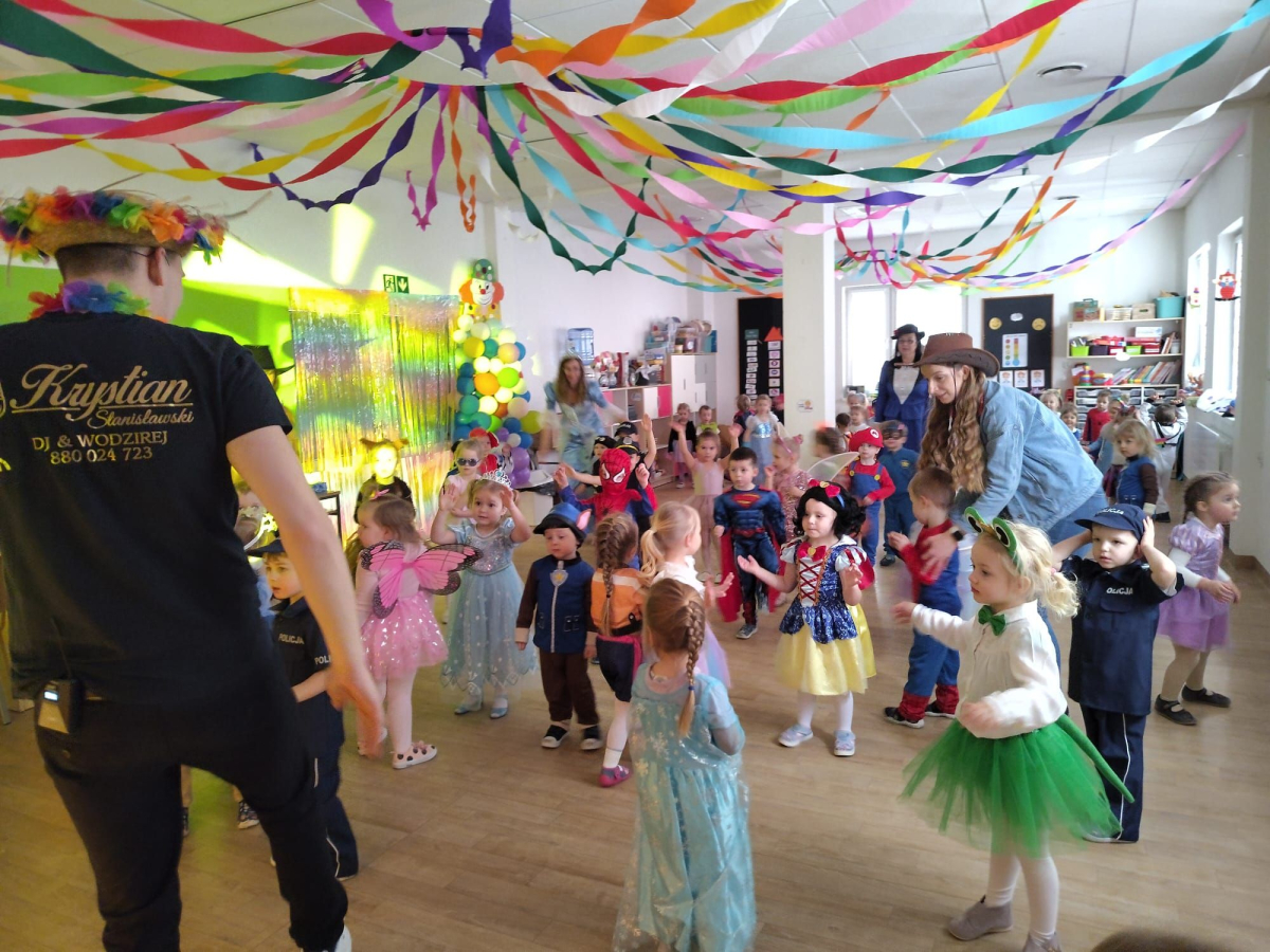 4 LUTEGO w środę już od rana w przedszkolu pojawiały się kolorowe postacie. Przedszkolaki przebrane były za bohaterów z różnych bajek, filmów oraz za służby mundurowe. W salach przedszkolnych można było spotkać między innymi: wróżki, królewny, rycerzy, piratów, policjantów, nie sposób zliczyć i wymienić tych wszystkich postaci. Rozpoznać dzieci było bardzo trudno. W pierwszej kolejności przedszkolacy mieli możliwość pozowania do zdjęć indywidualnych. Wystrój sal wprowadził w radosny nastrój oraz zachęcał wszystkich do wesołej zabawy. Na tę wyjątkową okazję zaprosiliśmy tatę naszego kolegi z grupy pana Krystiana Stanisławskiego, którego pasją jest muzyka i dobra zabawa nie tylko dla dorosłych ale też i dzieci.