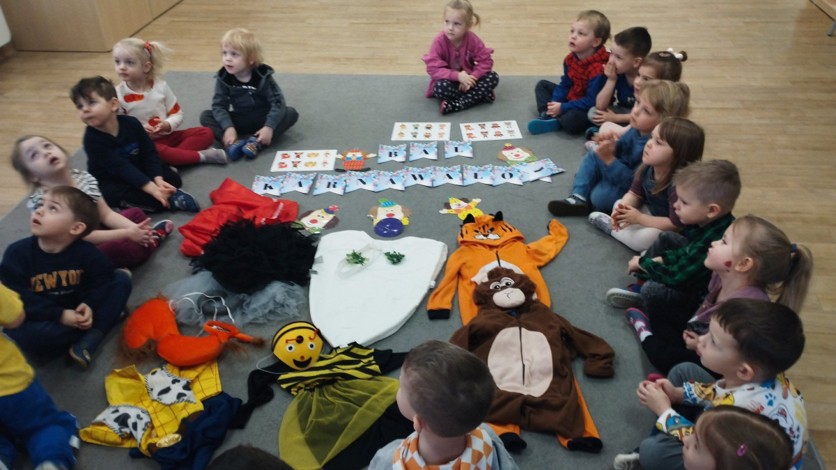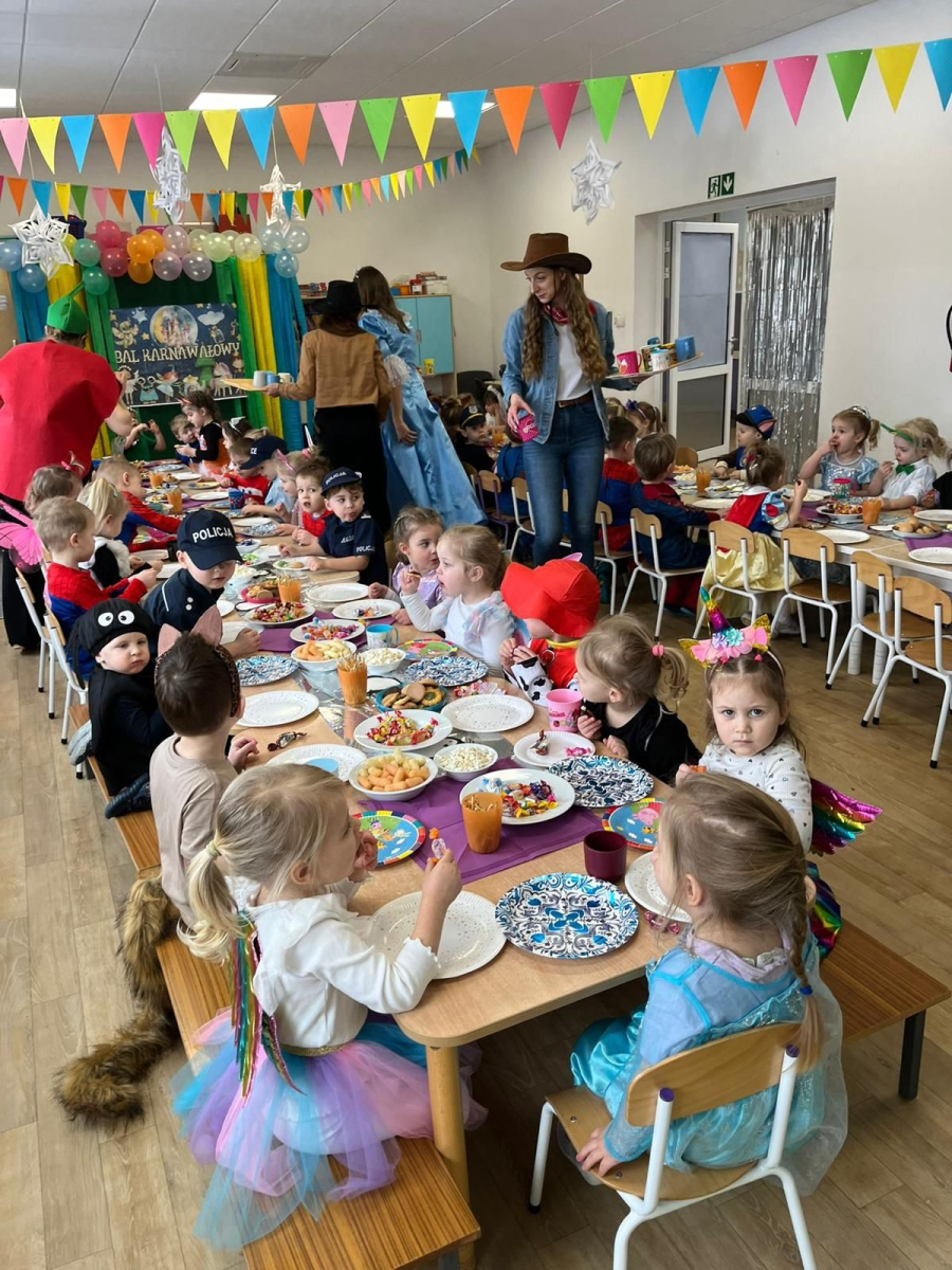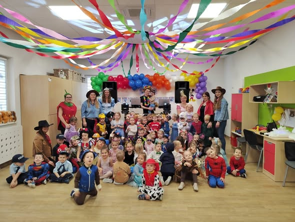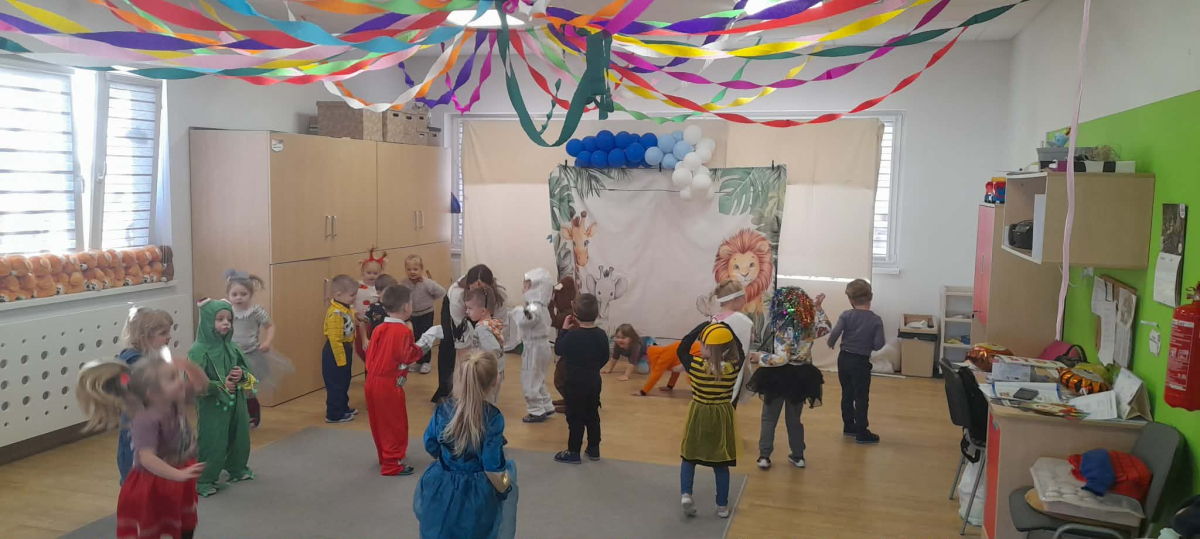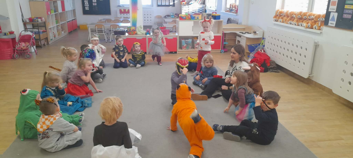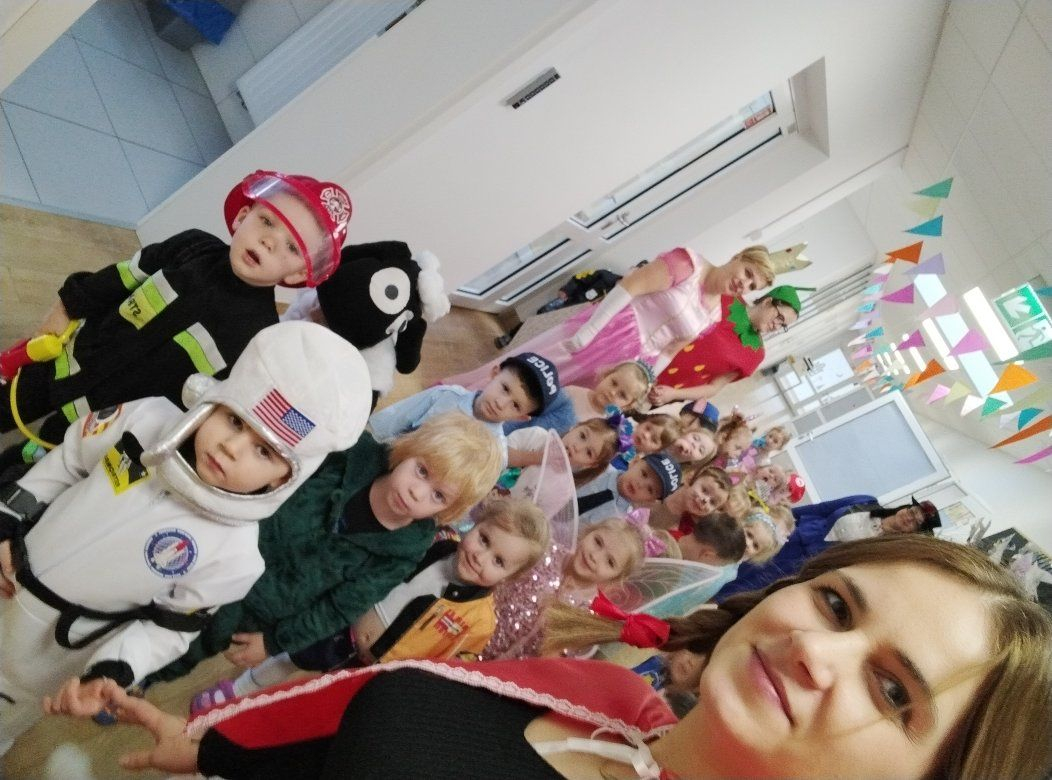 4 LUTEGO w środę już od rana w przedszkolu pojawiały się kolorowe postacie. Przedszkolaki przebrane były za bohaterów z różnych bajek, filmów oraz za służby mundurowe. W salach przedszkolnych można było spotkać między innymi: wróżki, królewny, rycerzy, piratów, policjantów, nie sposób zliczyć i wymienić tych wszystkich postaci. Rozpoznać dzieci było bardzo trudno. W pierwszej kolejności przedszkolacy mieli możliwość pozowania do zdjęć indywidualnych. Wystrój sal wprowadził w radosny nastrój oraz zachęcał wszystkich do wesołej zabawy. Na tę wyjątkową okazję zaprosiliśmy tatę naszego kolegi z grupy pana Krystiana Stanisławskiego, którego pasją jest muzyka i dobra zabawa nie tylko dla dorosłych ale też i dzieci.