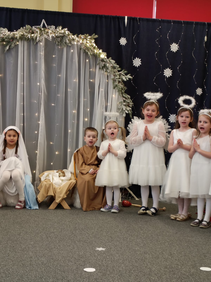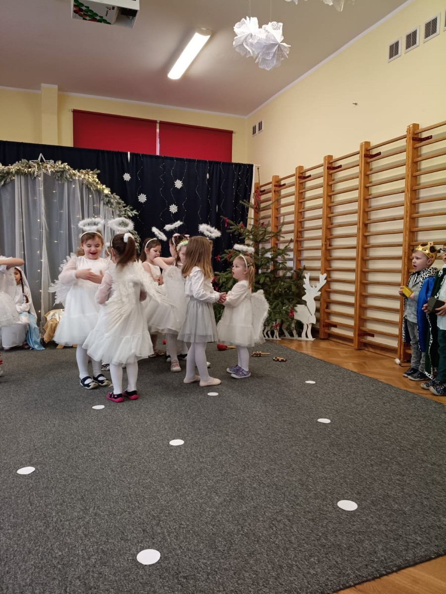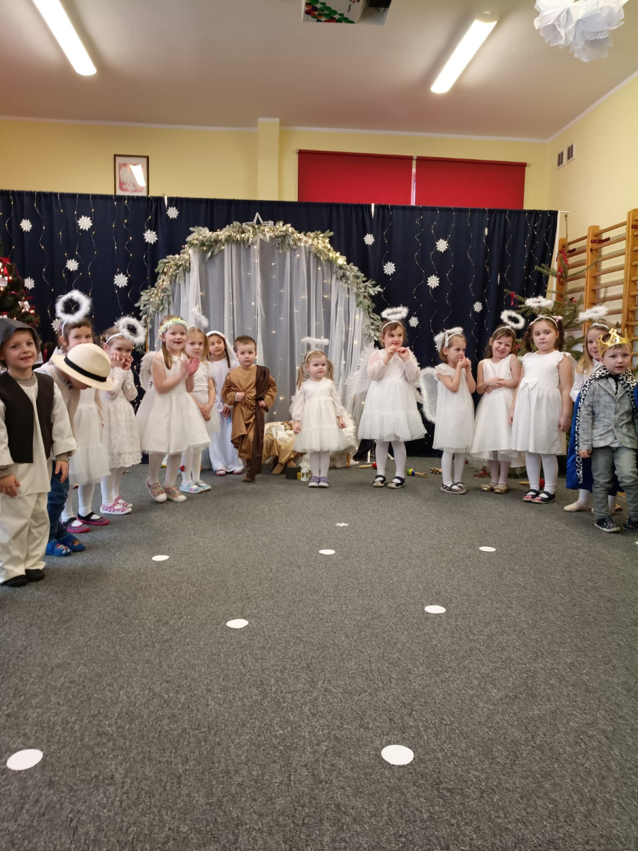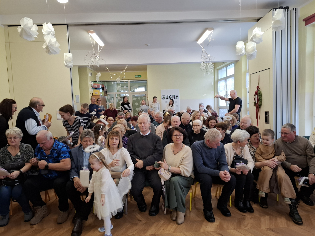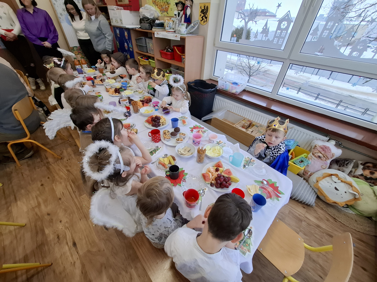 Nasi goście zjawili się punktualnie, a my zaprezentowaliśmy im nasze przedstawienie jasełkowe pt. "W stajence". Złożyliśmy też piękne życzenia drogim Babciom i miłym Dziadkom, a także zaśpiewaliśmy wesołą piosenkę. Pani Dyrektor również winszowała gościom i gratulowała im tak wspaniałych wnuków, dzięki którym możemy spotkać się właśnie w murach naszego przedszkola. Dzieci wręczyły swoim Dziadkom własnoręcznie wykonane laurki. W sali obok czekał na gości i dzieci słodki poczęstunek przygotowany przez niezawodne Mamy Misiaków.