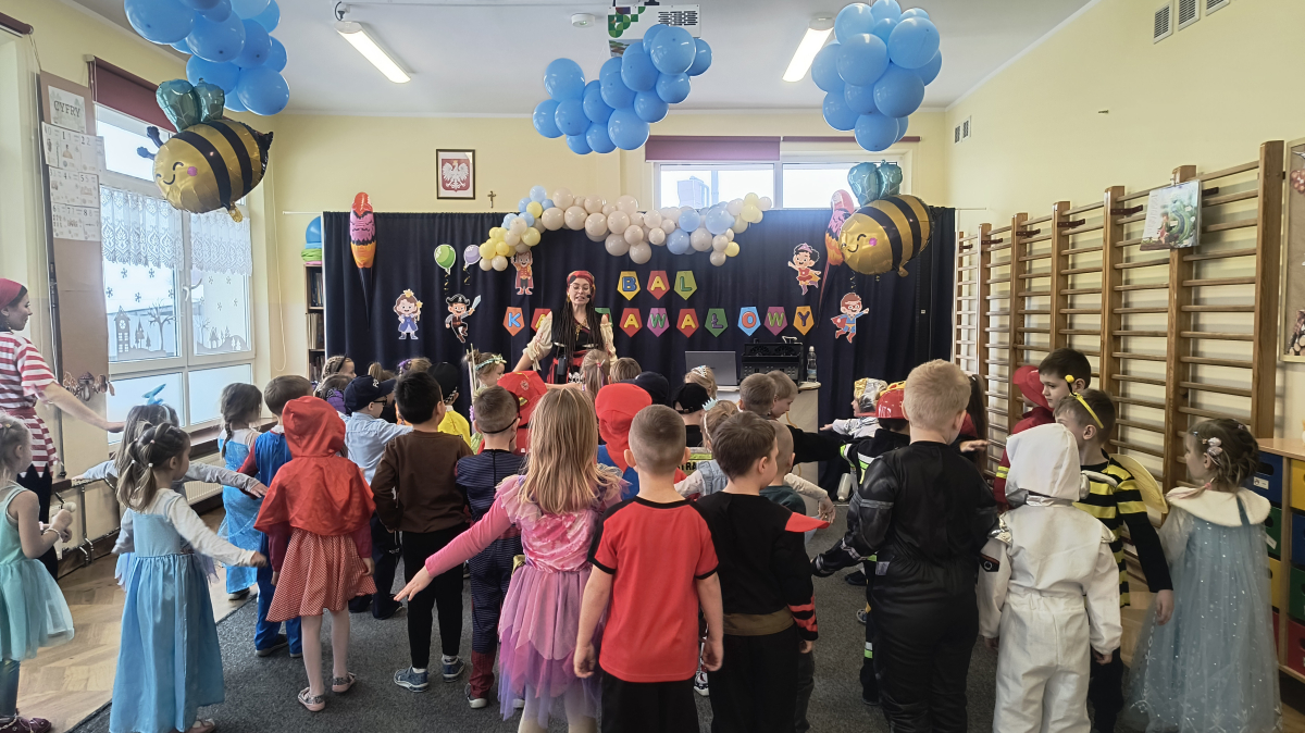 Wyjątkową atrakcją balu były animacje poprowadzone przez Panią z firmy Animacje Relacje, która przygotowała wiele ciekawych i angażujących zabaw. Wśród nich znalazło się m.in. przekazywanie „skarbu” nad głowami uczestników oraz łowienie i przerzucanie pereł do przeciwnej drużyny. Zabawy te rozwijały współpracę, sprawność ruchową i dostarczyły dzieciom mnóstwo radości. Bal Karnawałowy upłynął w wesołej, pełnej muzyki i uśmiechów atmosferze i na długo pozostanie w pamięci uczestników.