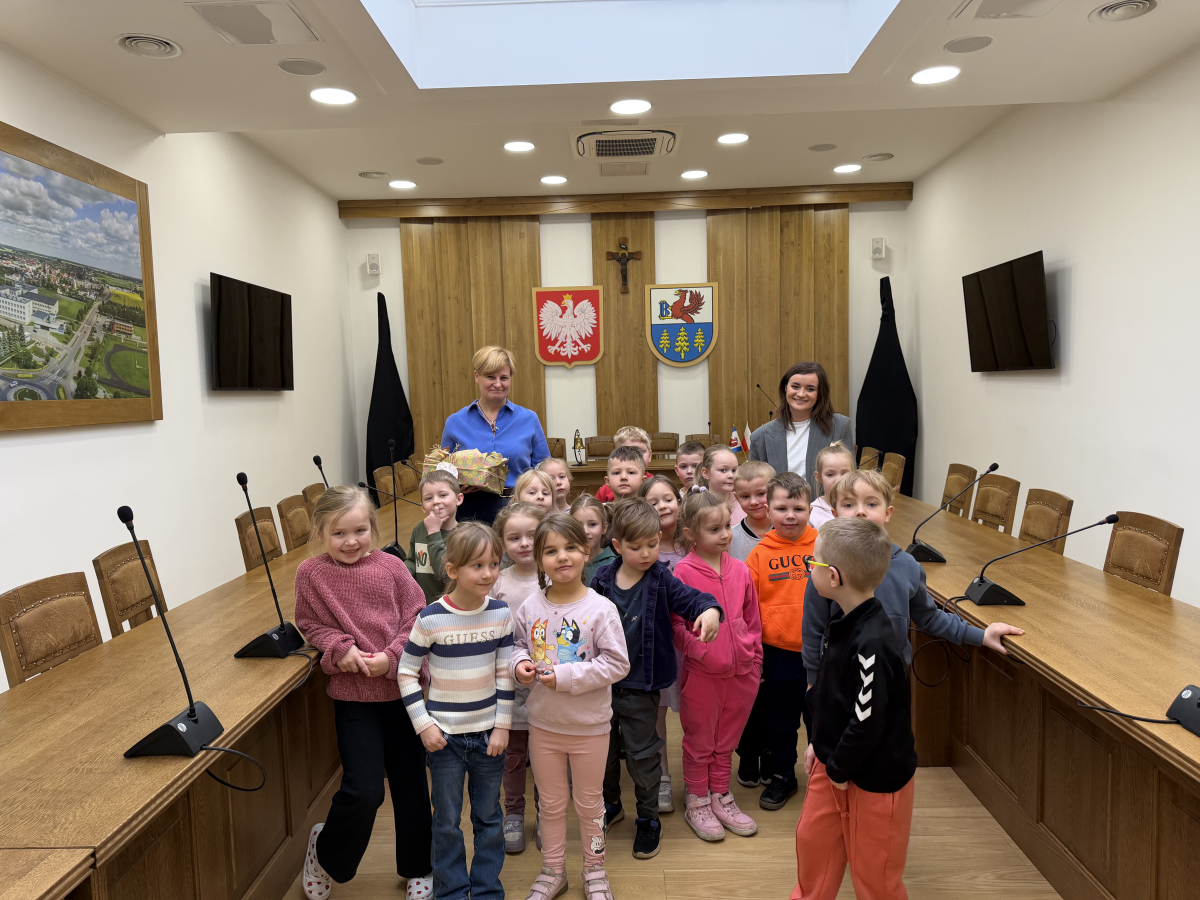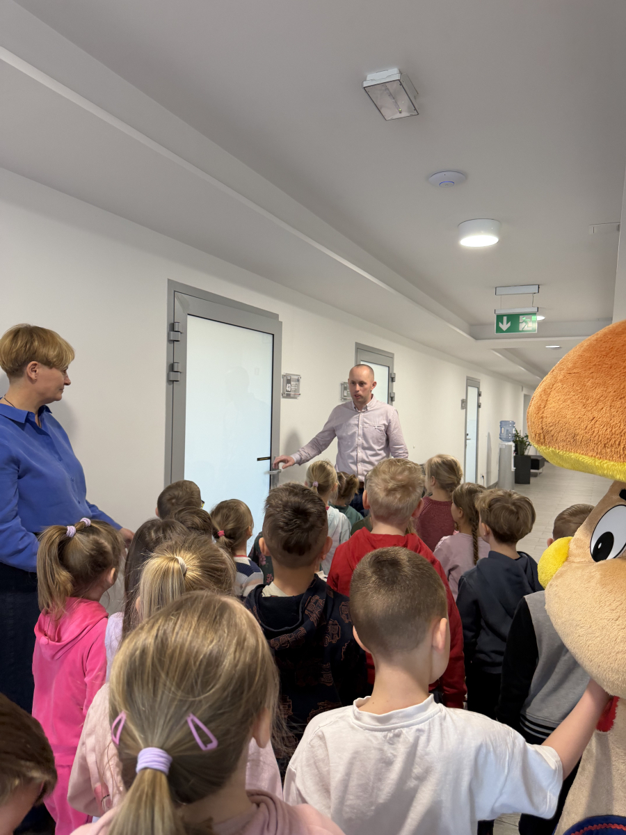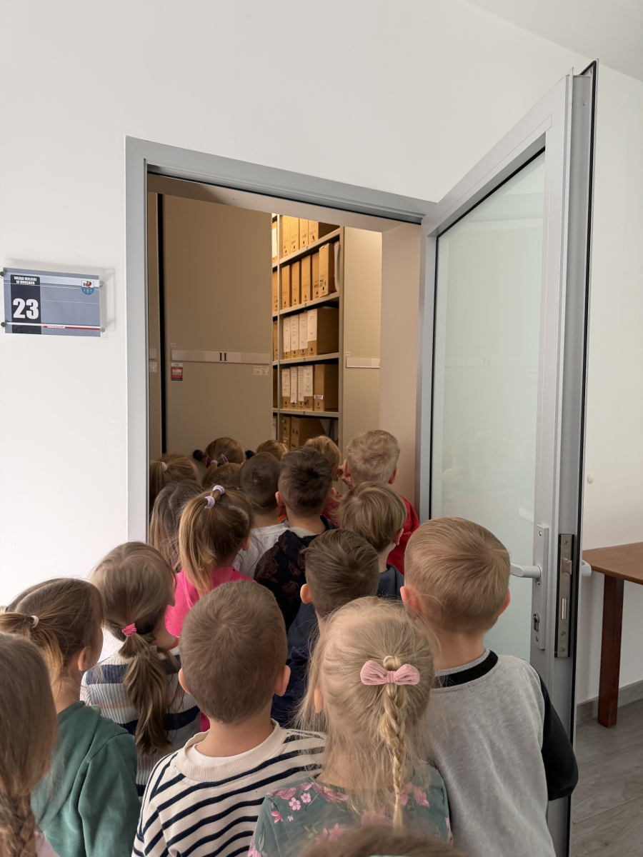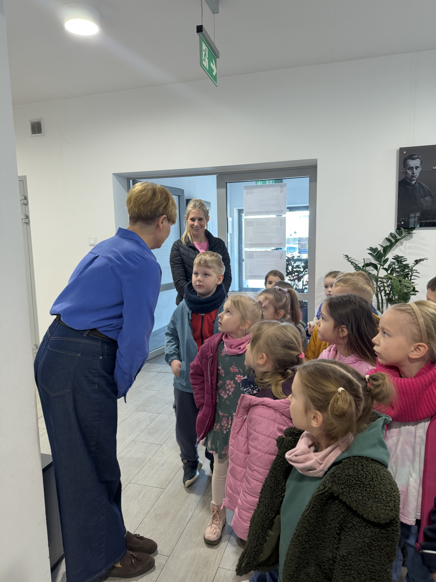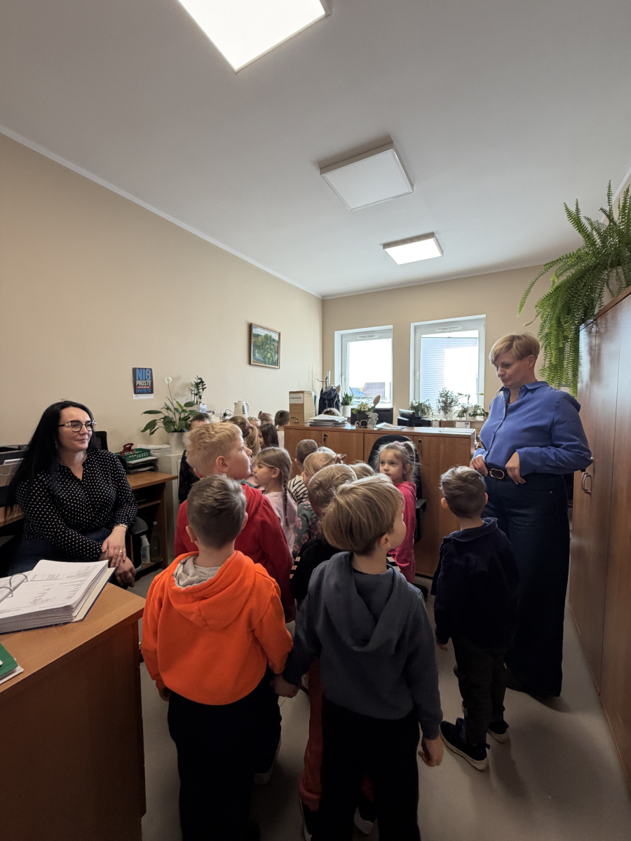 Podczas wizyty zobaczyliśmy również miejsce pracy taty Jagienki oraz zrobiliśmy pamiątkowe zdjęcia z Bruskiem. Odwiedzilimy również archiwum, gdzie mogliśmy zobaczyć jak przechowywane są dokumenty. Na zakończenie zostaliśmy obdarowani słodkościami, a w ramach podziękowania wręczyliśmy jabłka jako symbol nadchodzącej wiosny.