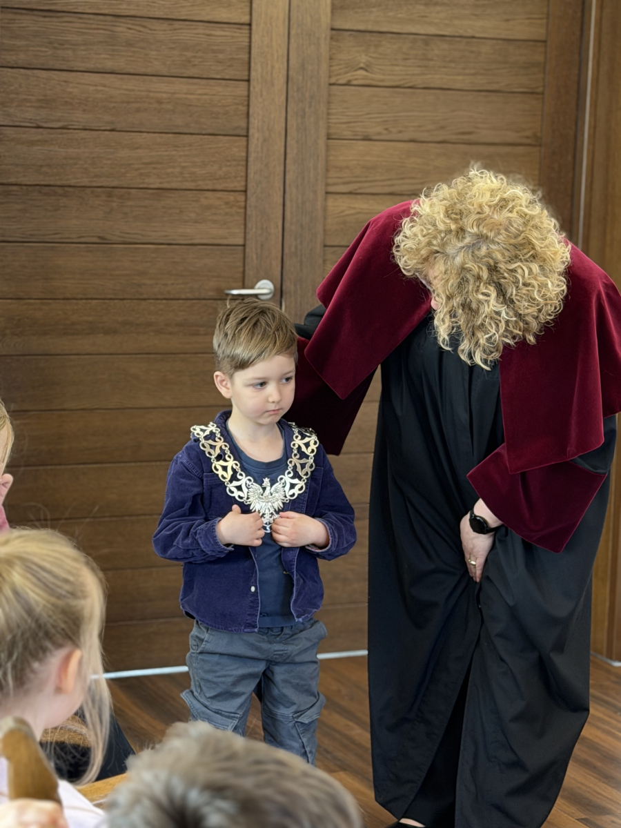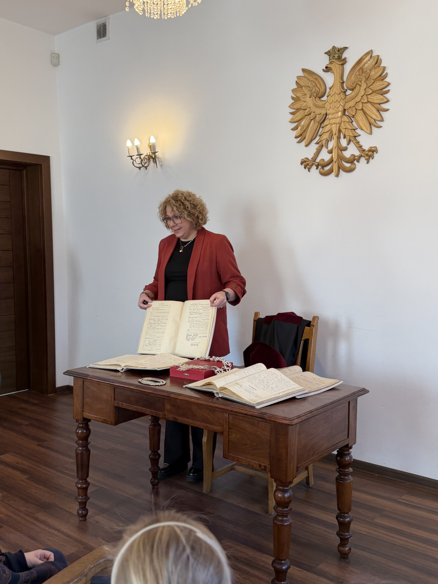 Na początku serdecznie przywitała nas Pani Mariola Rodzeń Sekretarz Gminy, która oprowadziła nas po urzędzie i w ciekawy sposób opowiedziała o jego działalności. Mieliśmy okazję usiąść na miejscach radnych, poczuć się jak podczas prawdziwej sesji oraz poznać historię ks. Jankowskiego. Zwiedziliśmy także Urząd Stanu Cywilnego, gdzie mogliśmy nawet przymierzyć uroczysty łańcuch Kierownika Urzędu Stanu Cywilnego.