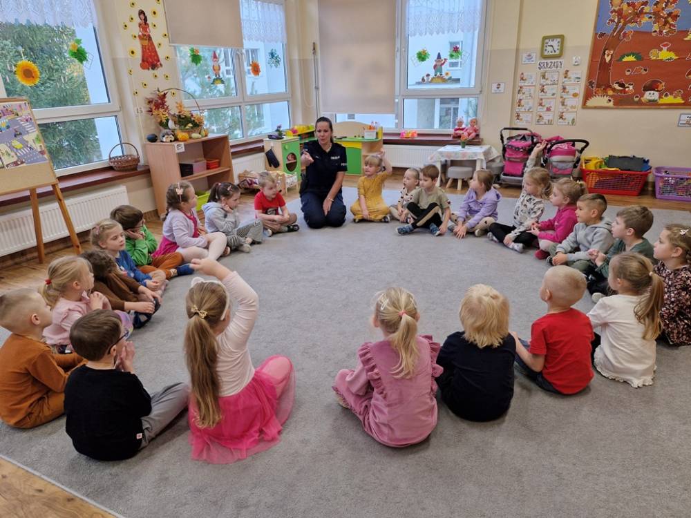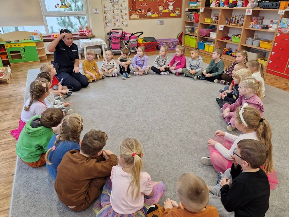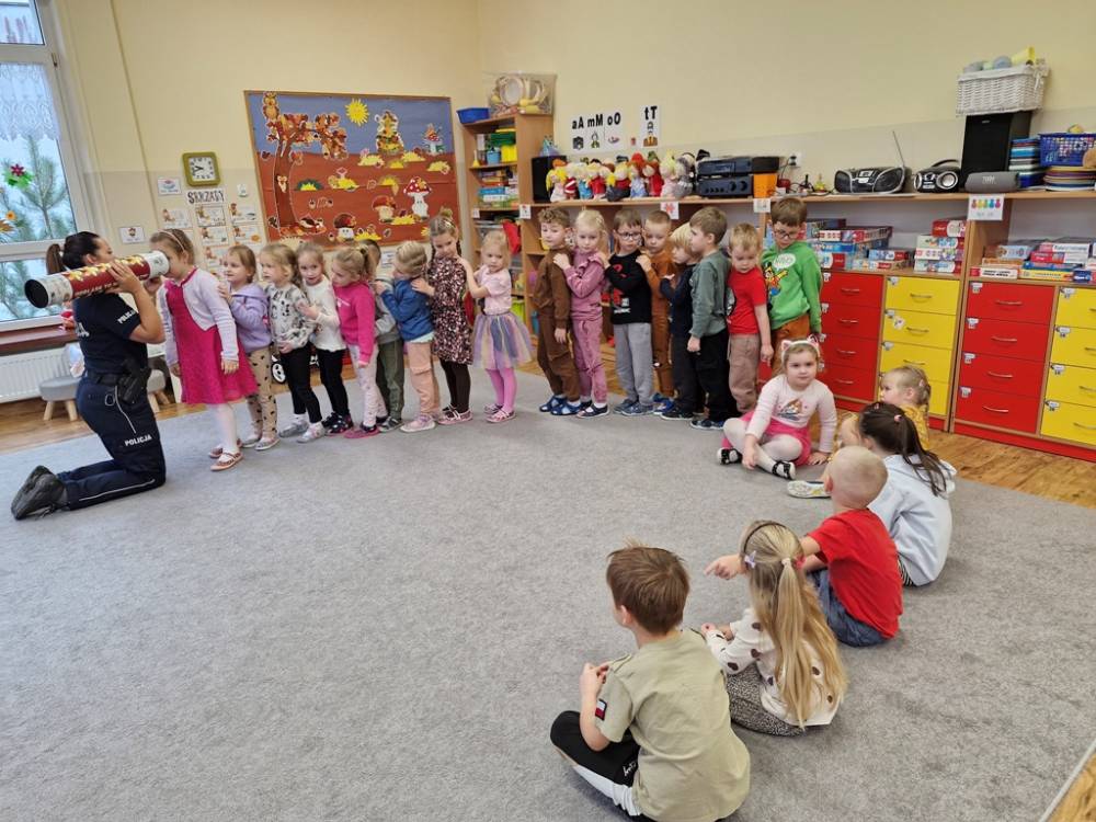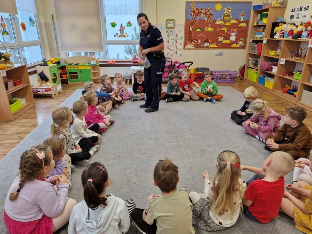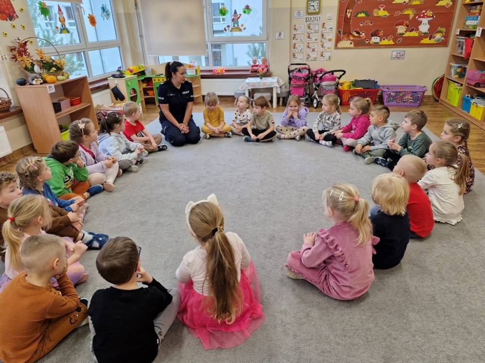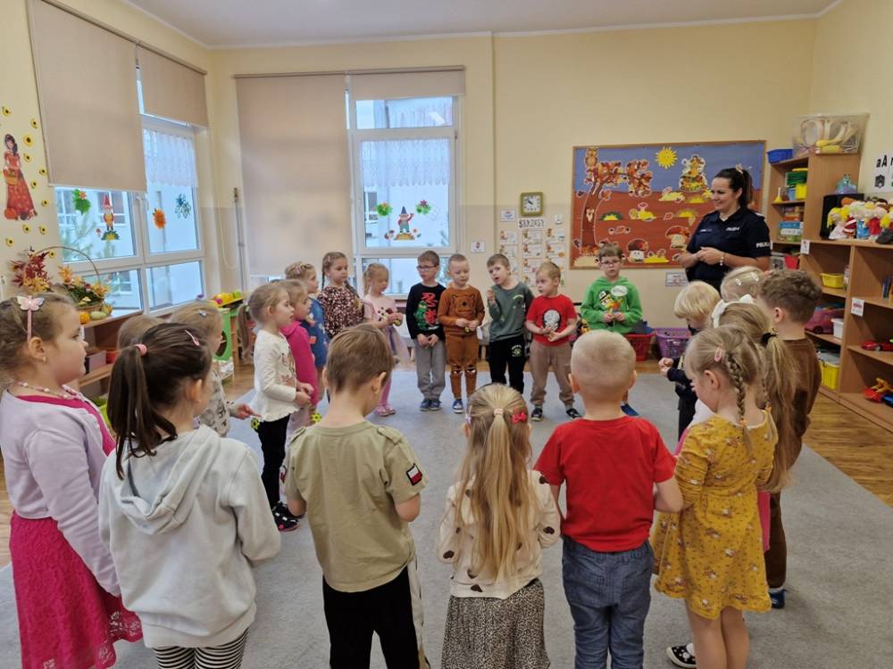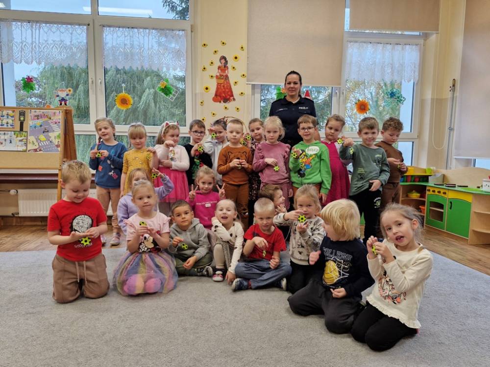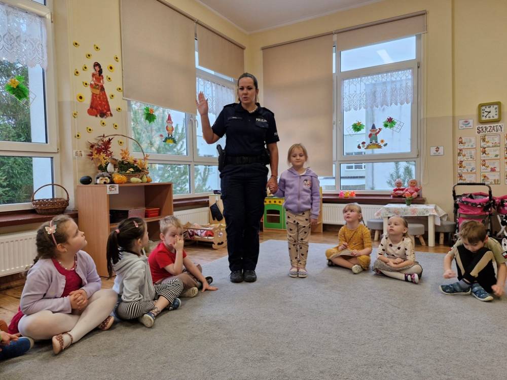 W dniu 30 października 2025 roku dzieci z grupy "Skrzaty" odwiedziła policjantka - Pani Izabela. W czasie spotkania dzieci utrwalały elementarną wiedzę o zasadach ruchu drogowego dla pieszych. Dowiedziały się o potrzebie noszenia elementów lub kamizelek odblaskowych po zapadnieciu zmroku poza obszarem zabudowanym oraz że dzieci do lat 7 poruszają się po mieście tylko pod opieką osób dorosłych. Pani policjantka również wyjaśniła dzieciom znaczenie pasów biało-czerwonych na przejściach dla pieszych znajdujących się w pobliżu przedszkola lub szkoły, a także znaczenie znaku "Agatka pomaga w bezpiecznym przechodzeniu przez jezdnię". Na zakończenie przypomniała rolę świateł na sygnalizatorze i sposób przechodzenia po pasach, gdy nie ma sygnalizacji świetlnej. Zanim dzieci rozstały się z ważnym gościem, zarecytowały wiersz "Światła sygnalizatora", dziękując Pani Izabeli za przybycie, przekazaną wiedzę i wspólnie spędzone chwile.