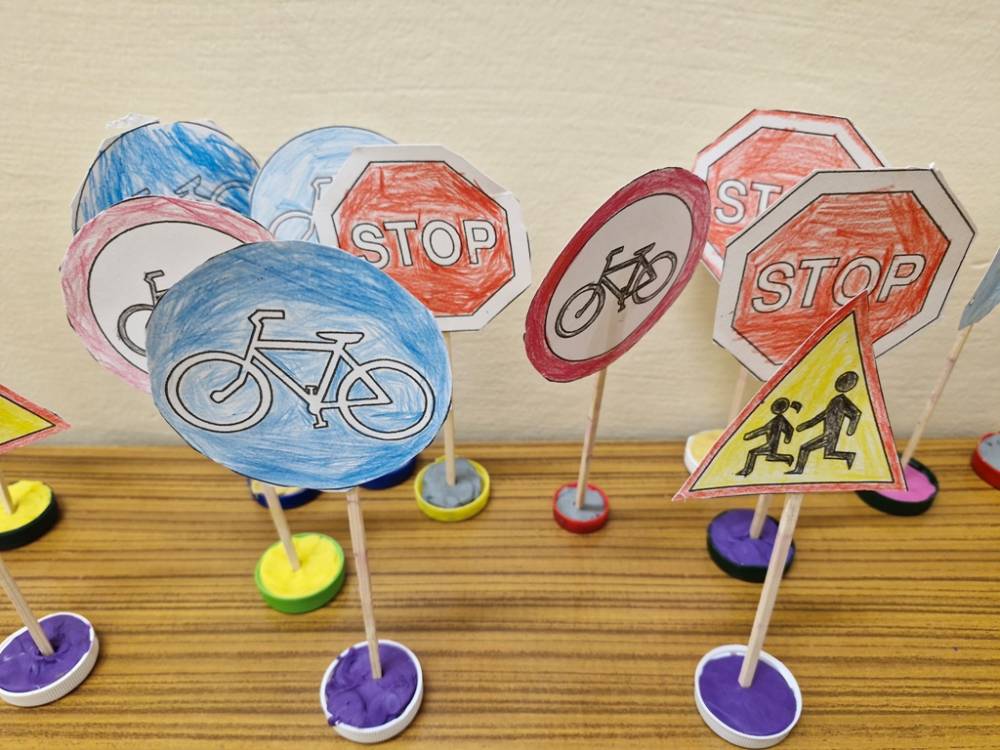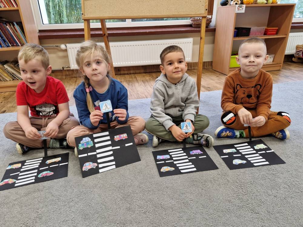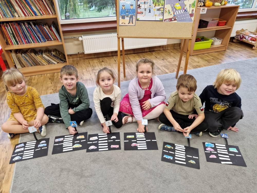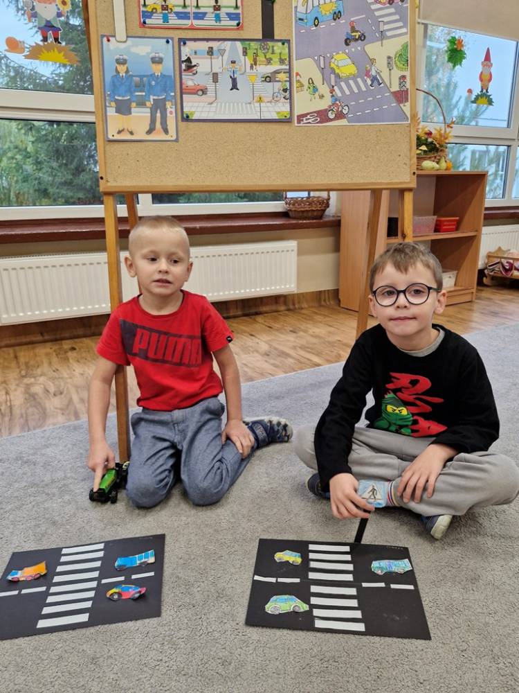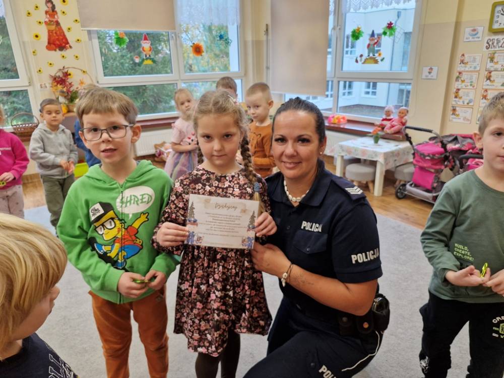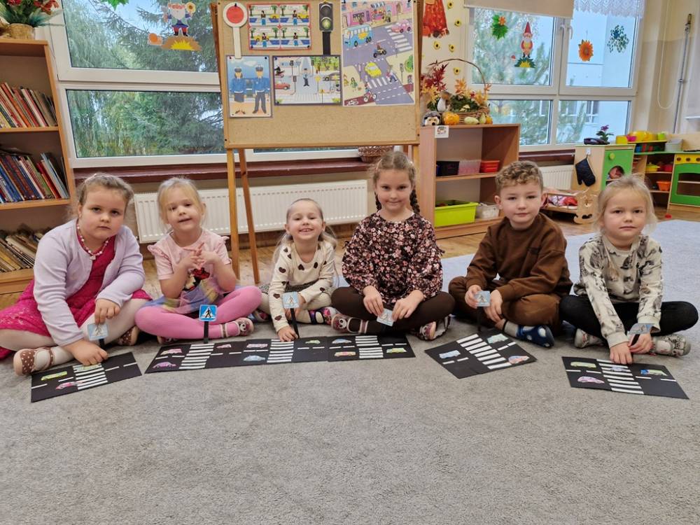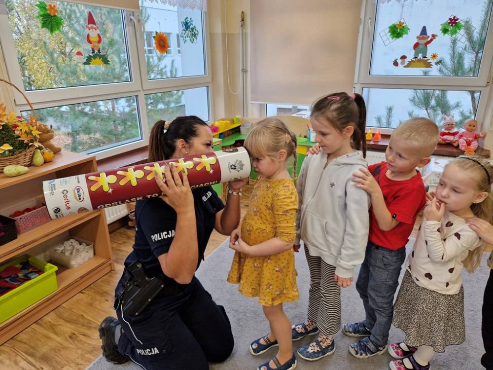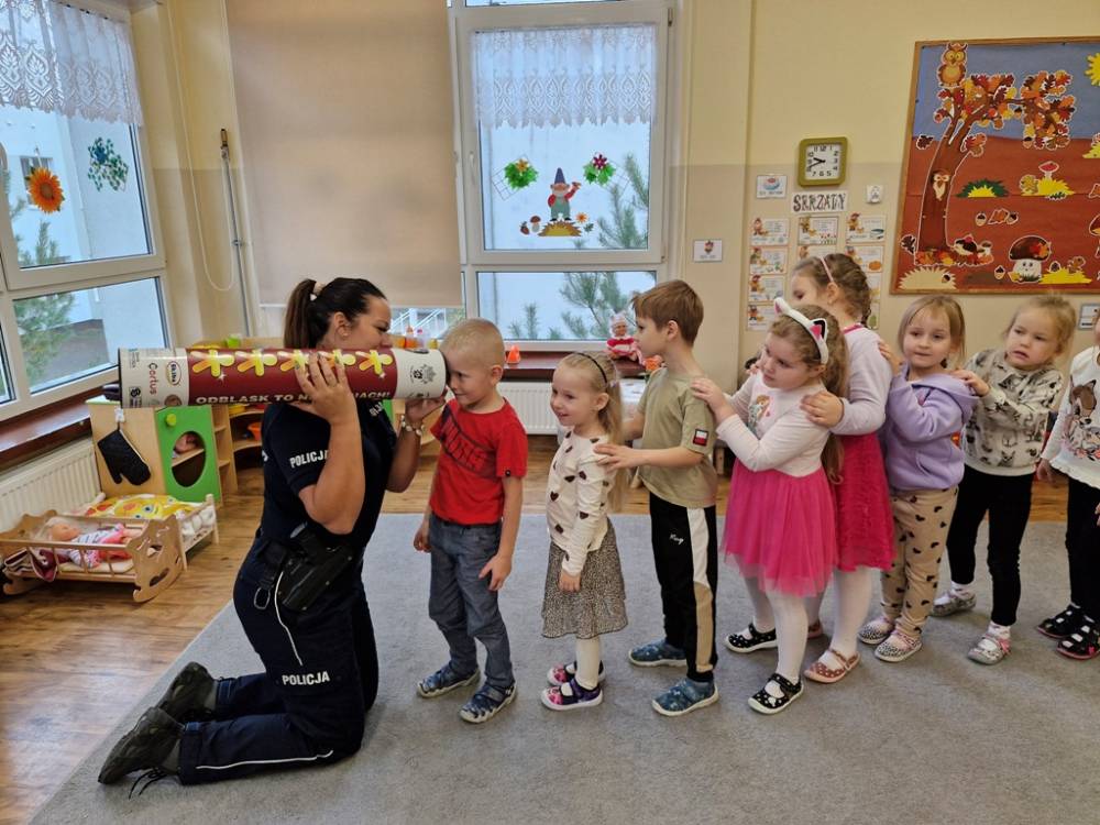 W dniu 30 października 2025 roku dzieci z grupy "Skrzaty" odwiedziła policjantka - Pani Izabela. W czasie spotkania dzieci utrwalały elementarną wiedzę o zasadach ruchu drogowego dla pieszych. Dowiedziały się o potrzebie noszenia elementów lub kamizelek odblaskowych po zapadnieciu zmroku poza obszarem zabudowanym oraz że dzieci do lat 7 poruszają się po mieście tylko pod opieką osób dorosłych. Pani policjantka również wyjaśniła dzieciom znaczenie pasów biało-czerwonych na przejściach dla pieszych znajdujących się w pobliżu przedszkola lub szkoły, a także znaczenie znaku "Agatka pomaga w bezpiecznym przechodzeniu przez jezdnię". Na zakończenie przypomniała rolę świateł na sygnalizatorze i sposób przechodzenia po pasach, gdy nie ma sygnalizacji świetlnej. Zanim dzieci rozstały się z ważnym gościem, zarecytowały wiersz "Światła sygnalizatora", dziękując Pani Izabeli za przybycie, przekazaną wiedzę i wspólnie spędzone chwile.