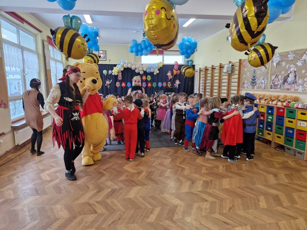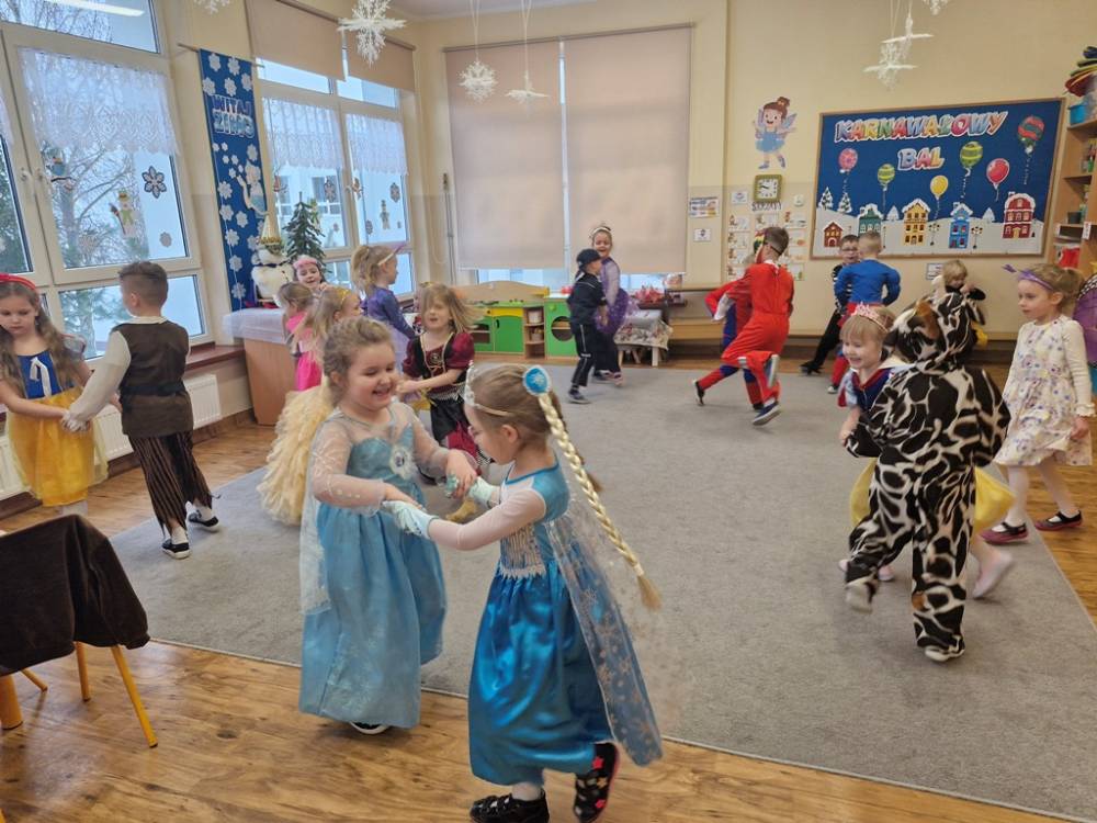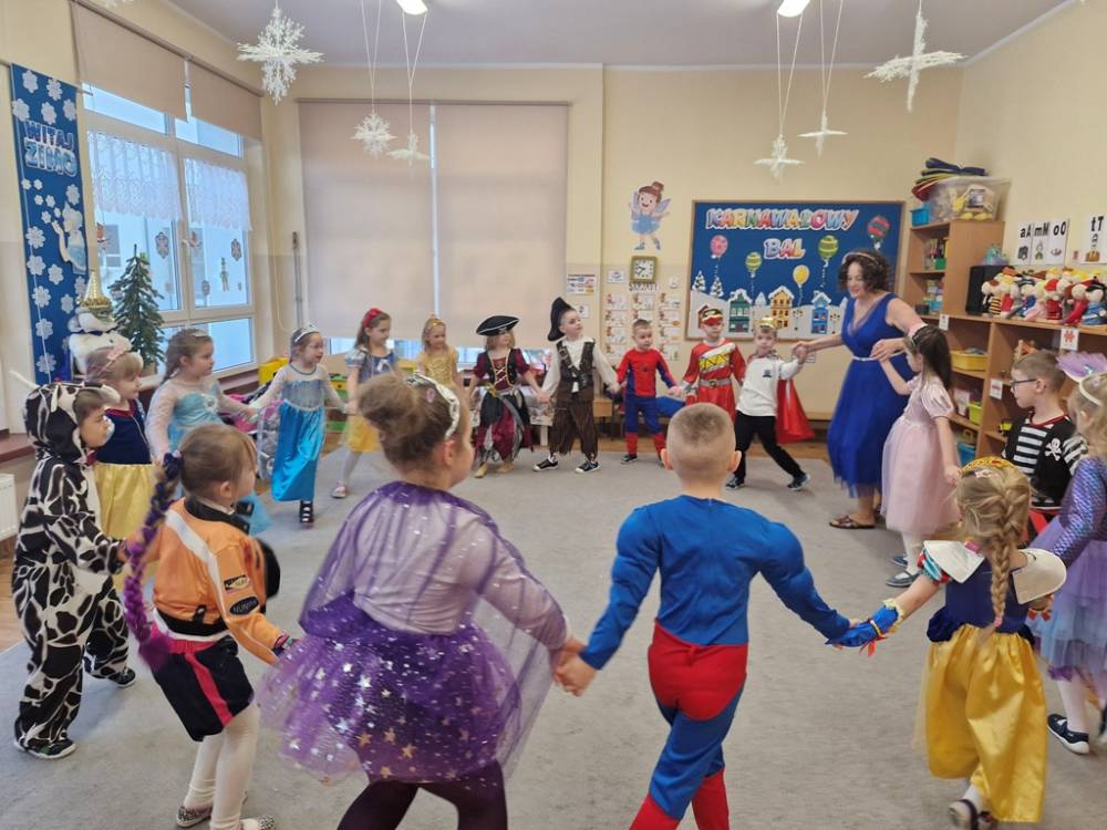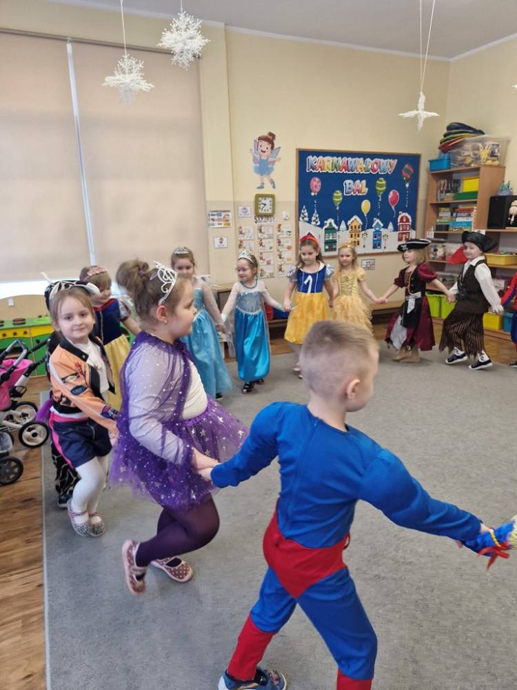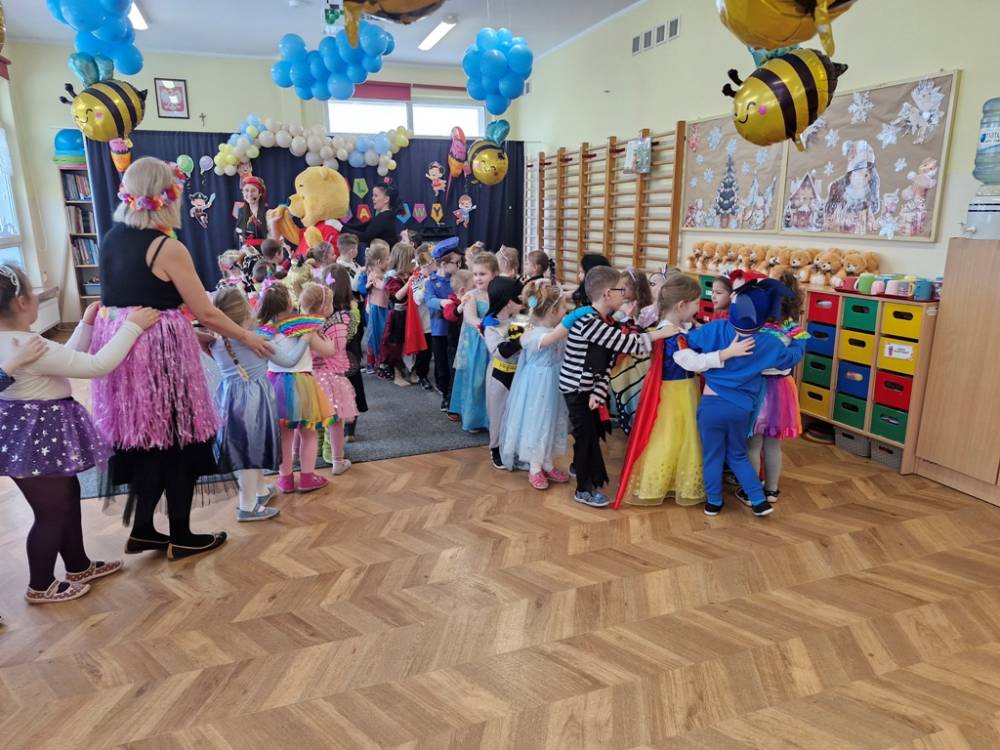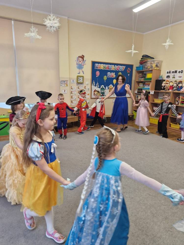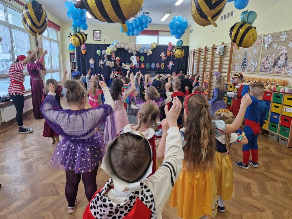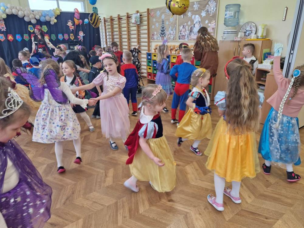 W czwartek, tj. 5 lutego 2026 roku w przedszkolu odbył się bal karnawałowy, na który dzieci czekały z utęsknieniem. Panie dołożyły wszelkich starań, by wystrój przedszkola wprowadził przedszkolaków w radosny nastrój i zachęcał do wspólnych zabaw. Od samego rana do sali przedszkolnej wchodziły dzieci przebrane za postaci z różnych bajek, a motywem przewodnim tegorocznego balu byli bohaterowie bajek Walta Disneya. Można było zobaczyć: Królewnę Śnieżkę, Elsę z Krainy Lodu, Bellę, motyla, piratów itd. Panie animatorki z firmy Animacje Rewelacje zadbały o wspaniałą atmosferę karnawałową i wspólnie bawiły się przy rytmach piosenek dziecięcych i znanych przebojów muzyczych. Zabawę karnawałową uatrakcyjniły wspólne zabawy przy muzyce z elementem współzawodnictwa. Dzieci szukały skarbu, rzucały "nieprawdziwymi" perłami, chwytały bańki mydlane, a także bawiły się z Kubusiem Puchatkiem, który był gościem honorowym balu. Zabawę karnawałową dzieci kontynuowały w sali przedszkolnej, gdzie tańczyły i pląsały przy piosenkach dziecięcych, a także uczestniczyły w zabawach pry muzyce. Był taniec z balonem, taniec na gazecie i zabawa "Nie baw się zapałkami". Podczas przerwy na dzieci czekał słodko-owocowy poczęstunek przygotowany przez mamy. Bal przebierańców przyniół dzieciom wiele radości, a piękne chwile zostały uwieńczone na wspólnych zdjeciach. Dzieci serdecznie dziękują rodzicom za przygotowanie przebrań karnawalowych, a w szczególności mamom: Mai i Krysi za przygotowanie poczęstunku.