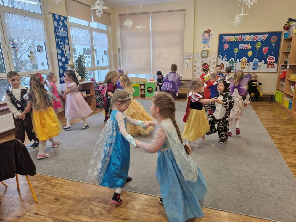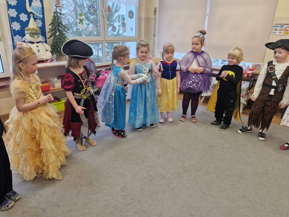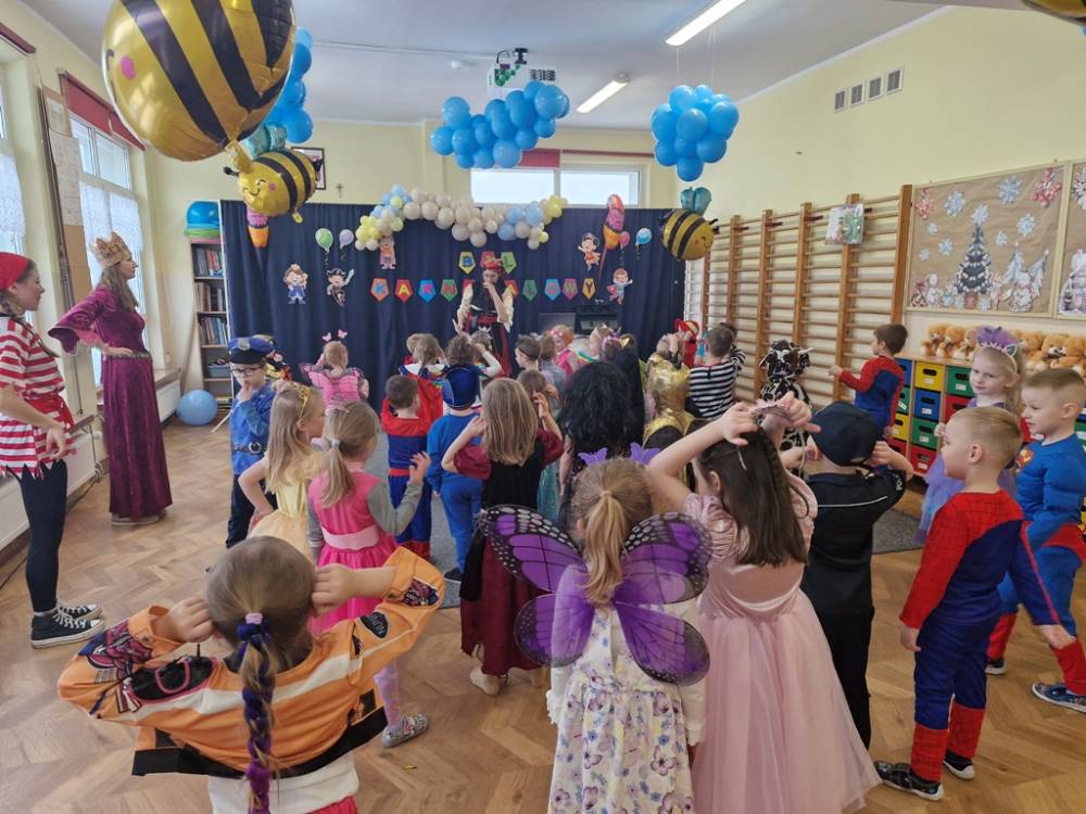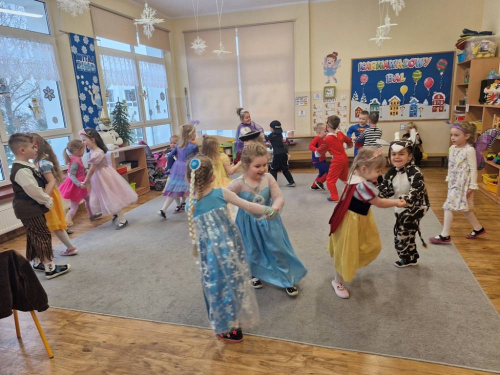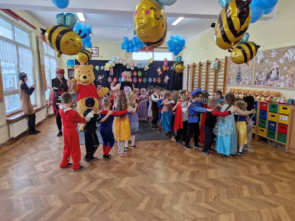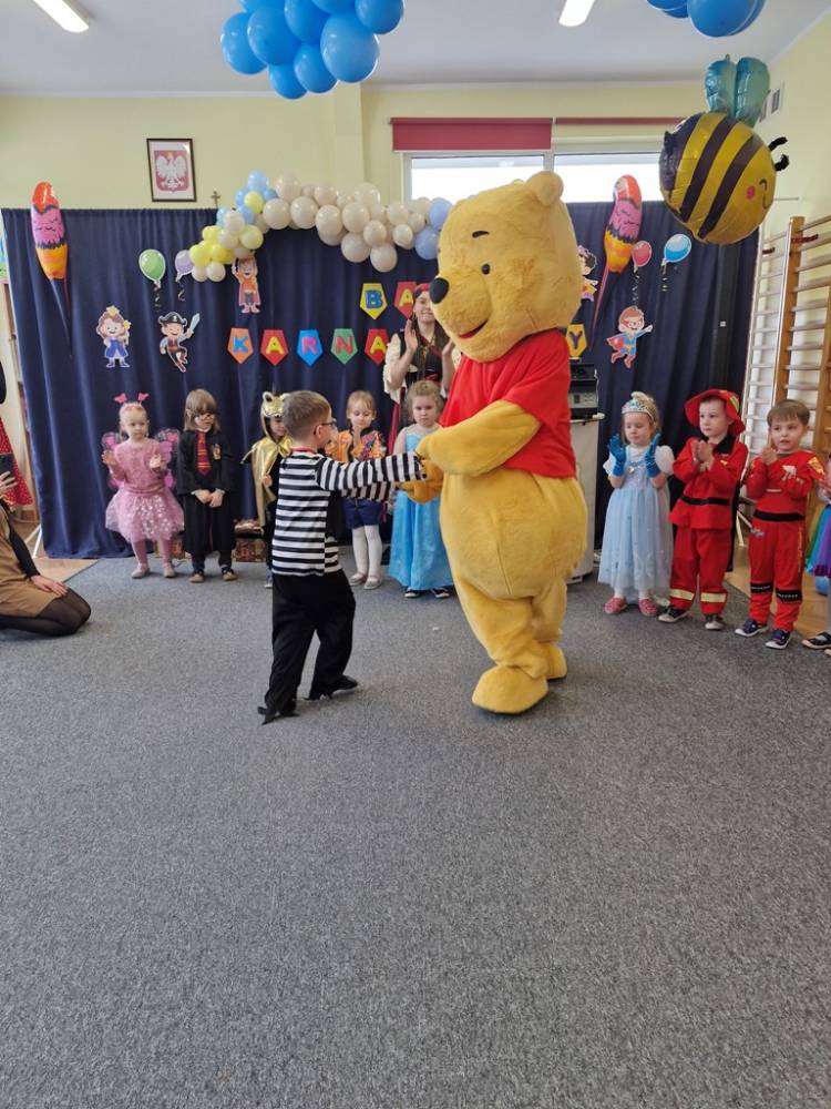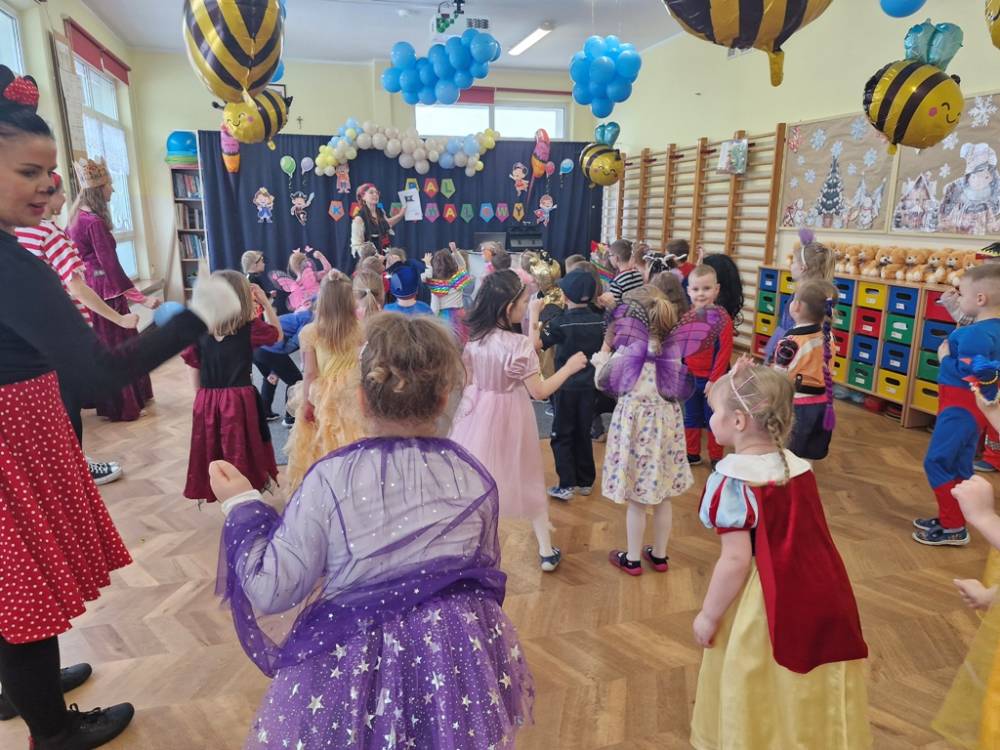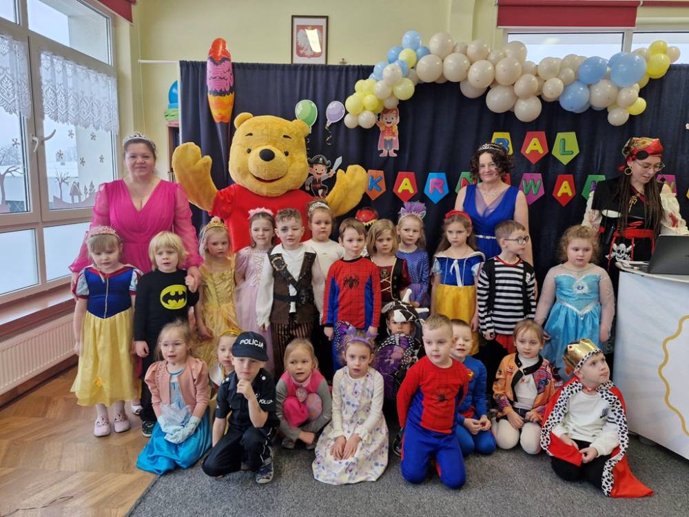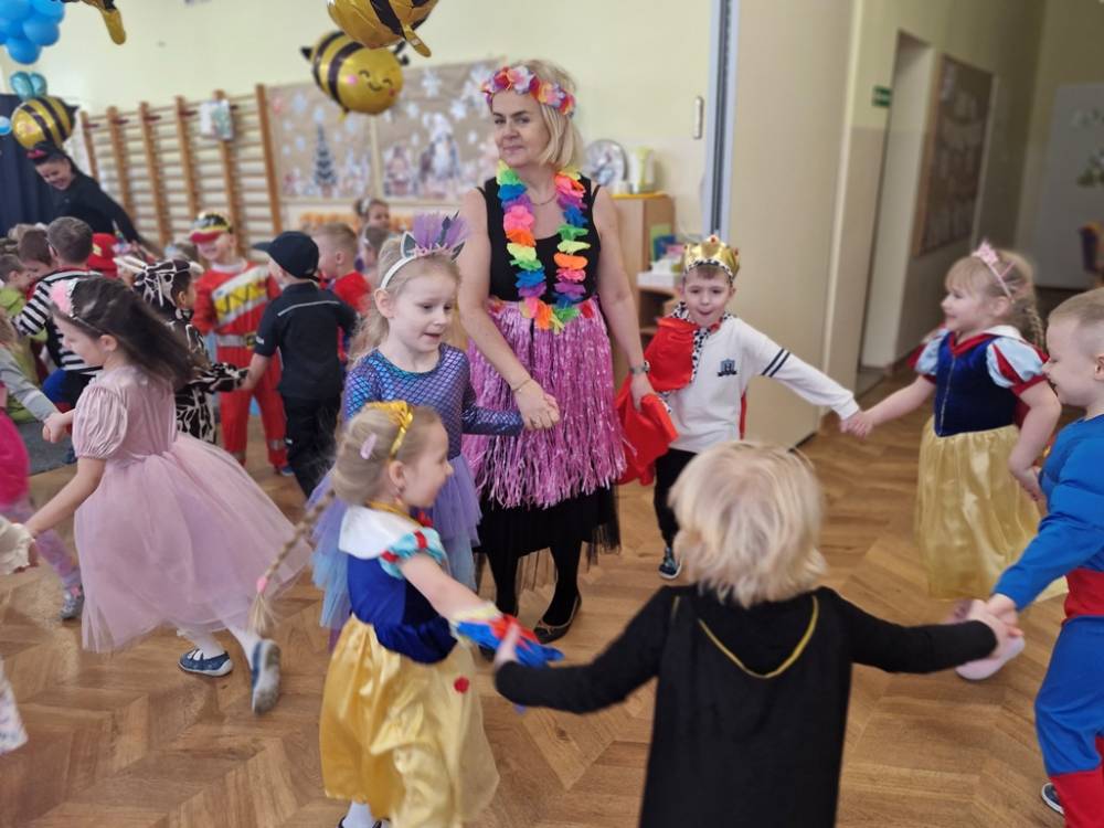 W czwartek, tj. 5 lutego 2026 roku w przedszkolu odbył się bal karnawałowy, na który dzieci czekały z utęsknieniem. Panie dołożyły wszelkich starań, by wystrój przedszkola wprowadził przedszkolaków w radosny nastrój i zachęcał do wspólnych zabaw. Od samego rana do sali przedszkolnej wchodziły dzieci przebrane za postaci z różnych bajek, a motywem przewodnim tegorocznego balu byli bohaterowie bajek Walta Disneya. Można było zobaczyć: Królewnę Śnieżkę, Elsę z Krainy Lodu, Bellę, motyla, piratów itd. Panie animatorki z firmy Animacje Rewelacje zadbały o wspaniałą atmosferę karnawałową i wspólnie bawiły się przy rytmach piosenek dziecięcych i znanych przebojów muzyczych. Zabawę karnawałową uatrakcyjniły wspólne zabawy przy muzyce z elementem współzawodnictwa. Dzieci szukały skarbu, rzucały "nieprawdziwymi" perłami, chwytały bańki mydlane, a także bawiły się z Kubusiem Puchatkiem, który był gościem honorowym balu. Zabawę karnawałową dzieci kontynuowały w sali przedszkolnej, gdzie tańczyły i pląsały przy piosenkach dziecięcych, a także uczestniczyły w zabawach pry muzyce. Był taniec z balonem, taniec na gazecie i zabawa "Nie baw się zapałkami". Podczas przerwy na dzieci czekał słodko-owocowy poczęstunek przygotowany przez mamy. Bal przebierańców przyniół dzieciom wiele radości, a piękne chwile zostały uwieńczone na wspólnych zdjeciach. Dzieci serdecznie dziękują rodzicom za przygotowanie przebrań karnawalowych, a w szczególności mamom: Mai i Krysi za przygotowanie poczęstunku.