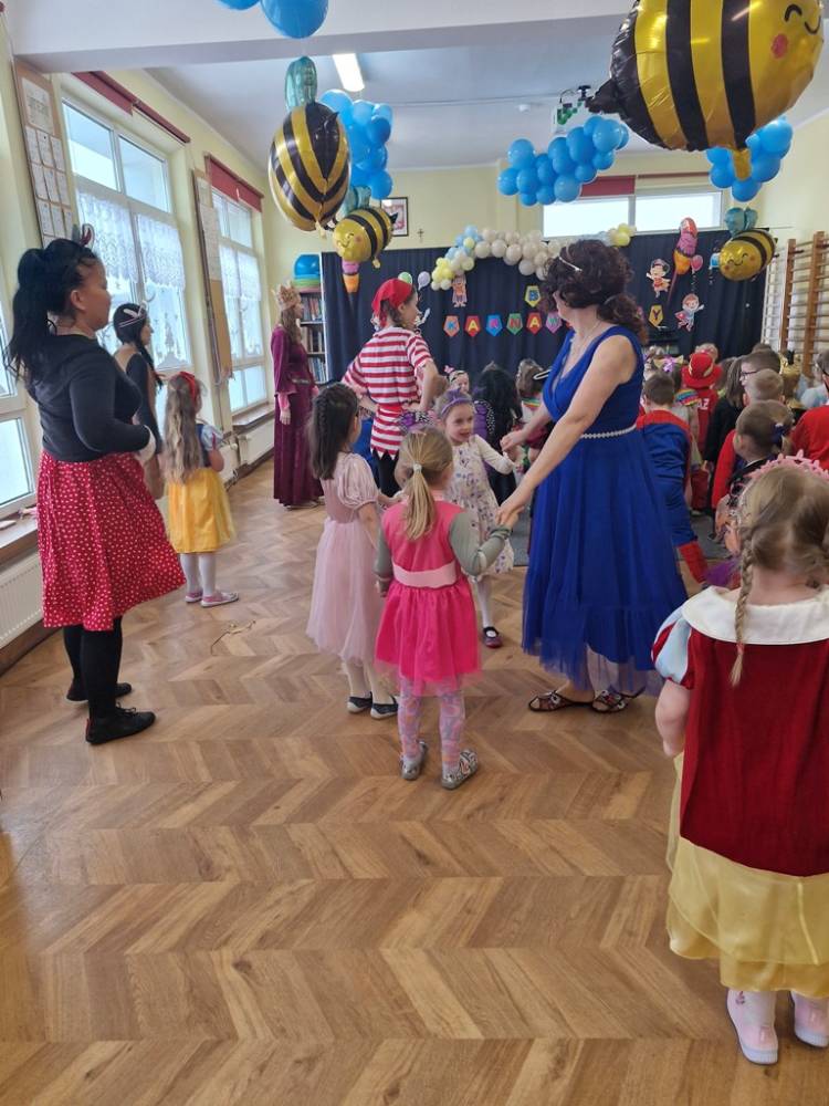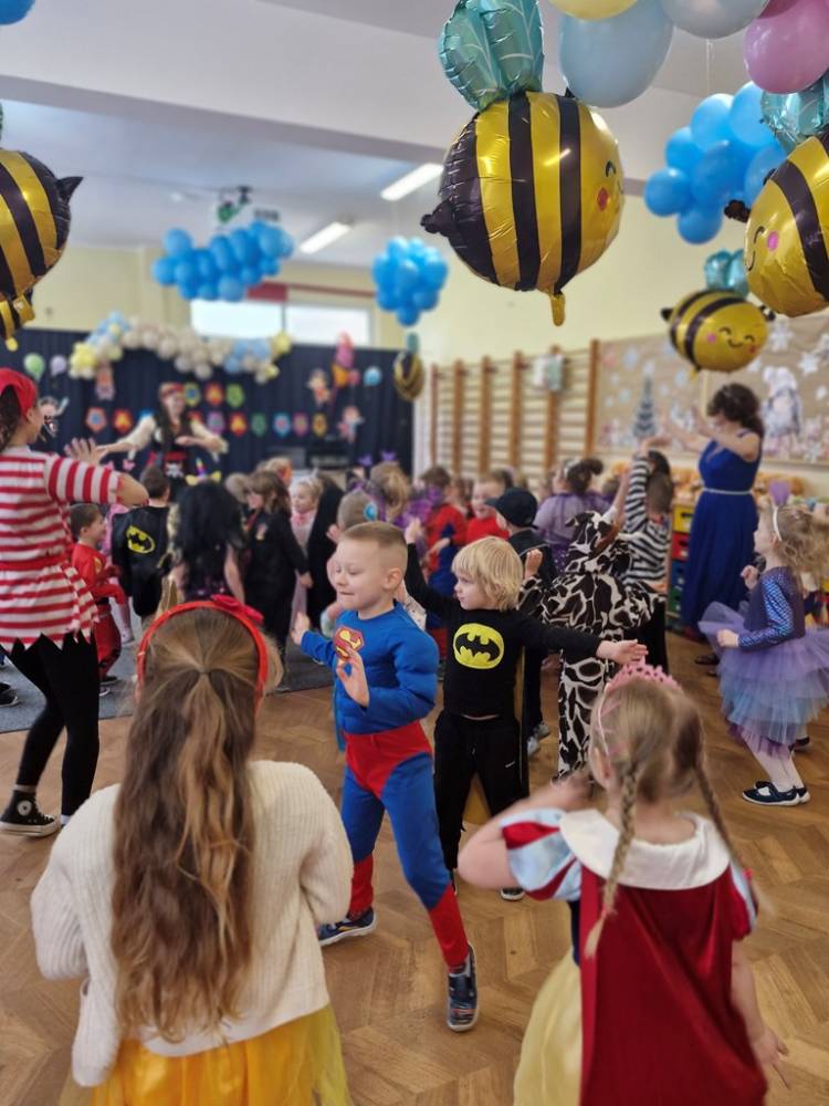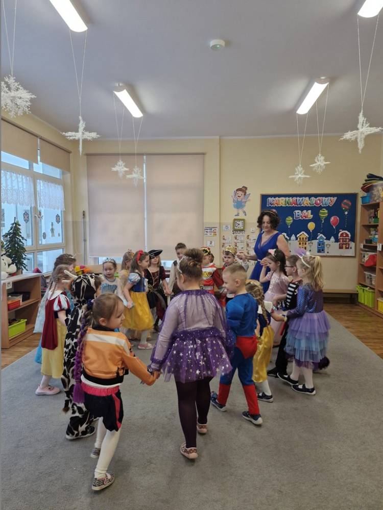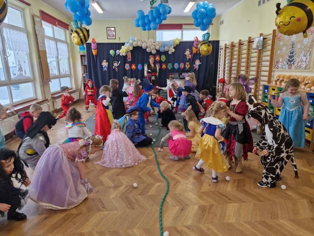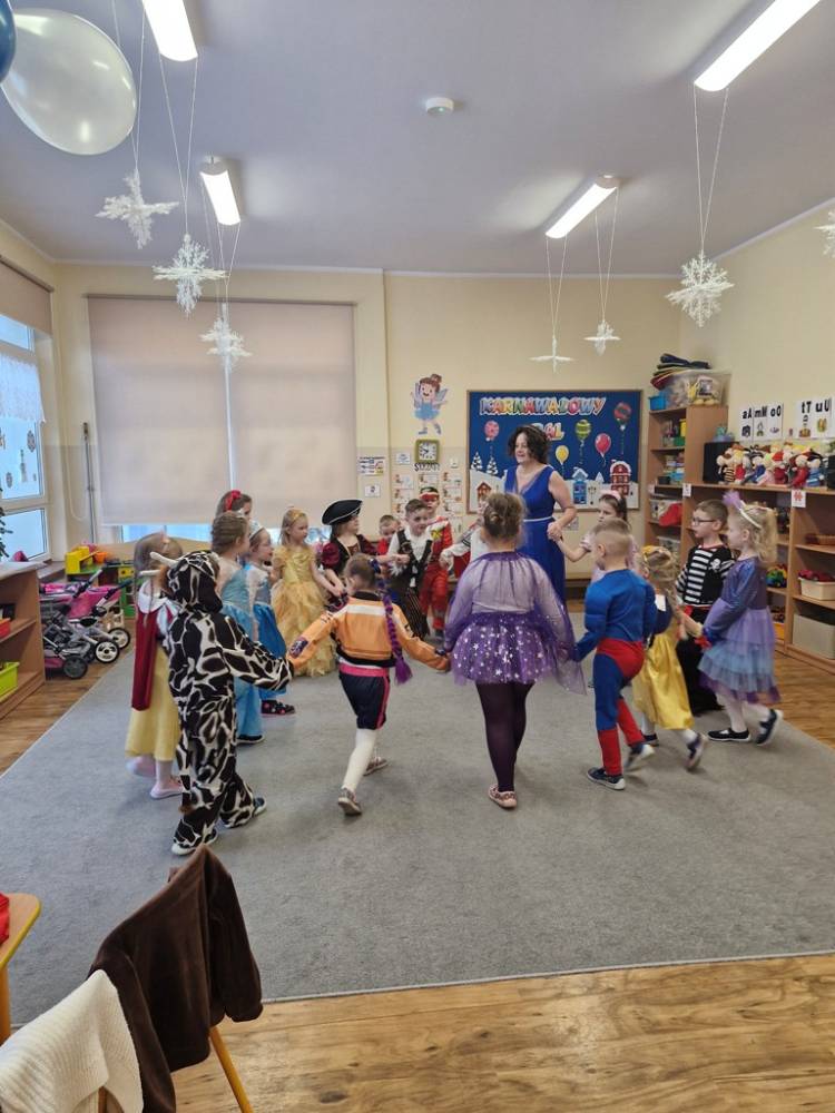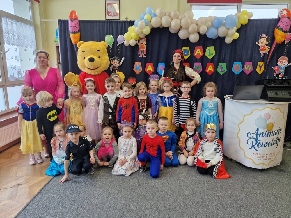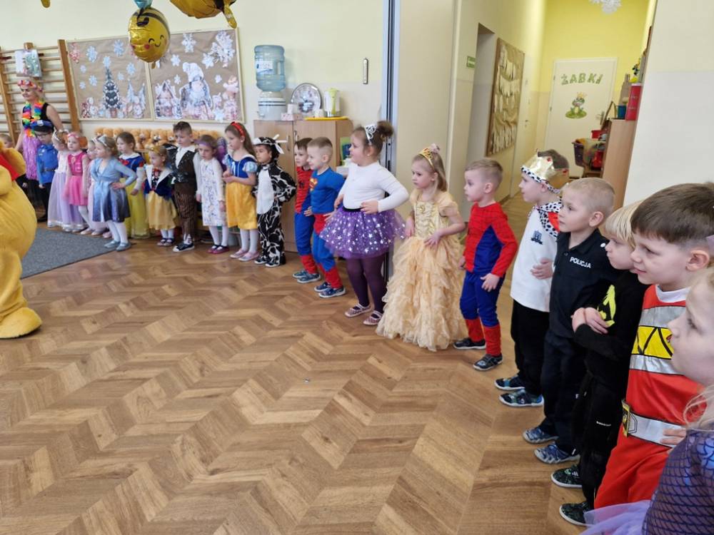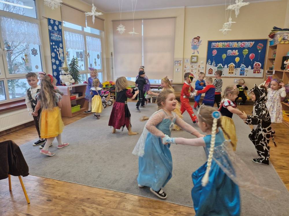 W czwartek, tj. 5 lutego 2026 roku w przedszkolu odbył się bal karnawałowy, na który dzieci czekały z utęsknieniem. Panie dołożyły wszelkich starań, by wystrój przedszkola wprowadził przedszkolaków w radosny nastrój i zachęcał do wspólnych zabaw. Od samego rana do sali przedszkolnej wchodziły dzieci przebrane za postaci z różnych bajek, a motywem przewodnim tegorocznego balu byli bohaterowie bajek Walta Disneya. Można było zobaczyć: Królewnę Śnieżkę, Elsę z Krainy Lodu, Bellę, motyla, piratów itd. Panie animatorki z firmy Animacje Rewelacje zadbały o wspaniałą atmosferę karnawałową i wspólnie bawiły się przy rytmach piosenek dziecięcych i znanych przebojów muzyczych. Zabawę karnawałową uatrakcyjniły wspólne zabawy przy muzyce z elementem współzawodnictwa. Dzieci szukały skarbu, rzucały "nieprawdziwymi" perłami, chwytały bańki mydlane, a także bawiły się z Kubusiem Puchatkiem, który był gościem honorowym balu. Zabawę karnawałową dzieci kontynuowały w sali przedszkolnej, gdzie tańczyły i pląsały przy piosenkach dziecięcych, a także uczestniczyły w zabawach pry muzyce. Był taniec z balonem, taniec na gazecie i zabawa "Nie baw się zapałkami". Podczas przerwy na dzieci czekał słodko-owocowy poczęstunek przygotowany przez mamy. Bal przebierańców przyniół dzieciom wiele radości, a piękne chwile zostały uwieńczone na wspólnych zdjeciach. Dzieci serdecznie dziękują rodzicom za przygotowanie przebrań karnawalowych, a w szczególności mamom: Mai i Krysi za przygotowanie poczęstunku.