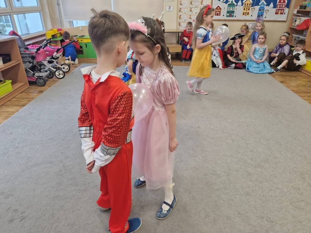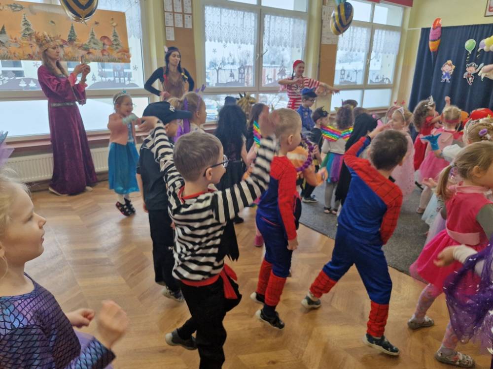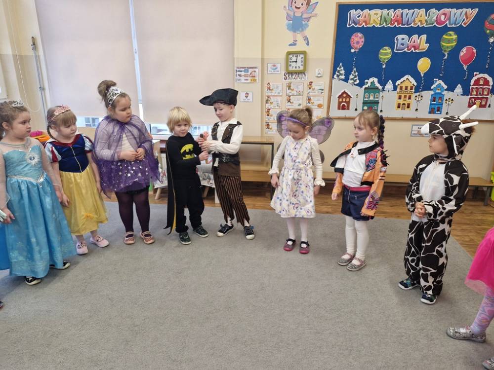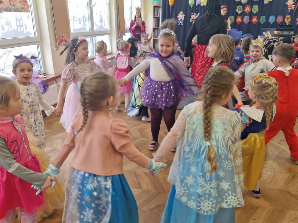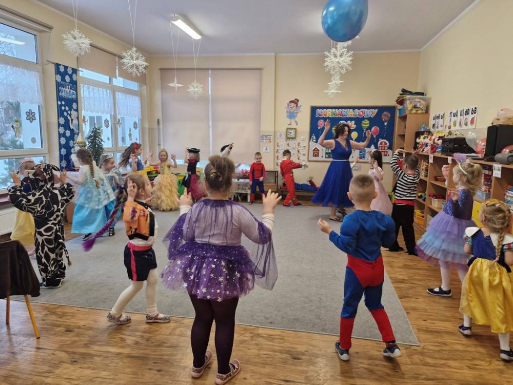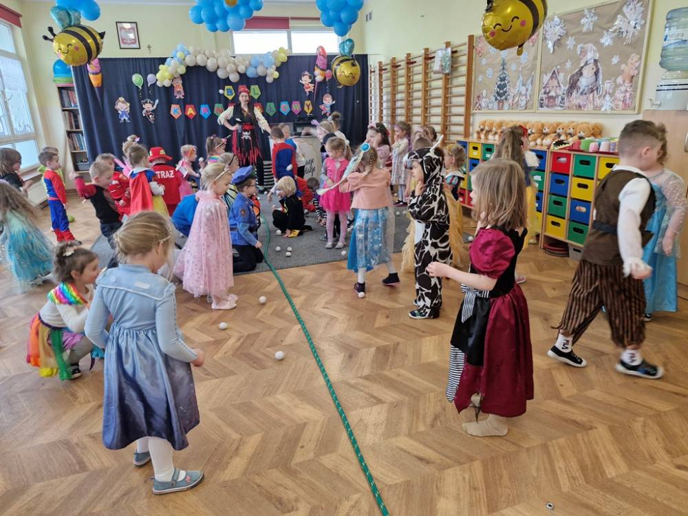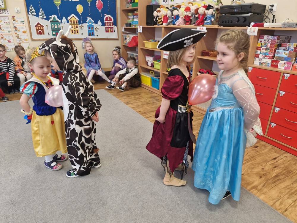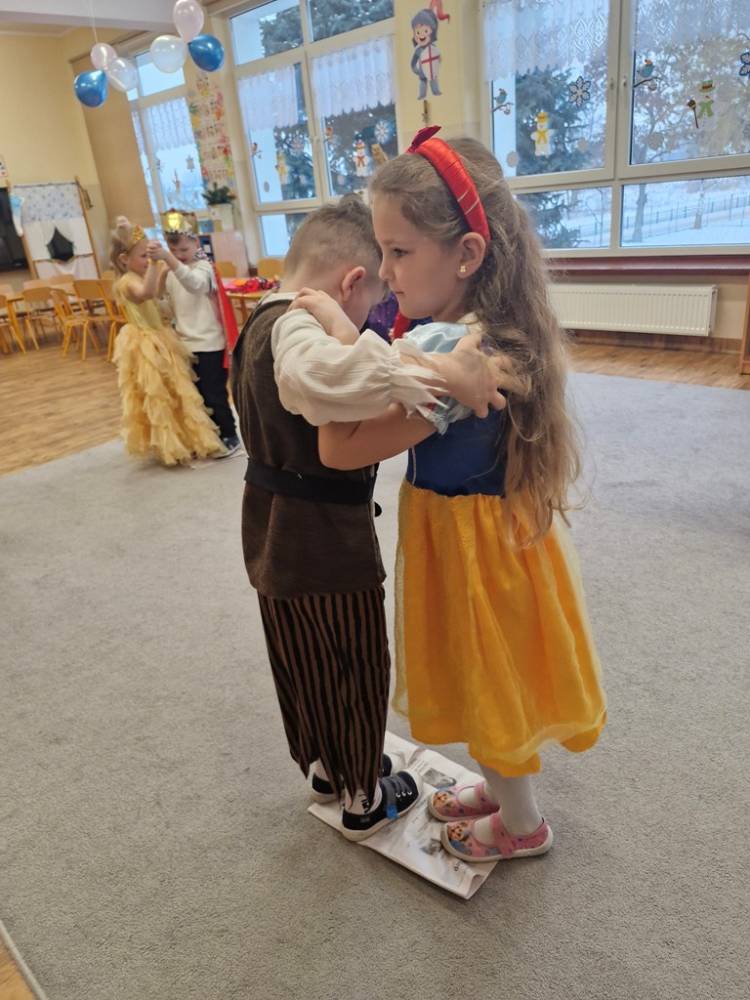 W czwartek, tj. 5 lutego 2026 roku w przedszkolu odbył się bal karnawałowy, na który dzieci czekały z utęsknieniem. Panie dołożyły wszelkich starań, by wystrój przedszkola wprowadził przedszkolaków w radosny nastrój i zachęcał do wspólnych zabaw. Od samego rana do sali przedszkolnej wchodziły dzieci przebrane za postaci z różnych bajek, a motywem przewodnim tegorocznego balu byli bohaterowie bajek Walta Disneya. Można było zobaczyć: Królewnę Śnieżkę, Elsę z Krainy Lodu, Bellę, motyla, piratów itd. Panie animatorki z firmy Animacje Rewelacje zadbały o wspaniałą atmosferę karnawałową i wspólnie bawiły się przy rytmach piosenek dziecięcych i znanych przebojów muzyczych. Zabawę karnawałową uatrakcyjniły wspólne zabawy przy muzyce z elementem współzawodnictwa. Dzieci szukały skarbu, rzucały "nieprawdziwymi" perłami, chwytały bańki mydlane, a także bawiły się z Kubusiem Puchatkiem, który był gościem honorowym balu. Zabawę karnawałową dzieci kontynuowały w sali przedszkolnej, gdzie tańczyły i pląsały przy piosenkach dziecięcych, a także uczestniczyły w zabawach pry muzyce. Był taniec z balonem, taniec na gazecie i zabawa "Nie baw się zapałkami". Podczas przerwy na dzieci czekał słodko-owocowy poczęstunek przygotowany przez mamy. Bal przebierańców przyniół dzieciom wiele radości, a piękne chwile zostały uwieńczone na wspólnych zdjeciach. Dzieci serdecznie dziękują rodzicom za przygotowanie przebrań karnawalowych, a w szczególności mamom: Mai i Krysi za przygotowanie poczęstunku.