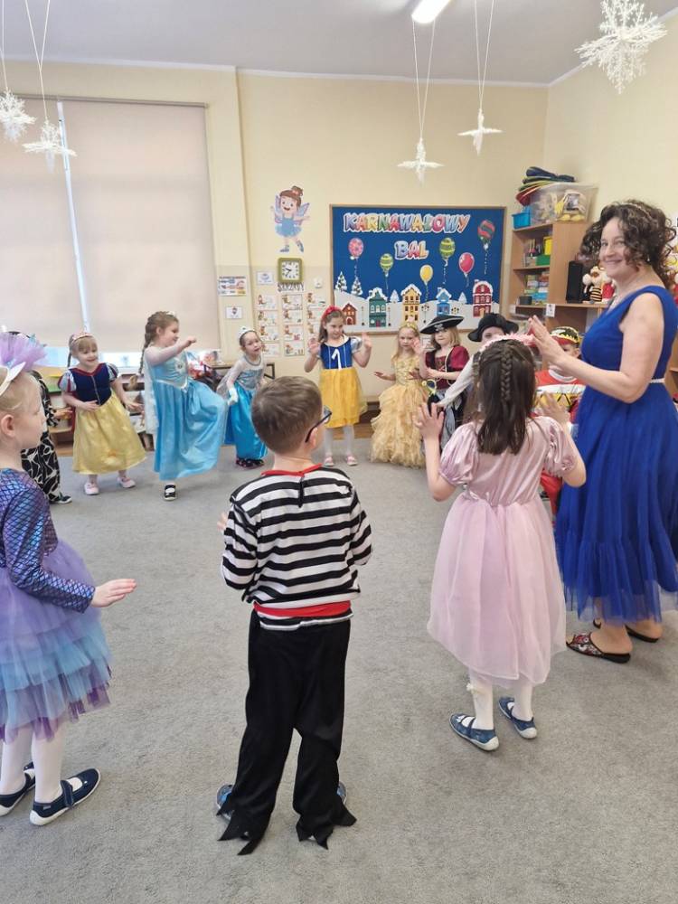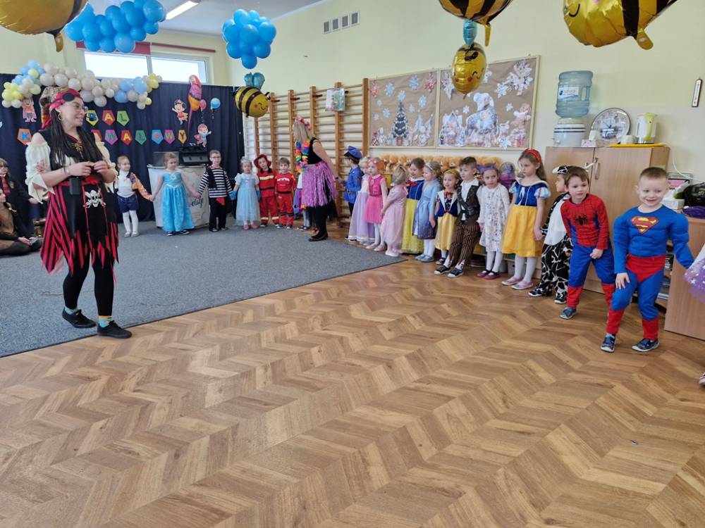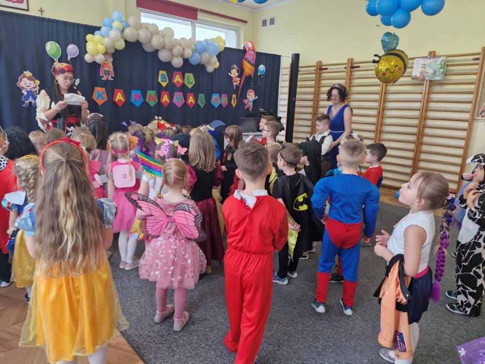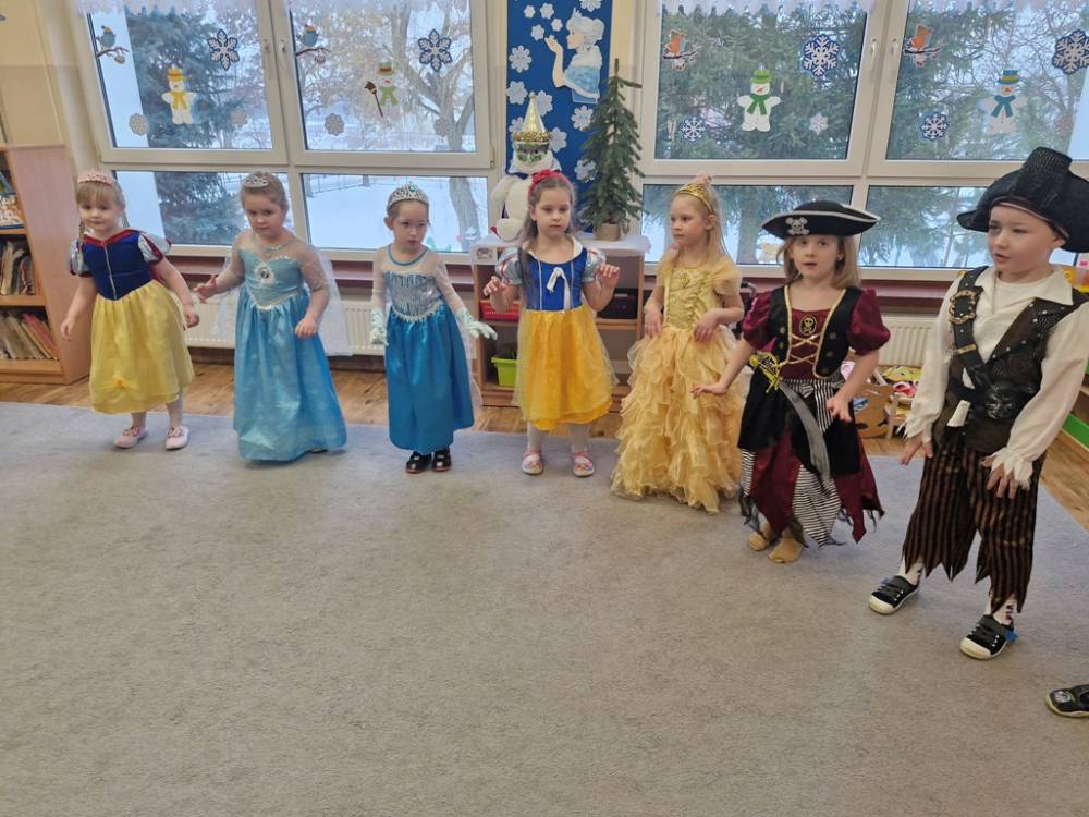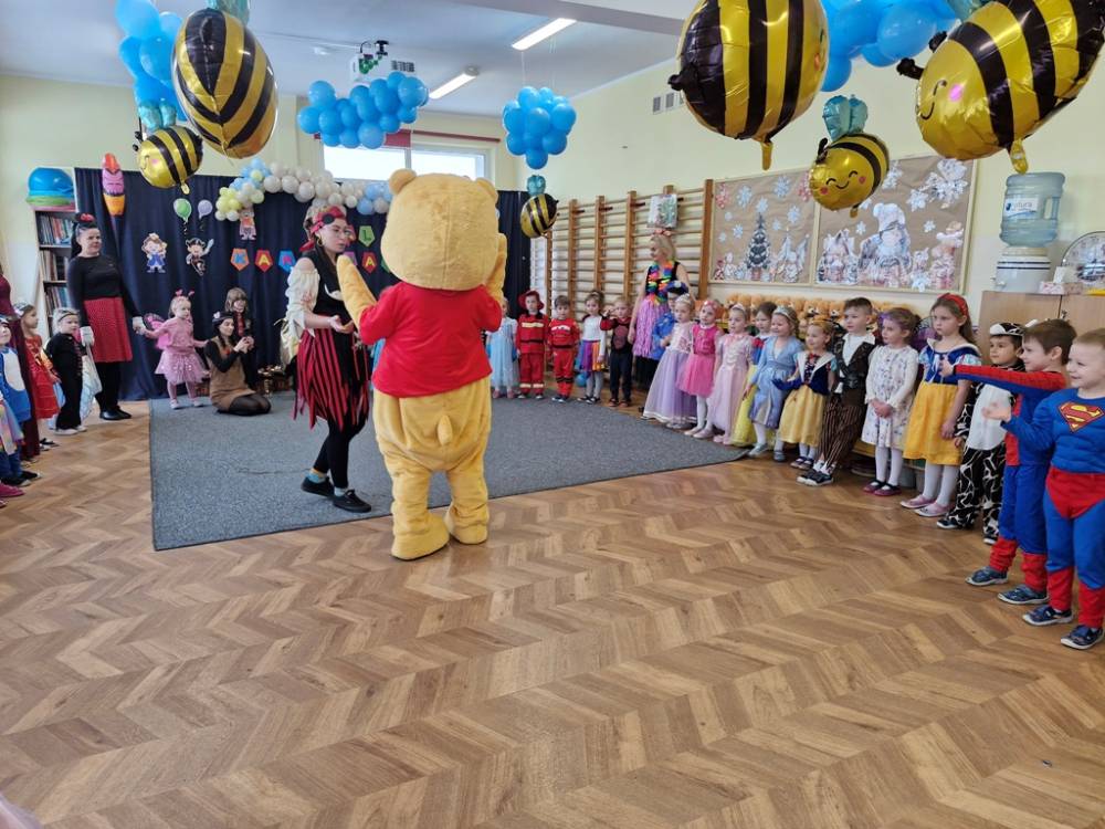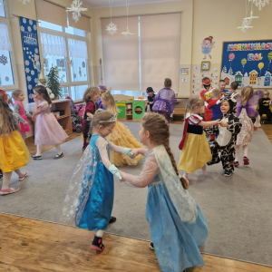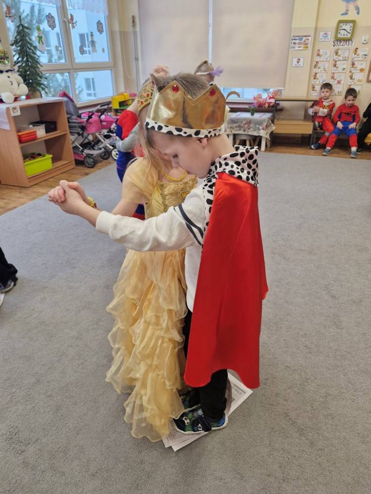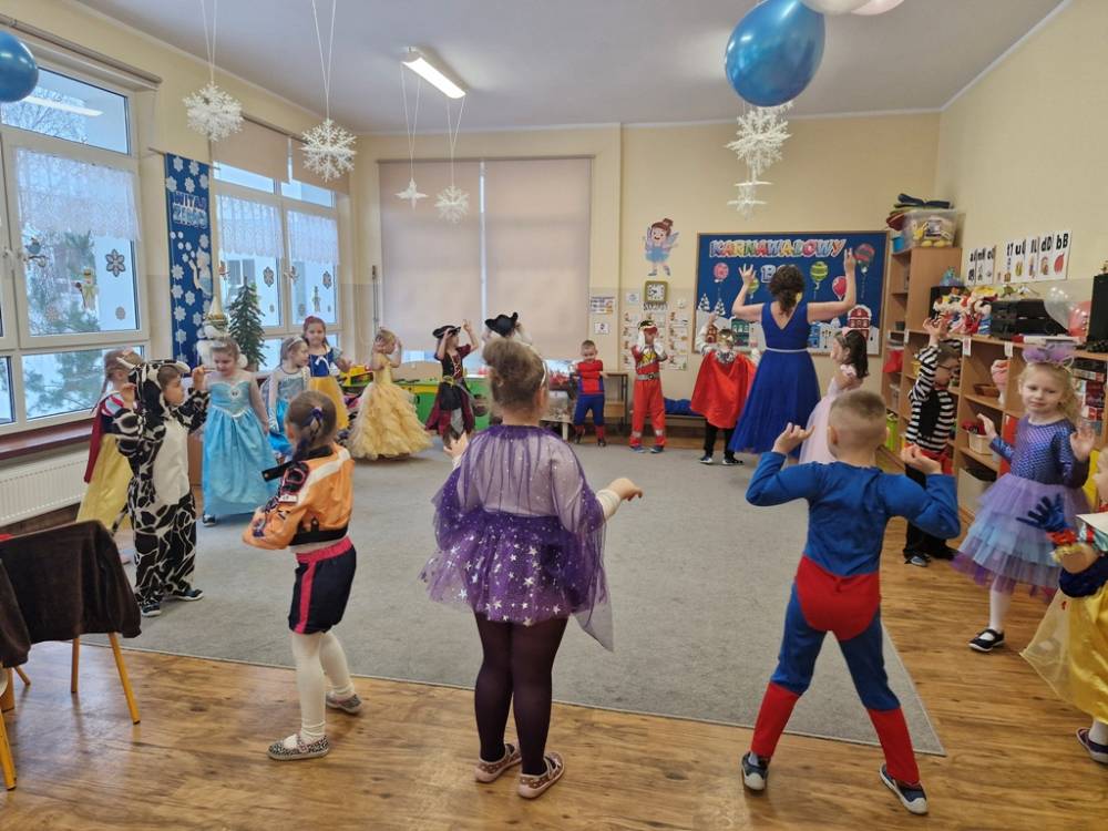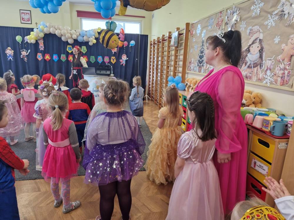 W czwartek, tj. 5 lutego 2026 roku w przedszkolu odbył się bal karnawałowy, na który dzieci czekały z utęsknieniem. Panie dołożyły wszelkich starań, by wystrój przedszkola wprowadził przedszkolaków w radosny nastrój i zachęcał do wspólnych zabaw. Od samego rana do sali przedszkolnej wchodziły dzieci przebrane za postaci z różnych bajek, a motywem przewodnim tegorocznego balu byli bohaterowie bajek Walta Disneya. Można było zobaczyć: Królewnę Śnieżkę, Elsę z Krainy Lodu, Bellę, motyla, piratów itd. Panie animatorki z firmy Animacje Rewelacje zadbały o wspaniałą atmosferę karnawałową i wspólnie bawiły się przy rytmach piosenek dziecięcych i znanych przebojów muzyczych. Zabawę karnawałową uatrakcyjniły wspólne zabawy przy muzyce z elementem współzawodnictwa. Dzieci szukały skarbu, rzucały "nieprawdziwymi" perłami, chwytały bańki mydlane, a także bawiły się z Kubusiem Puchatkiem, który był gościem honorowym balu. Zabawę karnawałową dzieci kontynuowały w sali przedszkolnej, gdzie tańczyły i pląsały przy piosenkach dziecięcych, a także uczestniczyły w zabawach pry muzyce. Był taniec z balonem, taniec na gazecie i zabawa "Nie baw się zapałkami". Podczas przerwy na dzieci czekał słodko-owocowy poczęstunek przygotowany przez mamy. Bal przebierańców przyniół dzieciom wiele radości, a piękne chwile zostały uwieńczone na wspólnych zdjeciach. Dzieci serdecznie dziękują rodzicom za przygotowanie przebrań karnawalowych, a w szczególności mamom: Mai i Krysi za przygotowanie poczęstunku.