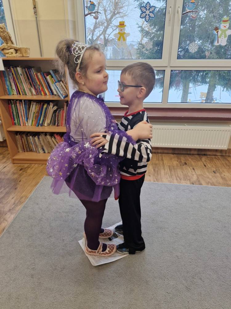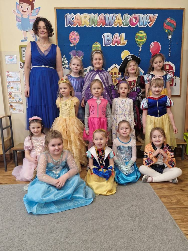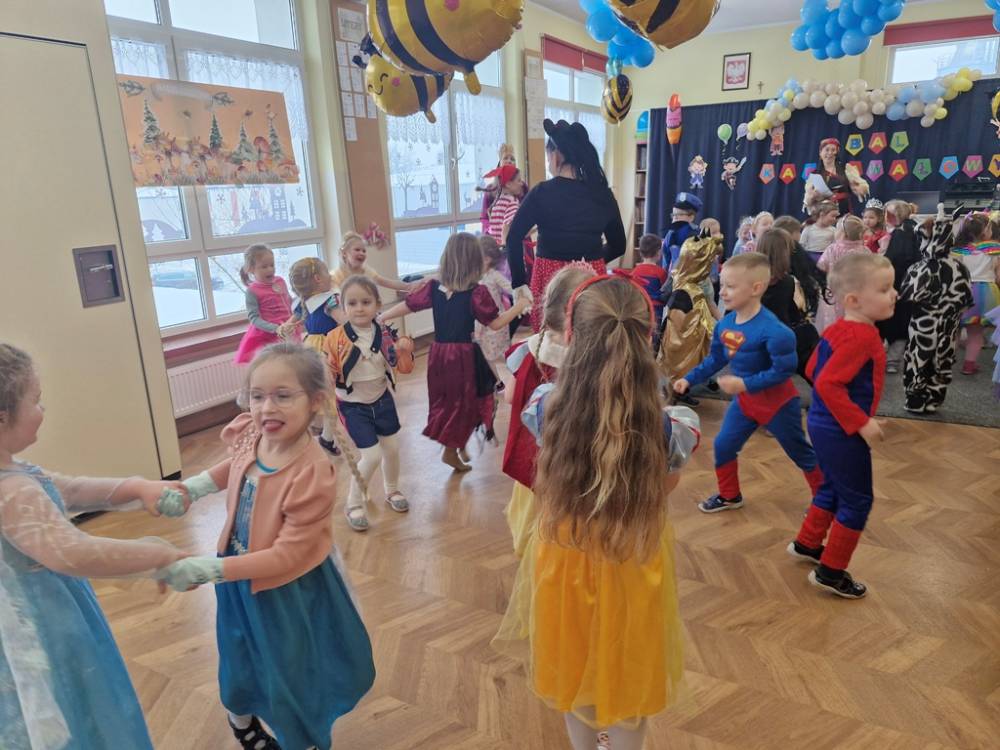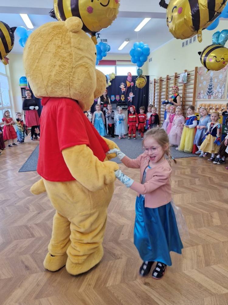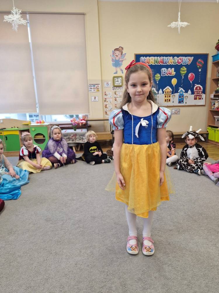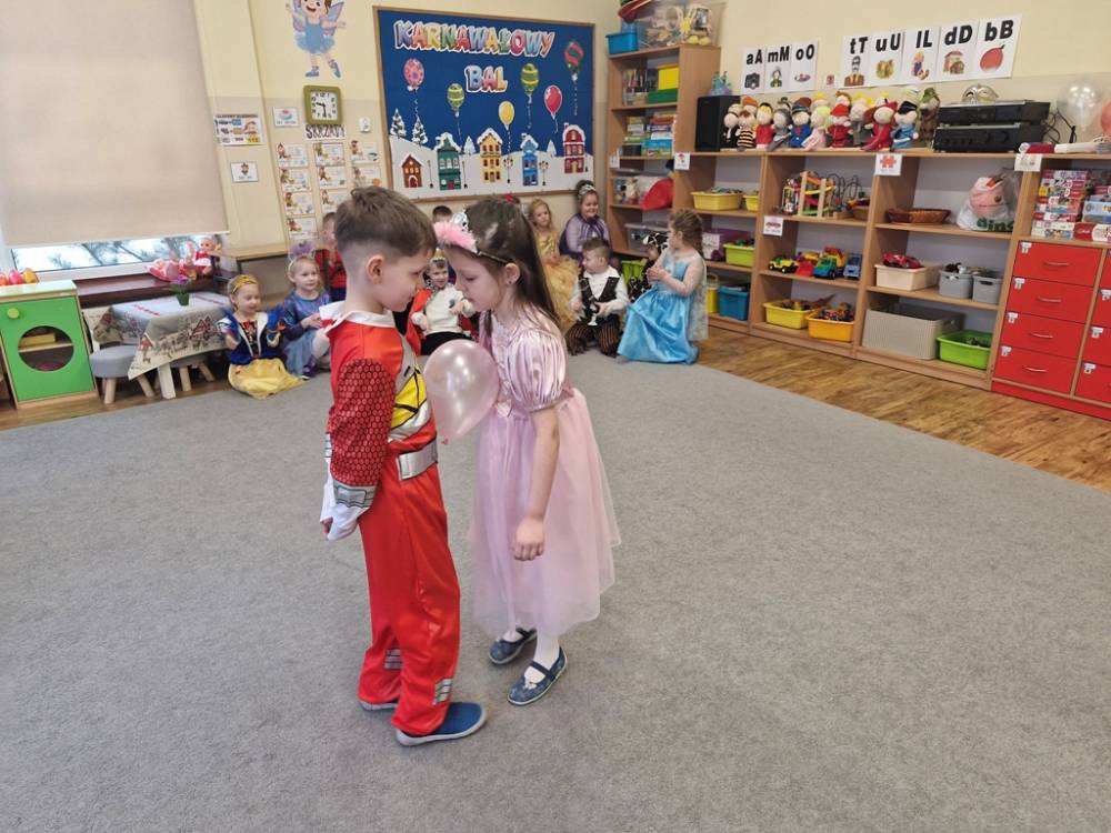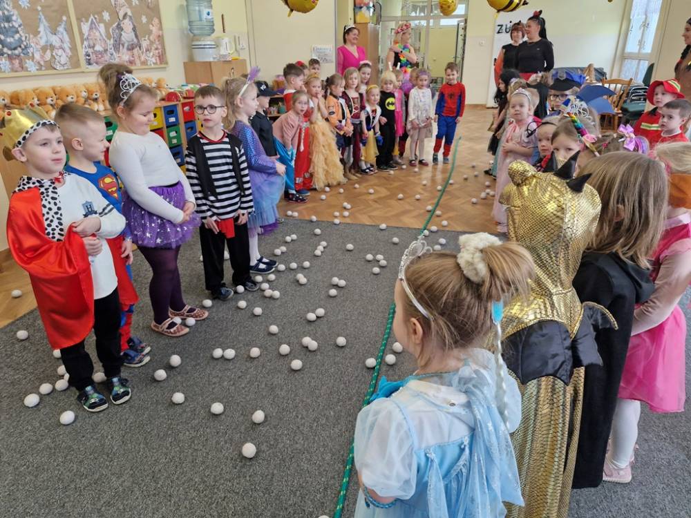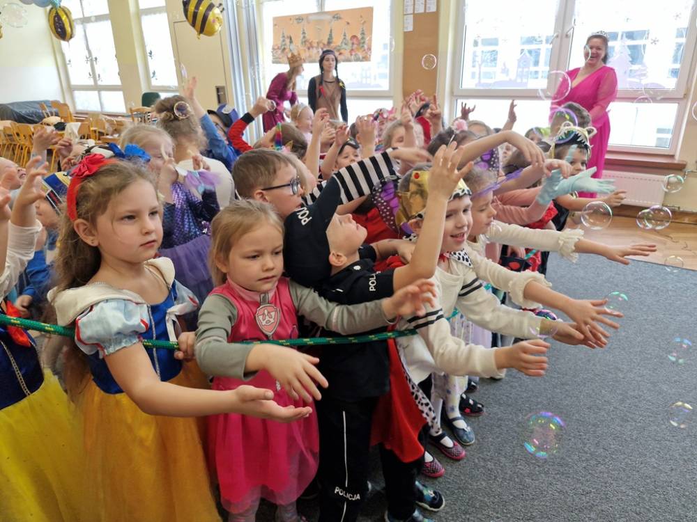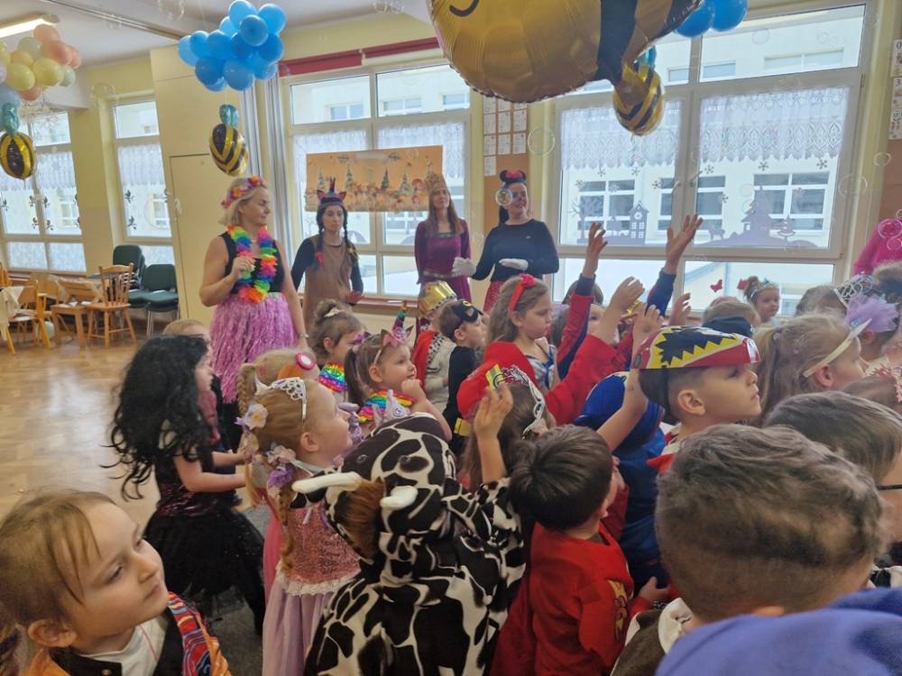 W czwartek, tj. 5 lutego 2026 roku w przedszkolu odbył się bal karnawałowy, na który dzieci czekały z utęsknieniem. Panie dołożyły wszelkich starań, by wystrój przedszkola wprowadził przedszkolaków w radosny nastrój i zachęcał do wspólnych zabaw. Od samego rana do sali przedszkolnej wchodziły dzieci przebrane za postaci z różnych bajek, a motywem przewodnim tegorocznego balu byli bohaterowie bajek Walta Disneya. Można było zobaczyć: Królewnę Śnieżkę, Elsę z Krainy Lodu, Bellę, motyla, piratów itd. Panie animatorki z firmy Animacje Rewelacje zadbały o wspaniałą atmosferę karnawałową i wspólnie bawiły się przy rytmach piosenek dziecięcych i znanych przebojów muzyczych. Zabawę karnawałową uatrakcyjniły wspólne zabawy przy muzyce z elementem współzawodnictwa. Dzieci szukały skarbu, rzucały "nieprawdziwymi" perłami, chwytały bańki mydlane, a także bawiły się z Kubusiem Puchatkiem, który był gościem honorowym balu. Zabawę karnawałową dzieci kontynuowały w sali przedszkolnej, gdzie tańczyły i pląsały przy piosenkach dziecięcych, a także uczestniczyły w zabawach pry muzyce. Był taniec z balonem, taniec na gazecie i zabawa "Nie baw się zapałkami". Podczas przerwy na dzieci czekał słodko-owocowy poczęstunek przygotowany przez mamy. Bal przebierańców przyniół dzieciom wiele radości, a piękne chwile zostały uwieńczone na wspólnych zdjeciach. Dzieci serdecznie dziękują rodzicom za przygotowanie przebrań karnawalowych, a w szczególności mamom: Mai i Krysi za przygotowanie poczęstunku.