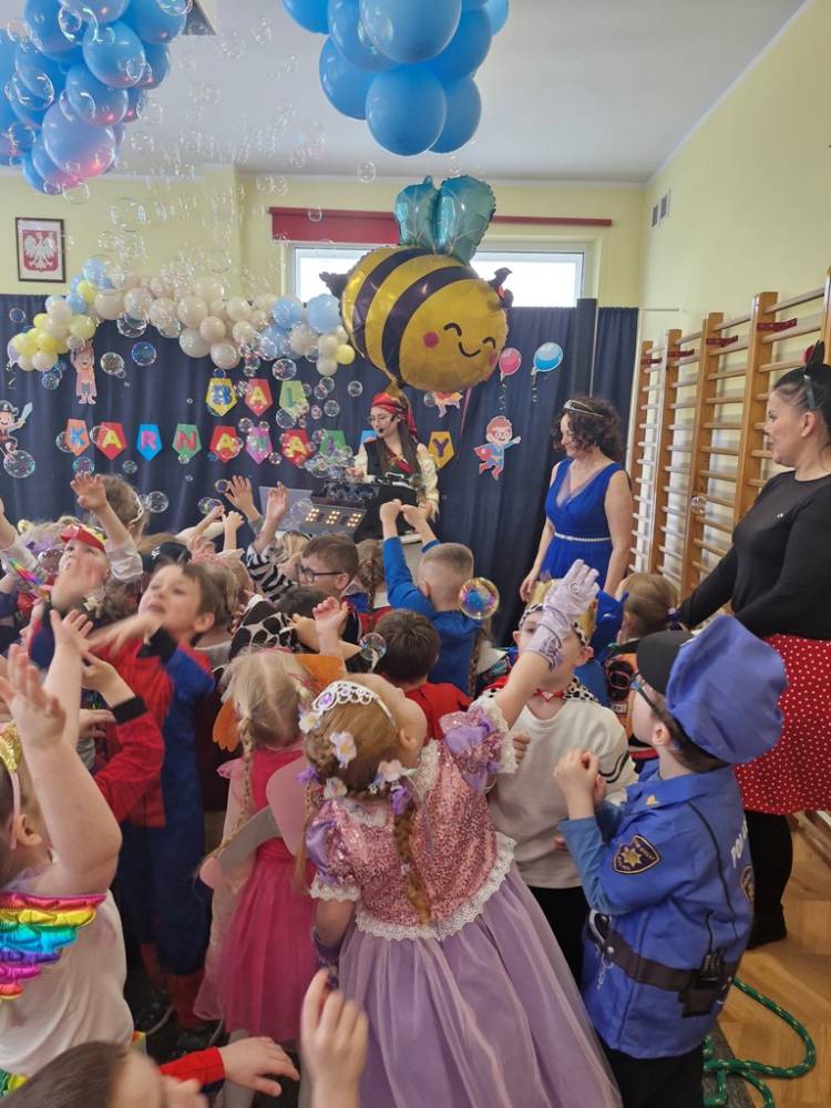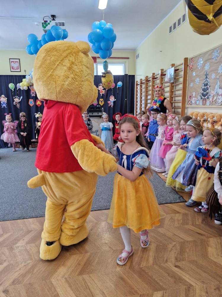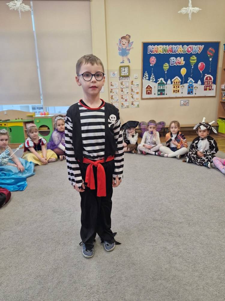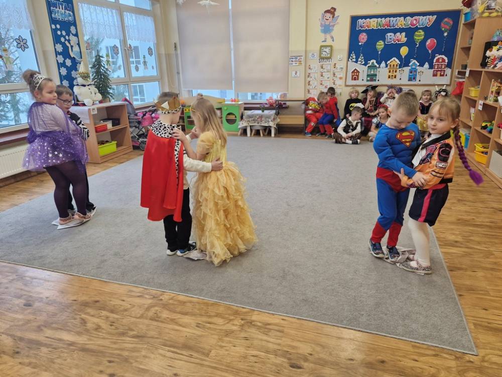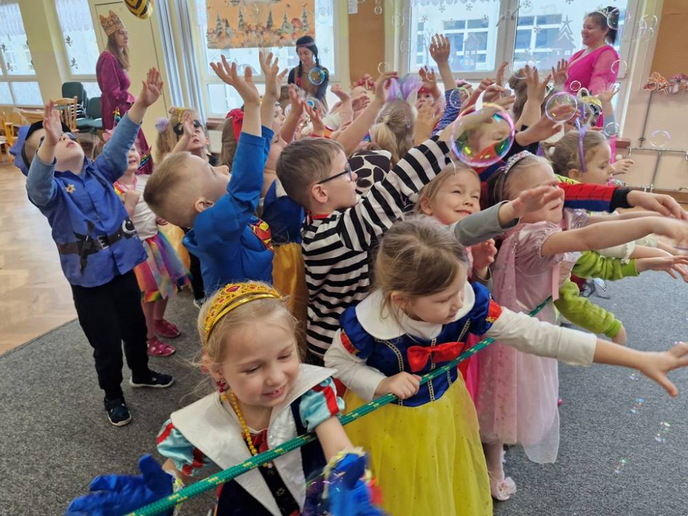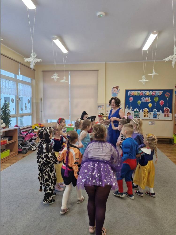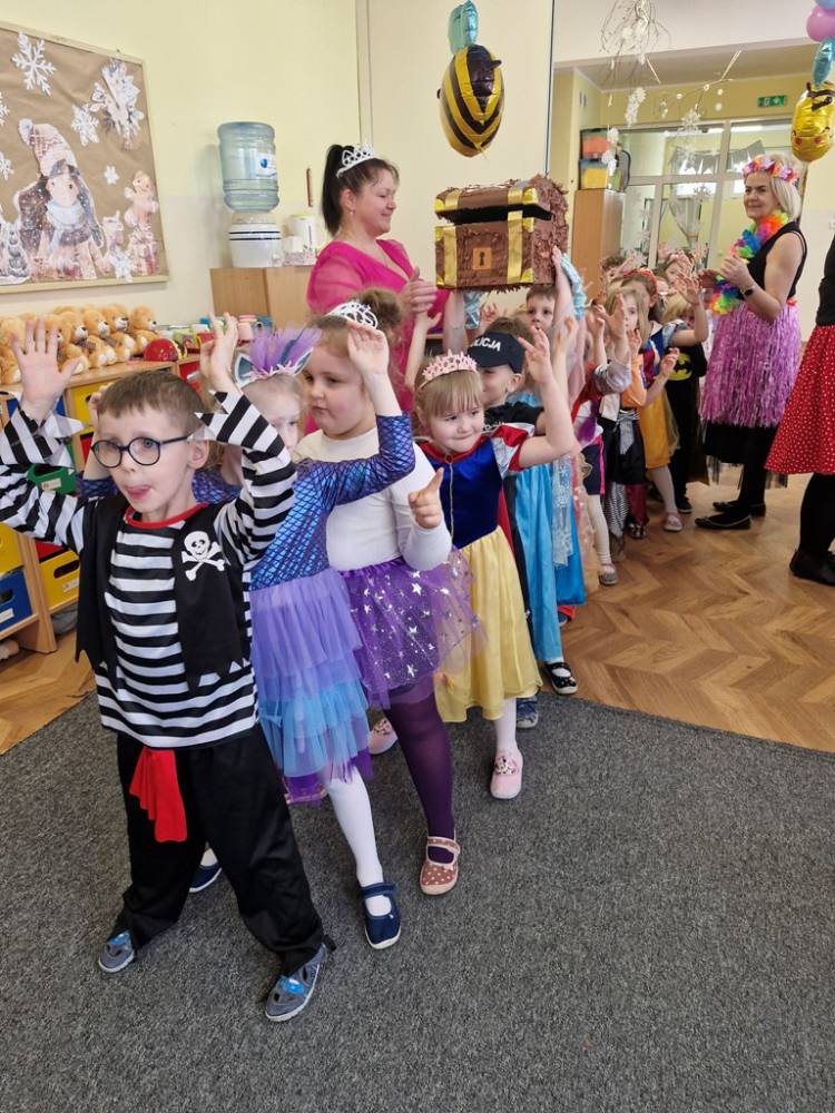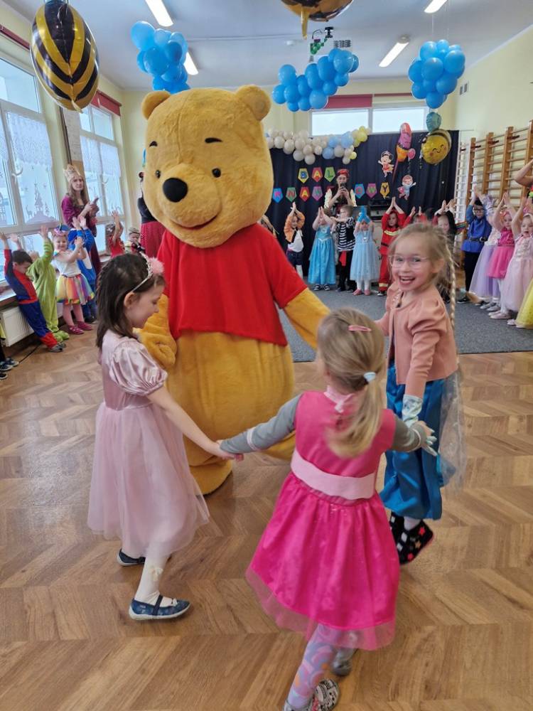 W czwartek, tj. 5 lutego 2026 roku w przedszkolu odbył się bal karnawałowy, na który dzieci czekały z utęsknieniem. Panie dołożyły wszelkich starań, by wystrój przedszkola wprowadził przedszkolaków w radosny nastrój i zachęcał do wspólnych zabaw. Od samego rana do sali przedszkolnej wchodziły dzieci przebrane za postaci z różnych bajek, a motywem przewodnim tegorocznego balu byli bohaterowie bajek Walta Disneya. Można było zobaczyć: Królewnę Śnieżkę, Elsę z Krainy Lodu, Bellę, motyla, piratów itd. Panie animatorki z firmy Animacje Rewelacje zadbały o wspaniałą atmosferę karnawałową i wspólnie bawiły się przy rytmach piosenek dziecięcych i znanych przebojów muzyczych. Zabawę karnawałową uatrakcyjniły wspólne zabawy przy muzyce z elementem współzawodnictwa. Dzieci szukały skarbu, rzucały "nieprawdziwymi" perłami, chwytały bańki mydlane, a także bawiły się z Kubusiem Puchatkiem, który był gościem honorowym balu. Zabawę karnawałową dzieci kontynuowały w sali przedszkolnej, gdzie tańczyły i pląsały przy piosenkach dziecięcych, a także uczestniczyły w zabawach pry muzyce. Był taniec z balonem, taniec na gazecie i zabawa "Nie baw się zapałkami". Podczas przerwy na dzieci czekał słodko-owocowy poczęstunek przygotowany przez mamy. Bal przebierańców przyniół dzieciom wiele radości, a piękne chwile zostały uwieńczone na wspólnych zdjeciach. Dzieci serdecznie dziękują rodzicom za przygotowanie przebrań karnawalowych, a w szczególności mamom: Mai i Krysi za przygotowanie poczęstunku.