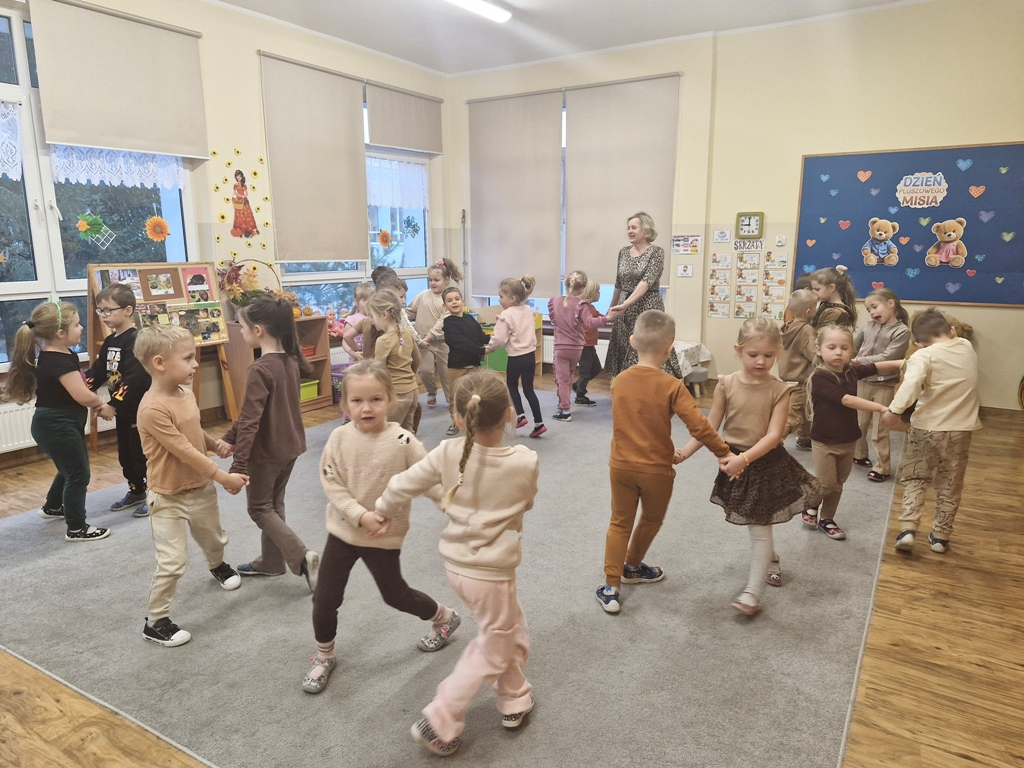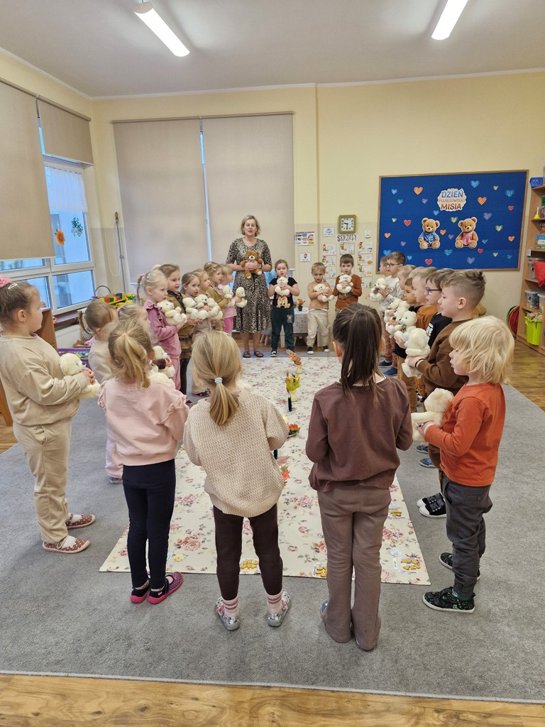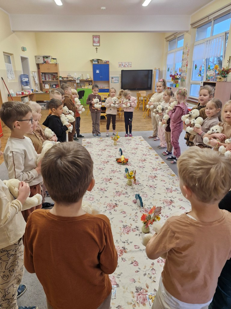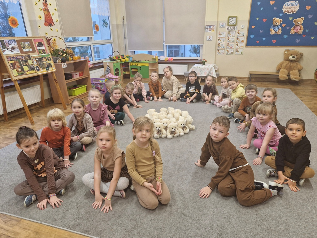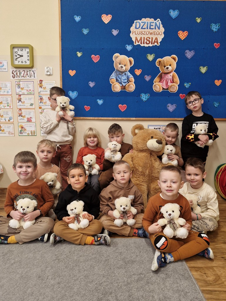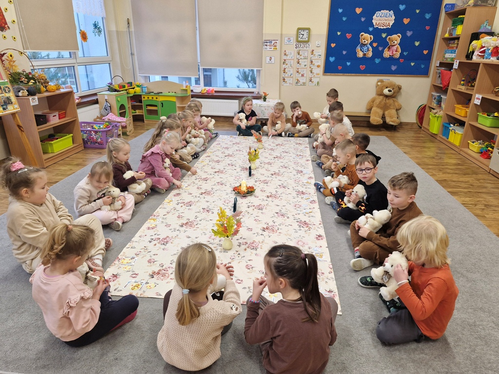 W dniu 25 listopada dzieci z grupy "Skrzaty" obchodziły Dzień Pluszowego Misia. Przedszkolakom w tym dniu towarzyszył miś, który już trzeci rok jest z nimi w przedszkolu. Z okazji święta misiów dzieci zorganizowały dla solenizantów przyjęcie urodzinowe. Każdy dziecko przygotowało nakrycie dla swojego misia, rozkładając "papierowe" talerzyki, sztućce, a na koniec małe ciasteczka. Po wspólnym zaśpiewaniu 'Sto lat" dzieci skosztowały urodzinowych ciasteczek i zadbały o to, aby brzuszki misiów były pełne. Nie zabrakło również zabaw z misiami: zabawy tanecznej i ruchowej. Poza tym dzieci wykonały piękne prace plastyczne -"Misie", które przyozdobiły przedszkole. Na zakończenie tego ważnego wydarzenia przedszkolaki ze swoimi misiami pozowały do wspólnego zdjęcia na tle specjalnie przygotowanej dekoracji. "Skrzaty" serdecznie dziękują mamie bliźniaków (Liwii i leona) za pomoc w organizacji uroczystości w grupie.