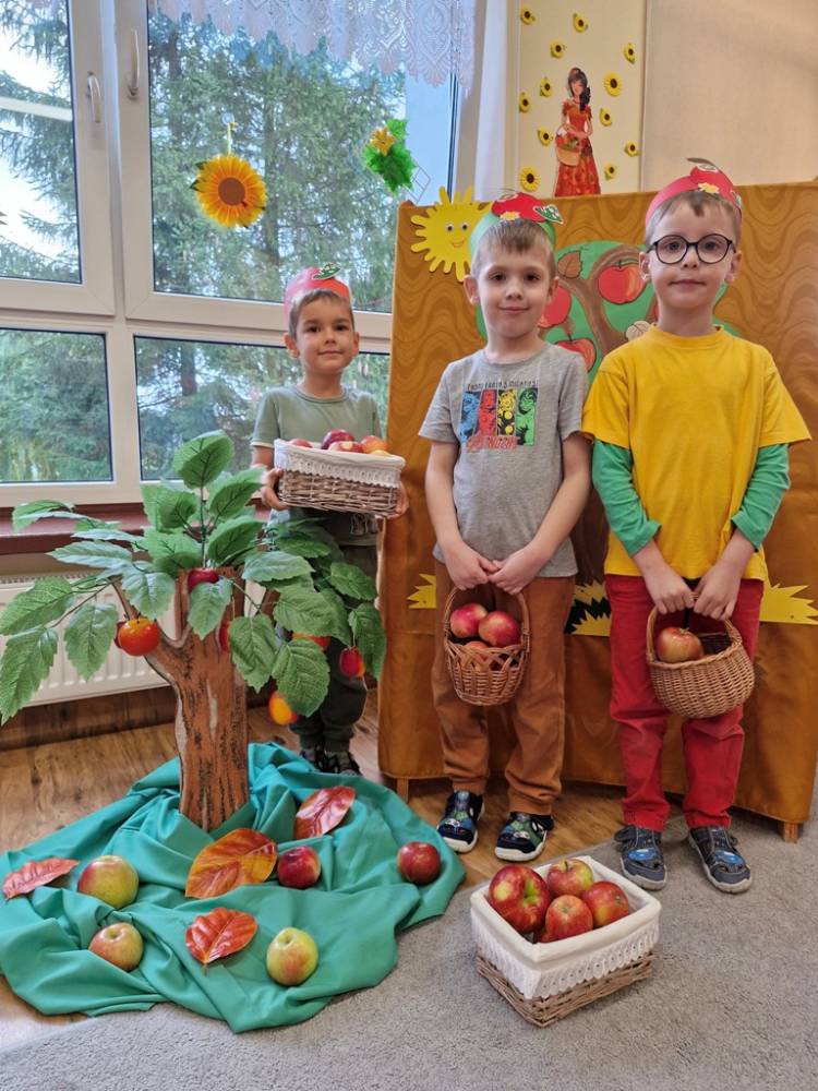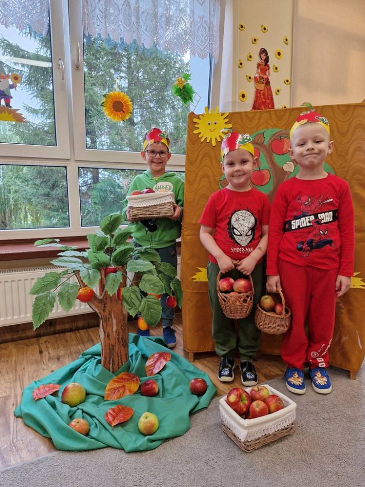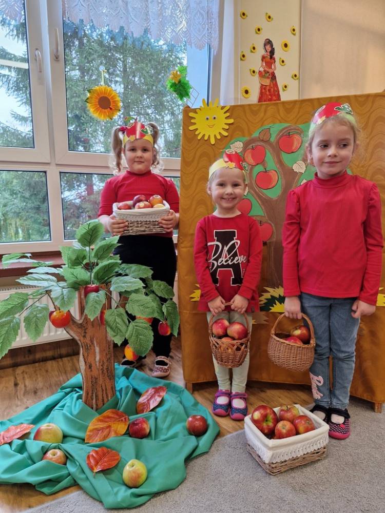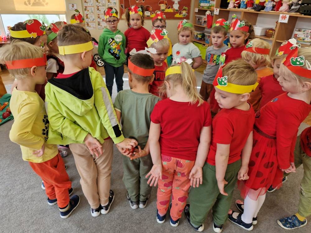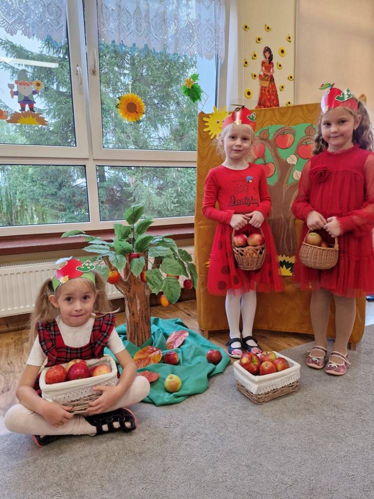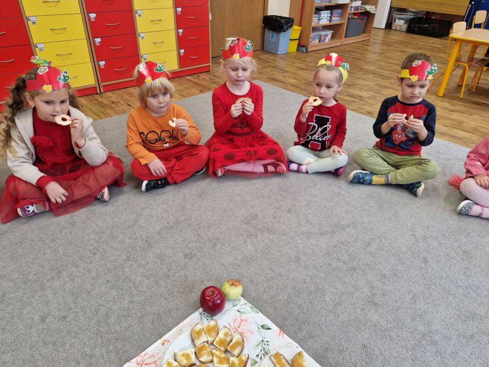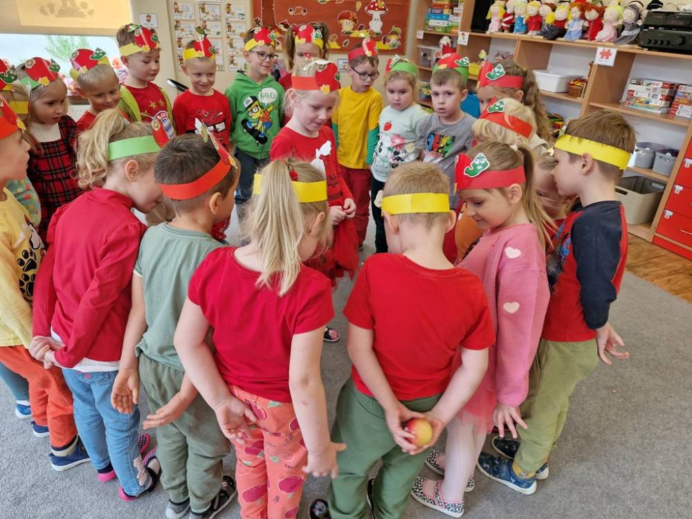 "Nad polami, nad lasami wędrowało słonko. Przystanęło, zajaśniało nad naszą jabłonką..." - tymi słowami piosenki dzieci rozpoczęły świętowanie Dnia Jabłka w dniu 7 października 2025 roku. Rodzice zadbali o to, aby każde dziecko w tym dniu założyło ubranka w kolorach jabłek i przyniosło do przedszkola duże jabłko. Podczas zajęć dzieci wysłuchały piosenki o jabłkach dojrzewjących na jabłoni, a następnie uczestniczyły w zabawie rytmicznej i w zabawach ruchowych "Szukanie jabłka", "Zbieranie jabłek do skrzynek". Dzieci również poznały wartości odżywcze i zdrowotne jabłek. Próbowały dżemu jabłkowego, jadły jabłka suszone, piły sok jabłkowy, a także skosztowały pysznych babeczek z dodatkiem jabłek. To był bardzo ciekway dzień w przedszkolu, a to co mialo miejsce można obejrzeć w galerii. Dzieci serdecznie dziękują mamie Czarka za pomoc w zorganizowniu uroczystości w grupie.