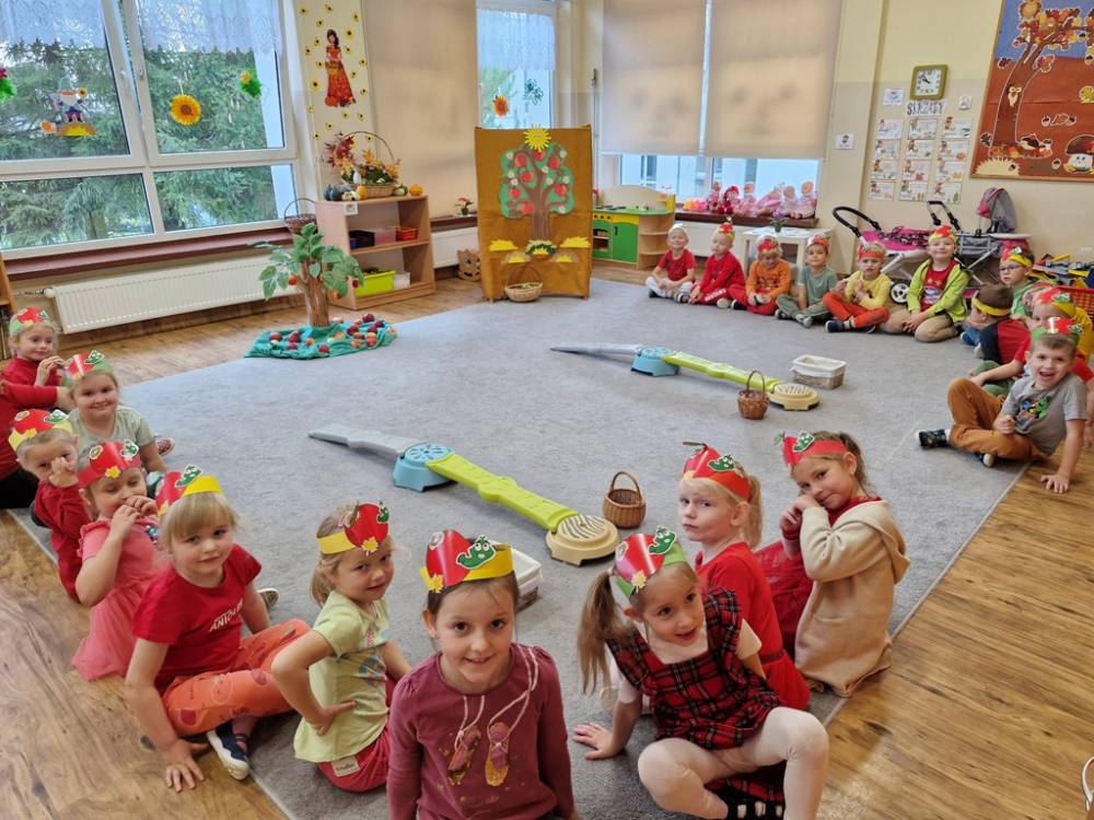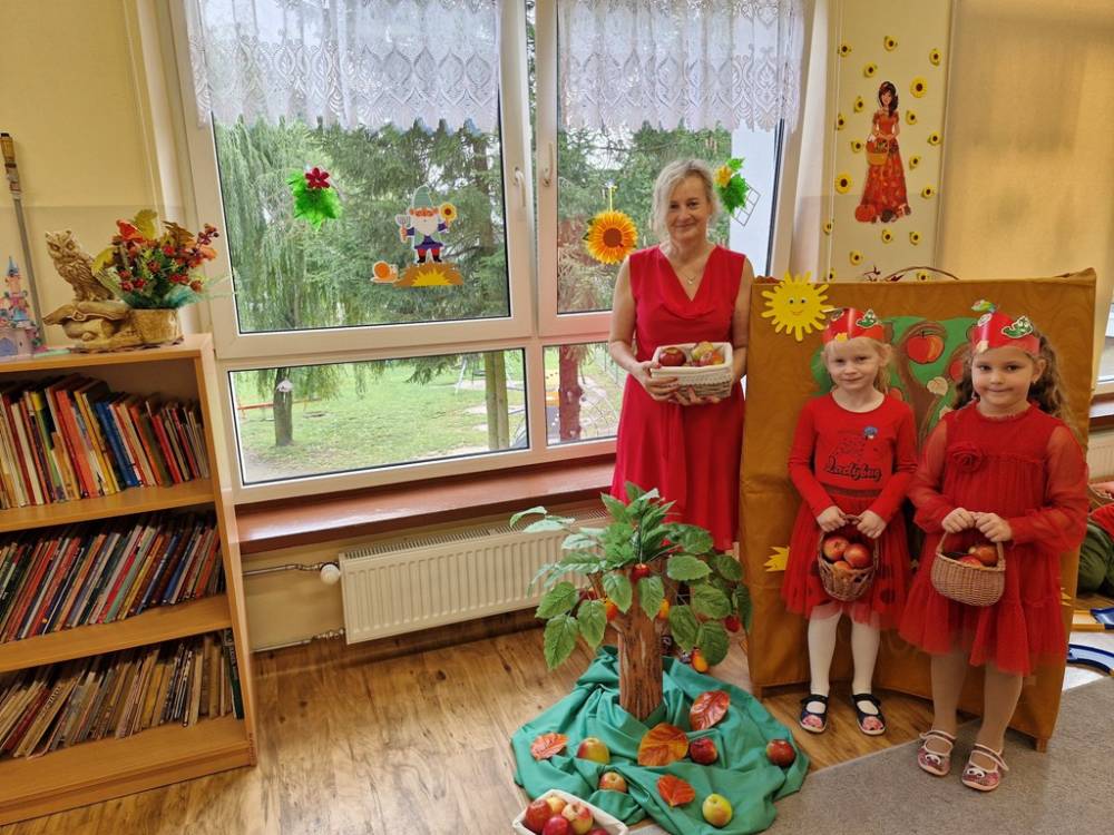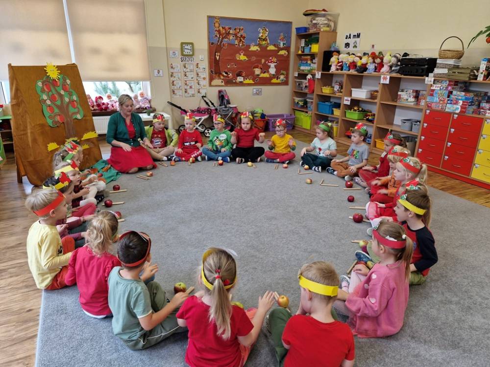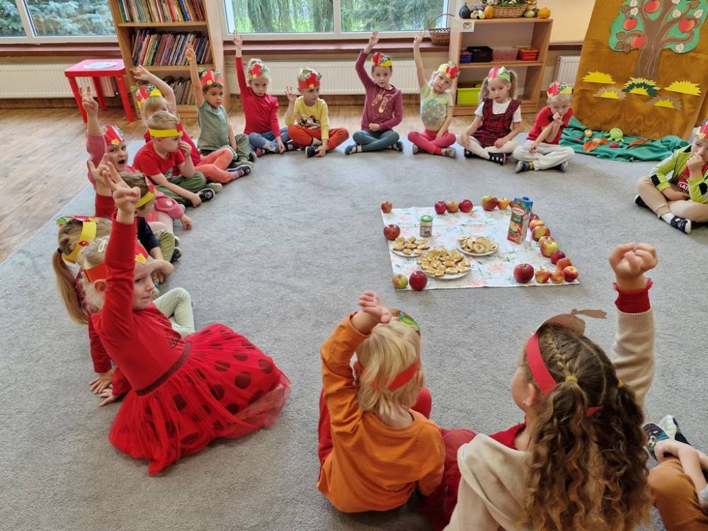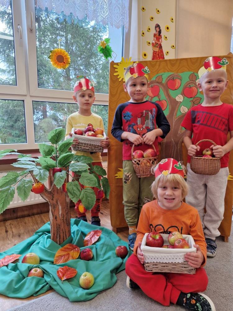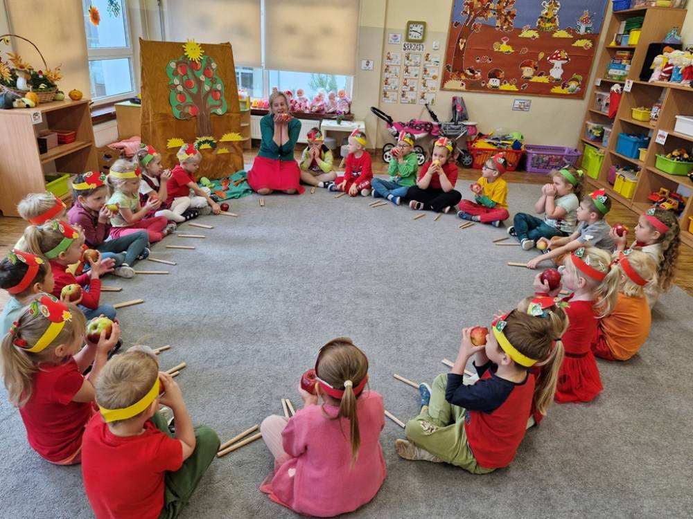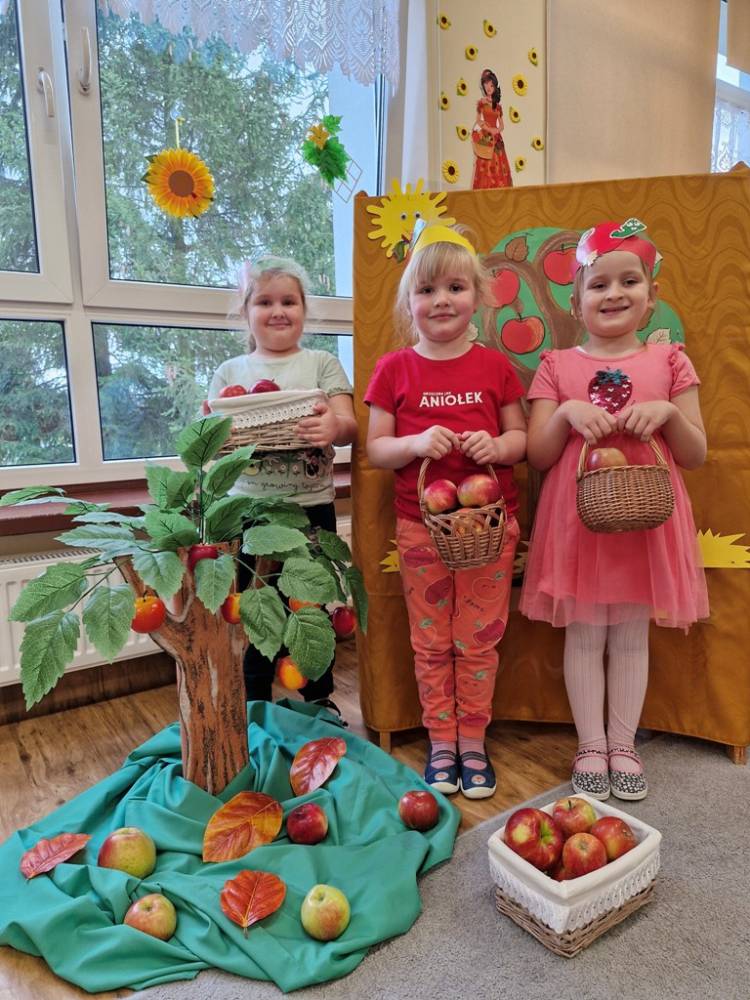 "Nad polami, nad lasami wędrowało słonko. Przystanęło, zajaśniało nad naszą jabłonką..." - tymi słowami piosenki dzieci rozpoczęły świętowanie Dnia Jabłka w dniu 7 października 2025 roku. Rodzice zadbali o to, aby każde dziecko w tym dniu założyło ubranka w kolorach jabłek i przyniosło do przedszkola duże jabłko. Podczas zajęć dzieci wysłuchały piosenki o jabłkach dojrzewjących na jabłoni, a następnie uczestniczyły w zabawie rytmicznej i w zabawach ruchowych "Szukanie jabłka", "Zbieranie jabłek do skrzynek". Dzieci również poznały wartości odżywcze i zdrowotne jabłek. Próbowały dżemu jabłkowego, jadły jabłka suszone, piły sok jabłkowy, a także skosztowały pysznych babeczek z dodatkiem jabłek. To był bardzo ciekway dzień w przedszkolu, a to co mialo miejsce można obejrzeć w galerii. Dzieci serdecznie dziękują mamie Czarka za pomoc w zorganizowniu uroczystości w grupie.