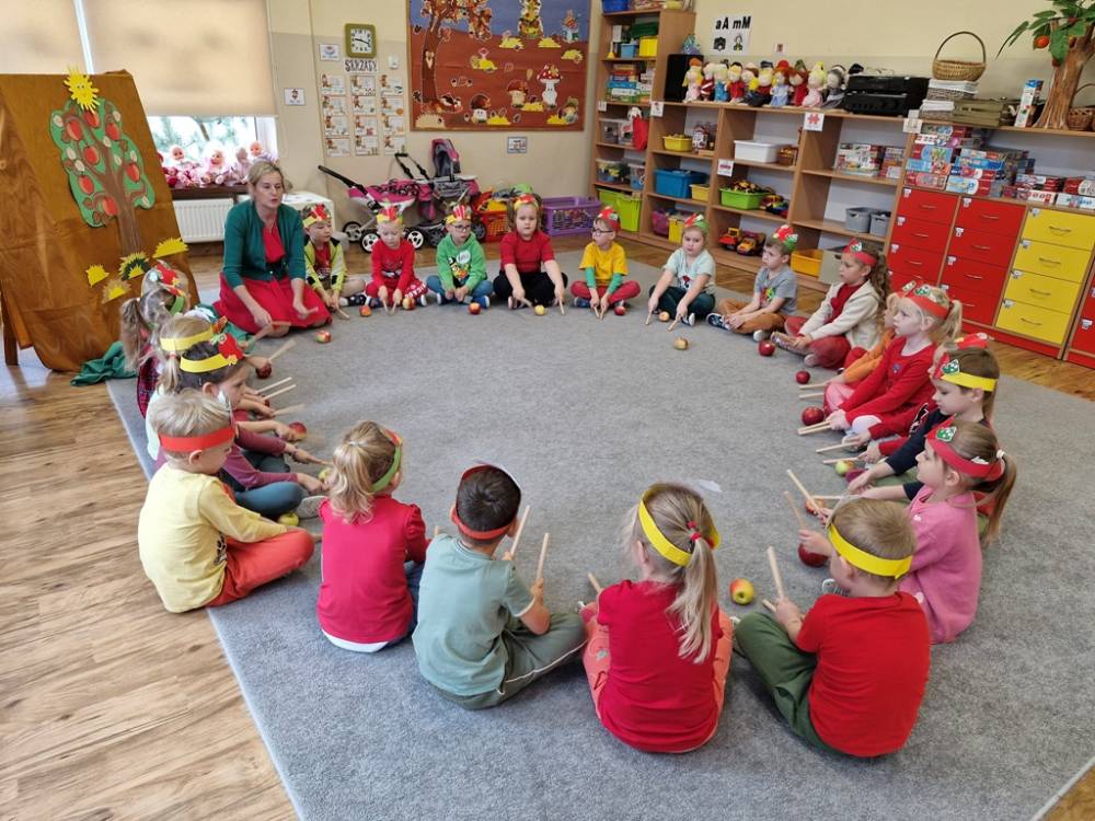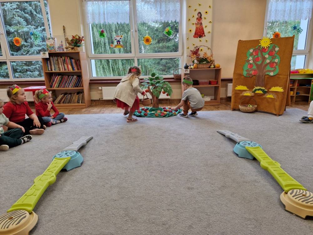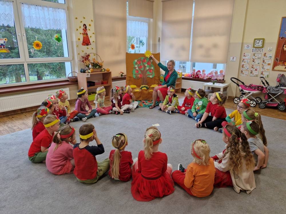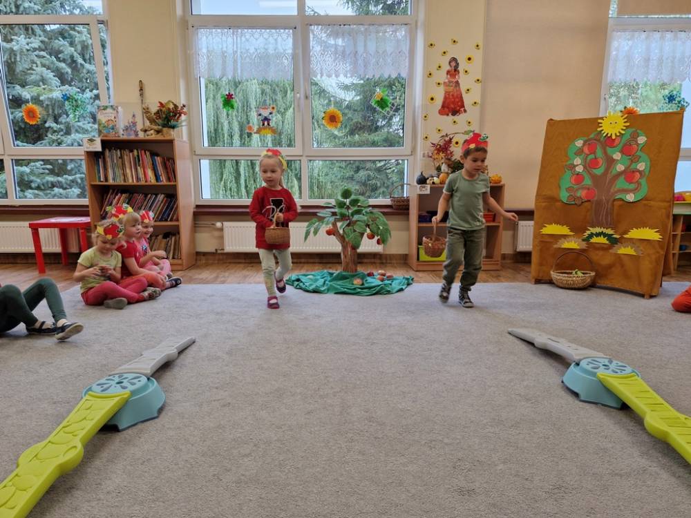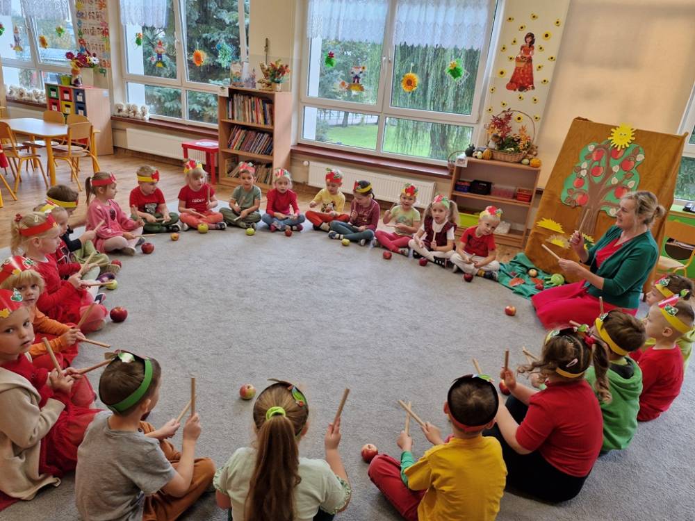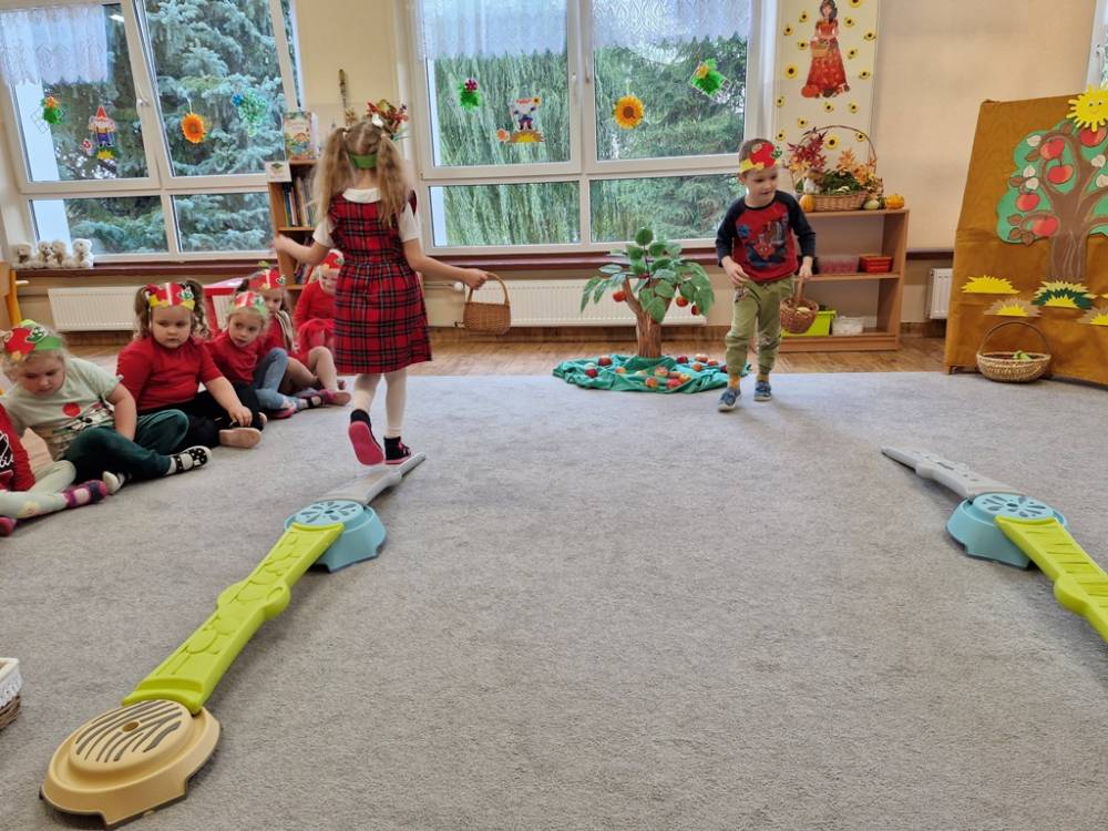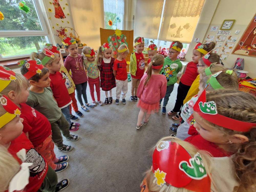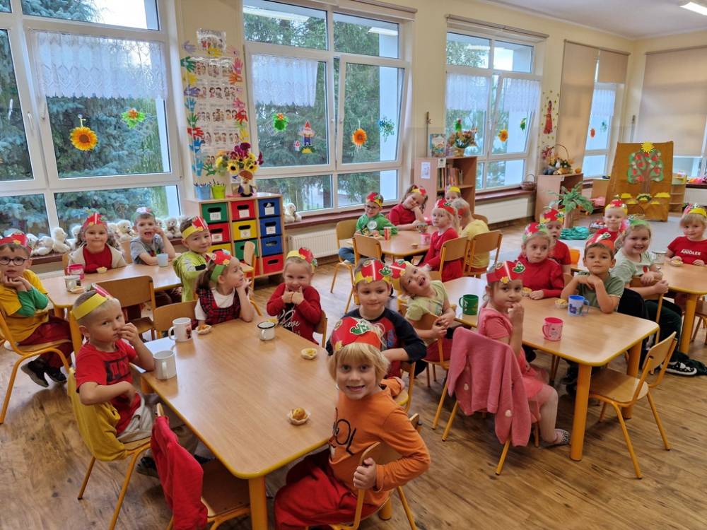 "Nad polami, nad lasami wędrowało słonko. Przystanęło, zajaśniało nad naszą jabłonką..." - tymi słowami piosenki dzieci rozpoczęły świętowanie Dnia Jabłka w dniu 7 października 2025 roku. Rodzice zadbali o to, aby każde dziecko w tym dniu założyło ubranka w kolorach jabłek i przyniosło do przedszkola duże jabłko. Podczas zajęć dzieci wysłuchały piosenki o jabłkach dojrzewjących na jabłoni, a następnie uczestniczyły w zabawie rytmicznej i w zabawach ruchowych "Szukanie jabłka", "Zbieranie jabłek do skrzynek". Dzieci również poznały wartości odżywcze i zdrowotne jabłek. Próbowały dżemu jabłkowego, jadły jabłka suszone, piły sok jabłkowy, a także skosztowały pysznych babeczek z dodatkiem jabłek. To był bardzo ciekway dzień w przedszkolu, a to co mialo miejsce można obejrzeć w galerii. Dzieci serdecznie dziękują mamie Czarka za pomoc w zorganizowniu uroczystości w grupie.