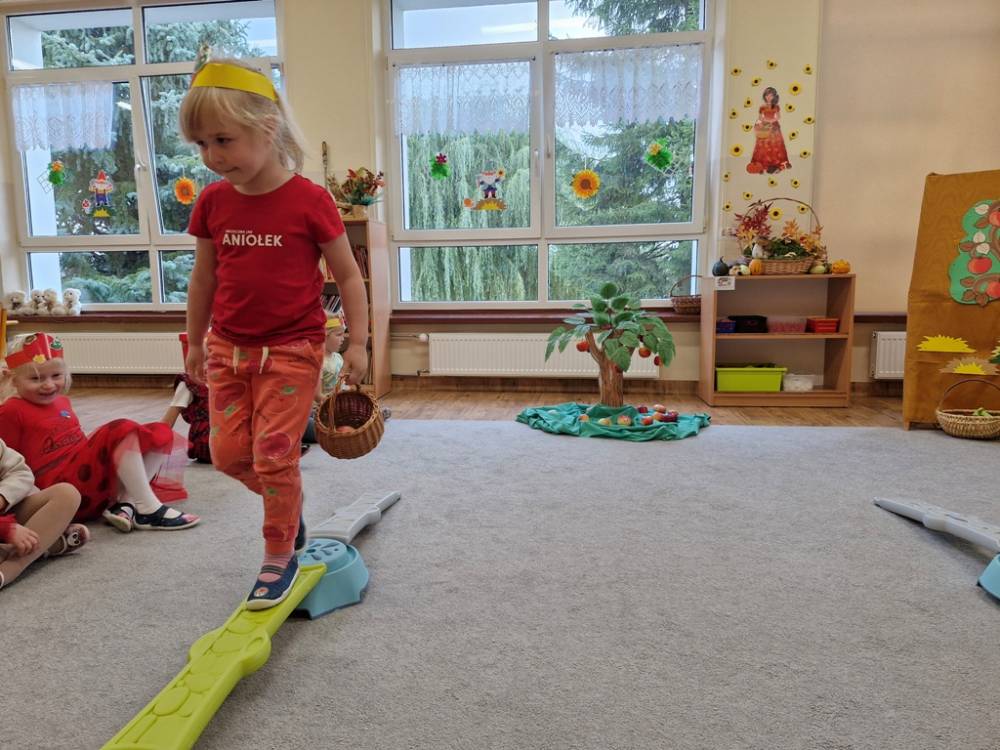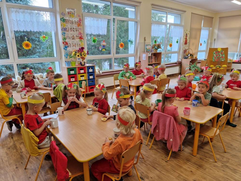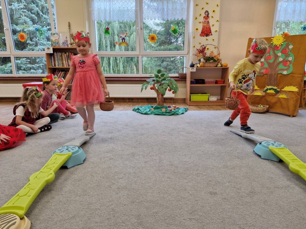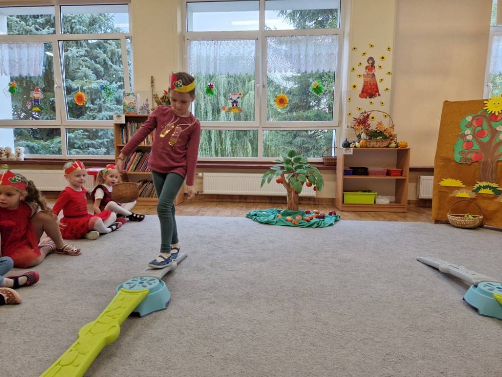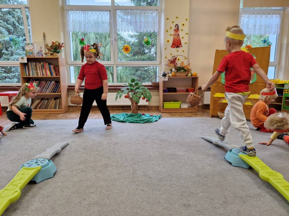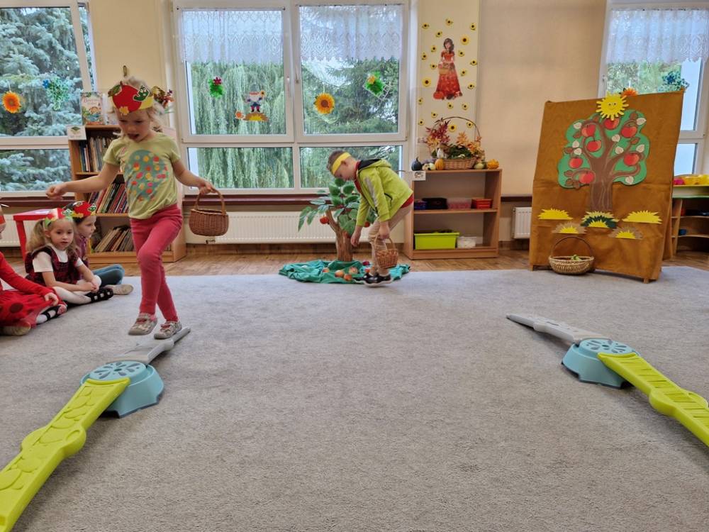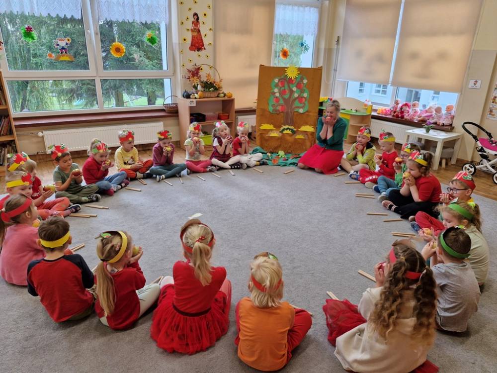 "Nad polami, nad lasami wędrowało słonko. Przystanęło, zajaśniało nad naszą jabłonką..." - tymi słowami piosenki dzieci rozpoczęły świętowanie Dnia Jabłka w dniu 7 października 2025 roku. Rodzice zadbali o to, aby każde dziecko w tym dniu założyło ubranka w kolorach jabłek i przyniosło do przedszkola duże jabłko. Podczas zajęć dzieci wysłuchały piosenki o jabłkach dojrzewjących na jabłoni, a następnie uczestniczyły w zabawie rytmicznej i w zabawach ruchowych "Szukanie jabłka", "Zbieranie jabłek do skrzynek". Dzieci również poznały wartości odżywcze i zdrowotne jabłek. Próbowały dżemu jabłkowego, jadły jabłka suszone, piły sok jabłkowy, a także skosztowały pysznych babeczek z dodatkiem jabłek. To był bardzo ciekway dzień w przedszkolu, a to co mialo miejsce można obejrzeć w galerii. Dzieci serdecznie dziękują mamie Czarka za pomoc w zorganizowniu uroczystości w grupie.