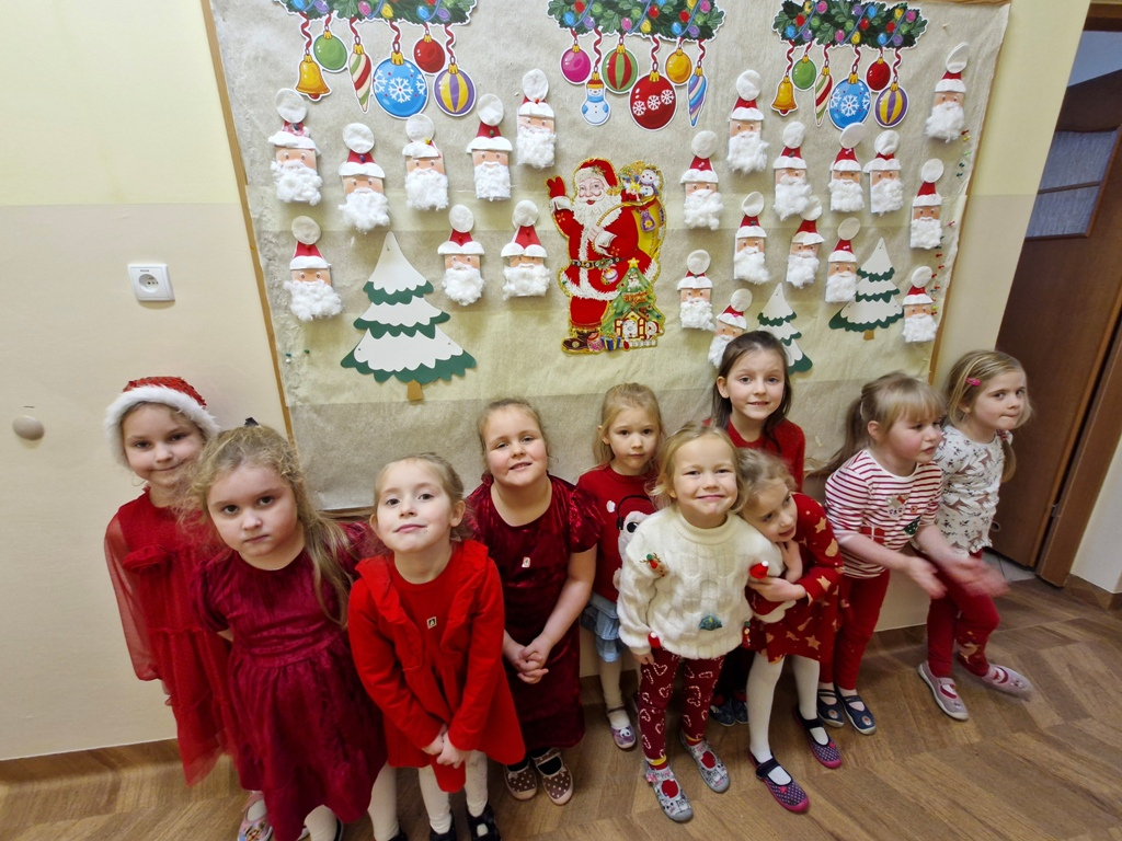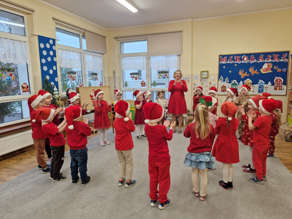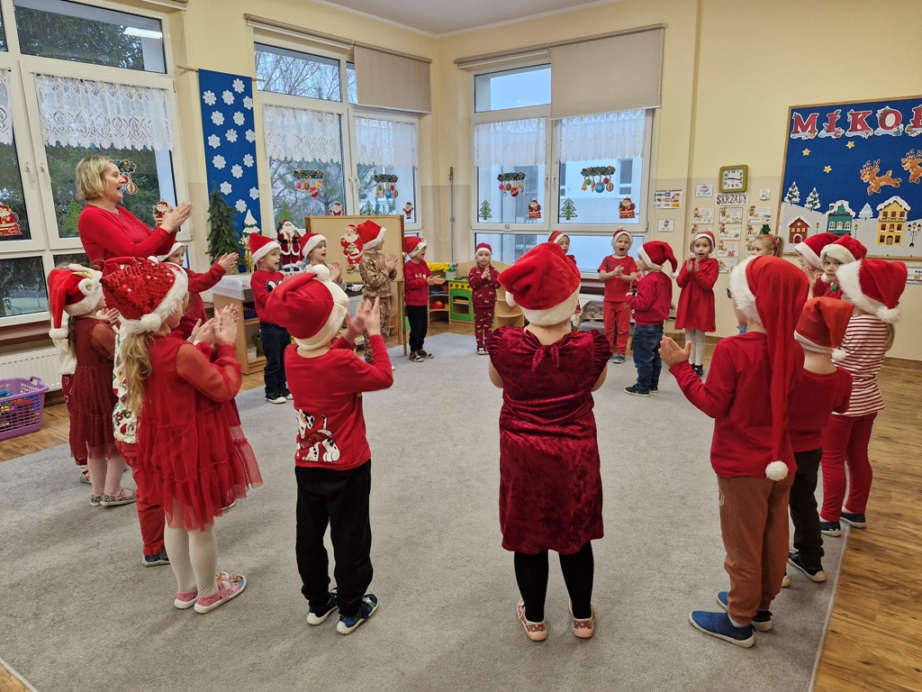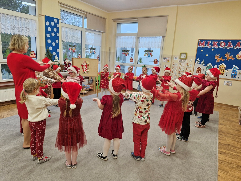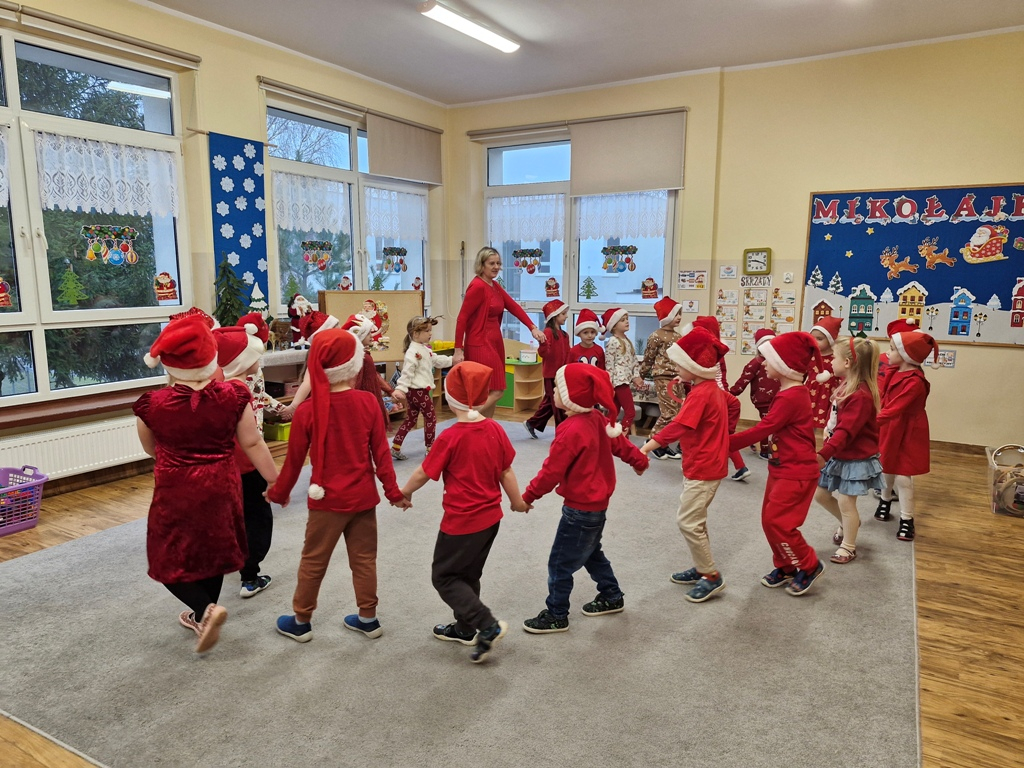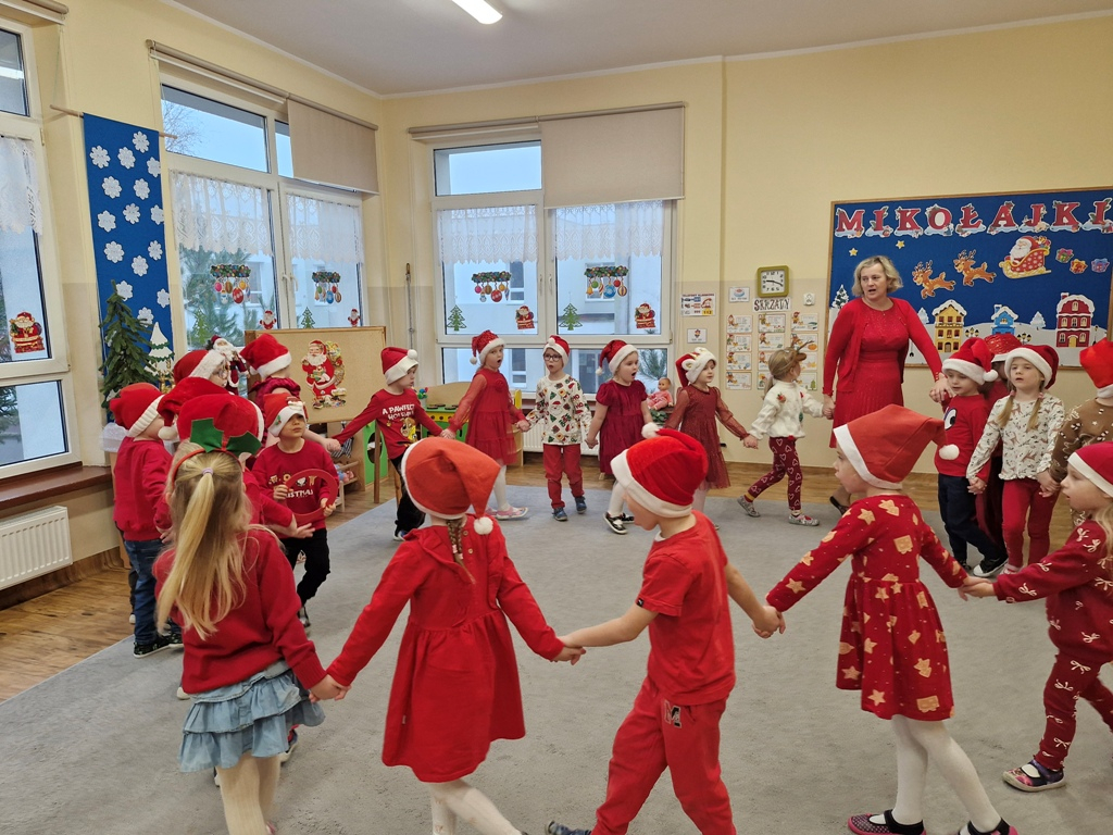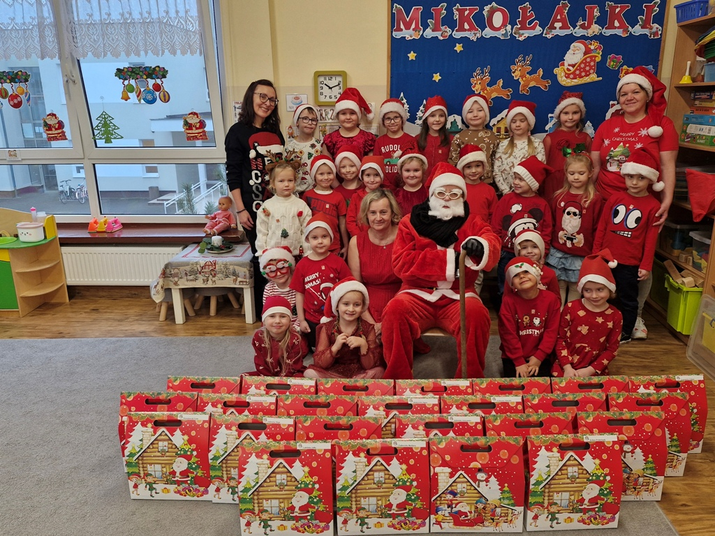 Mikołajki to święto długo oczekiwane przez wszystkie dzieci. W dniu 5 grudnia 2025 roku dzieci czekając na Mikołaja, uczestniczyły w różnych działaniach edukacyjnych. W czasie zajęć "Skrzaty" opisywały słownie wygląd postaci Mikołaja, opowiadały o swoich wymarzonych prezentach, a także usprawniały narządy artykulacyjne, słuchając opowiadania logopedycznego "Worek prezentów". Zanim Mikołaj zawitał do sali "Skrzatów" dzieci ilustrowały dźwiękami instrumentów muzycznych opowiadanie "Przyjazd Mikołaja", a także wchodziły w rolę Mikołaja, bawiąc się przy piosence Mikołaj. Wspólna zabawa ucichła, gdy z oddali dobiegł dźwięk dzwoneczka zwiastujący niecodziennego gościa. Odwiedziny Mikołaja sprawiły dzieciom wiele radosci. Po wspólnych rozmowach był czas na podziękowanie za upominki i wykonanie pamiątkowego zdjęcia. W tym dniu dzieci również uczestniczyły w zabawach ruchowych przy muzyce, a także wykonały piękne prace palstyczne przedstawiajace postać Mikołaja, które zostały zaprezentowane na gazetce. Dzieci z grupy "Skrzaty" serdecznie dziękują mamie Jagny za pomoc w organizacji święta.