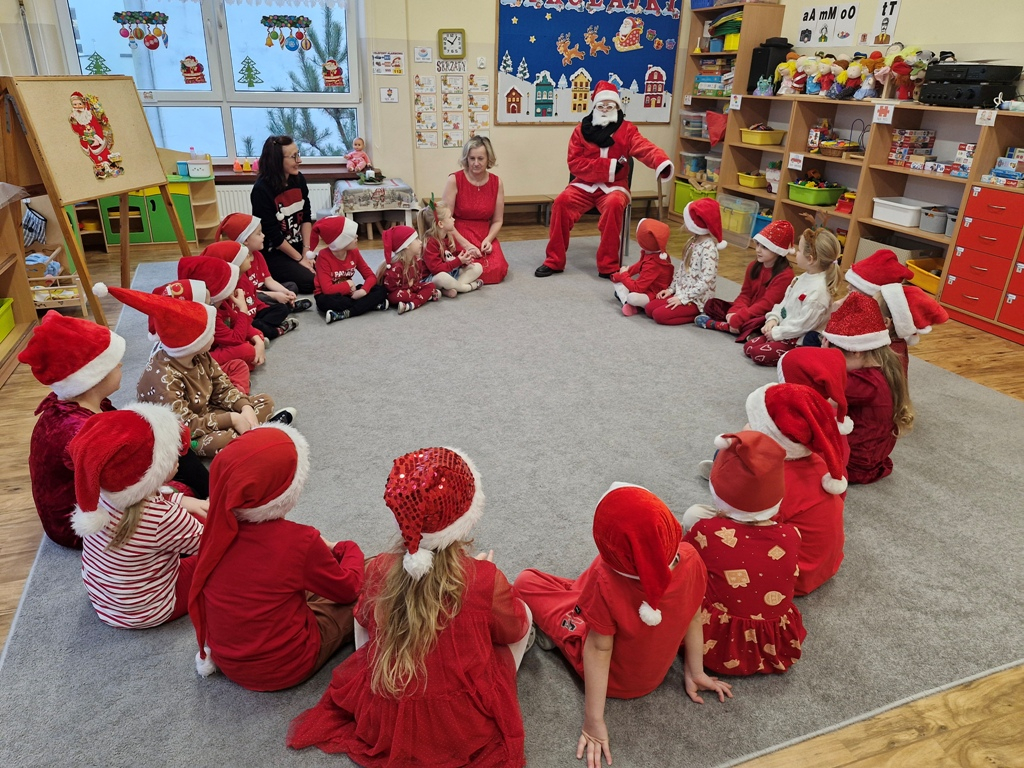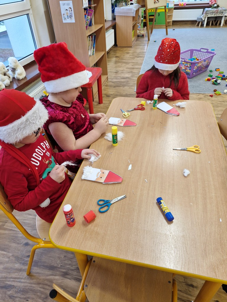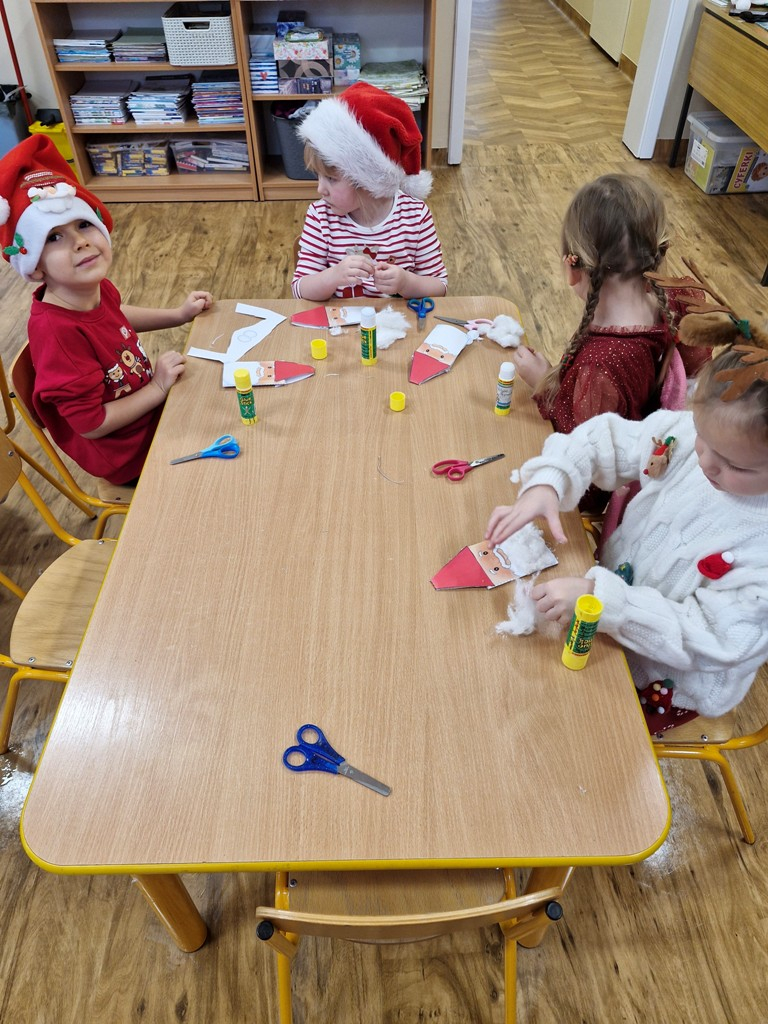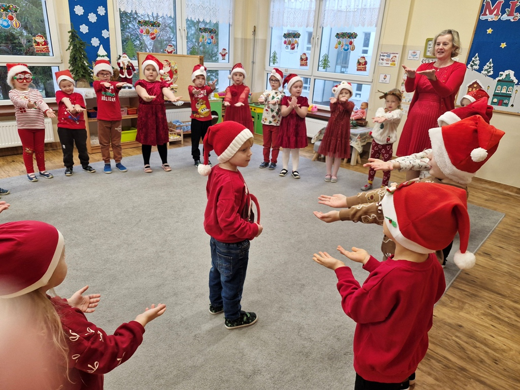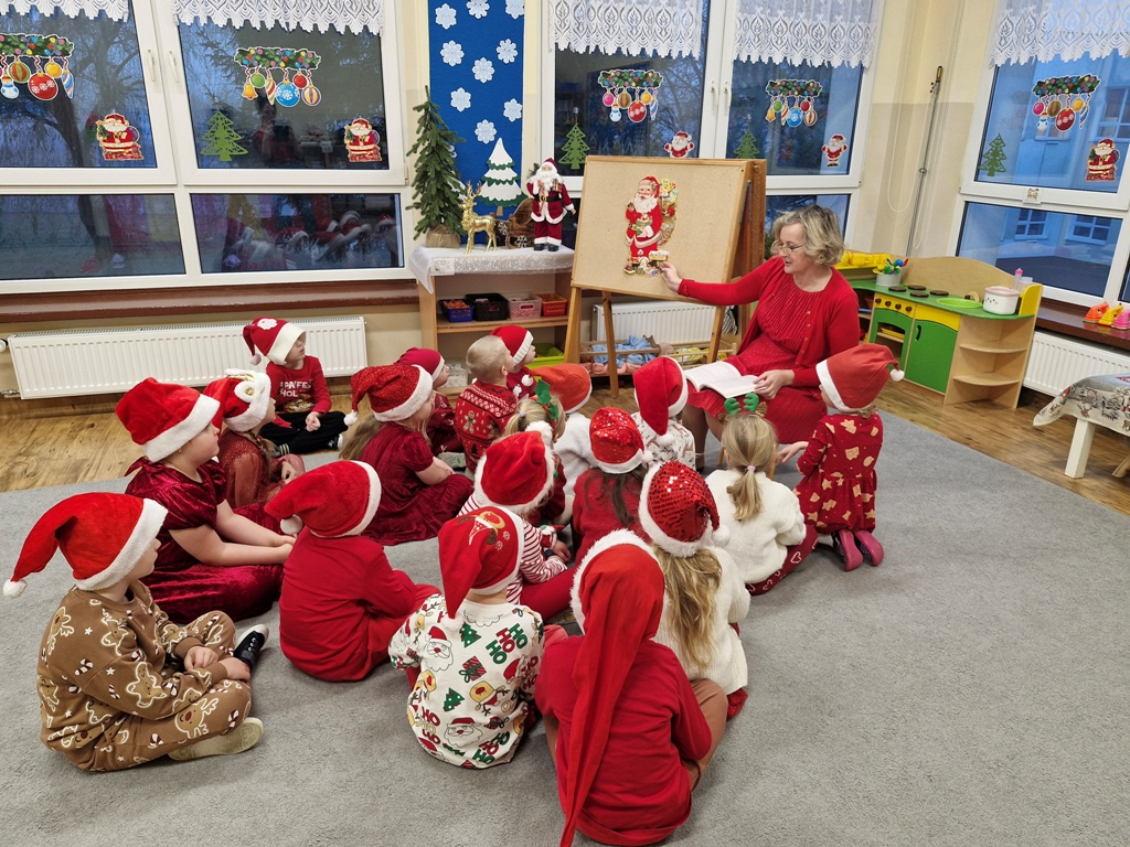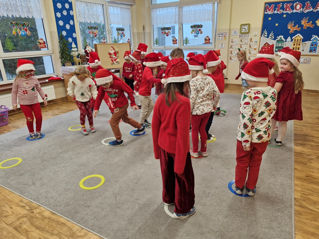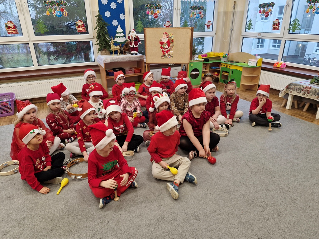 Mikołajki to święto długo oczekiwane przez wszystkie dzieci. W dniu 5 grudnia 2025 roku dzieci czekając na Mikołaja, uczestniczyły w różnych działaniach edukacyjnych. W czasie zajęć "Skrzaty" opisywały słownie wygląd postaci Mikołaja, opowiadały o swoich wymarzonych prezentach, a także usprawniały narządy artykulacyjne, słuchając opowiadania logopedycznego "Worek prezentów". Zanim Mikołaj zawitał do sali "Skrzatów" dzieci ilustrowały dźwiękami instrumentów muzycznych opowiadanie "Przyjazd Mikołaja", a także wchodziły w rolę Mikołaja, bawiąc się przy piosence Mikołaj. Wspólna zabawa ucichła, gdy z oddali dobiegł dźwięk dzwoneczka zwiastujący niecodziennego gościa. Odwiedziny Mikołaja sprawiły dzieciom wiele radosci. Po wspólnych rozmowach był czas na podziękowanie za upominki i wykonanie pamiątkowego zdjęcia. W tym dniu dzieci również uczestniczyły w zabawach ruchowych przy muzyce, a także wykonały piękne prace palstyczne przedstawiajace postać Mikołaja, które zostały zaprezentowane na gazetce. Dzieci z grupy "Skrzaty" serdecznie dziękują mamie Jagny za pomoc w organizacji święta.