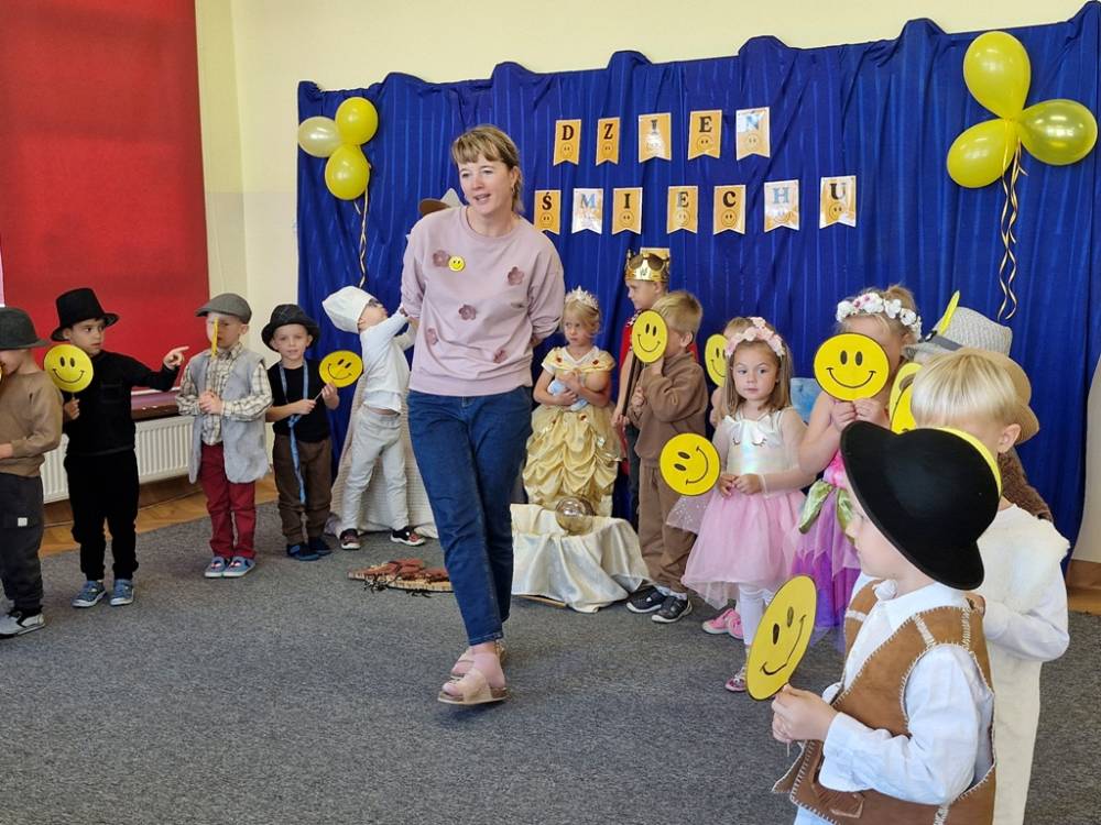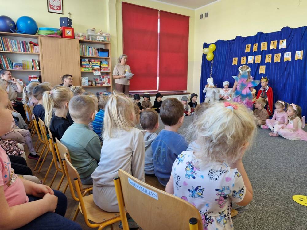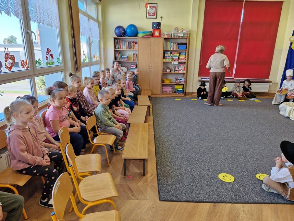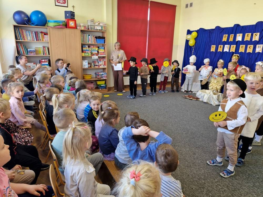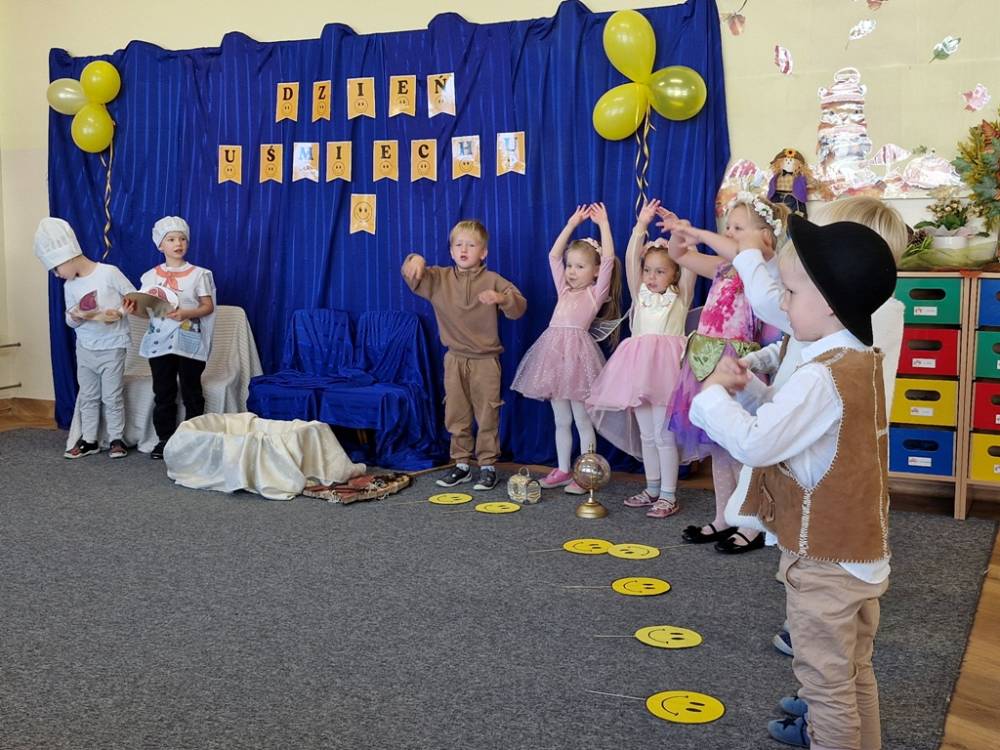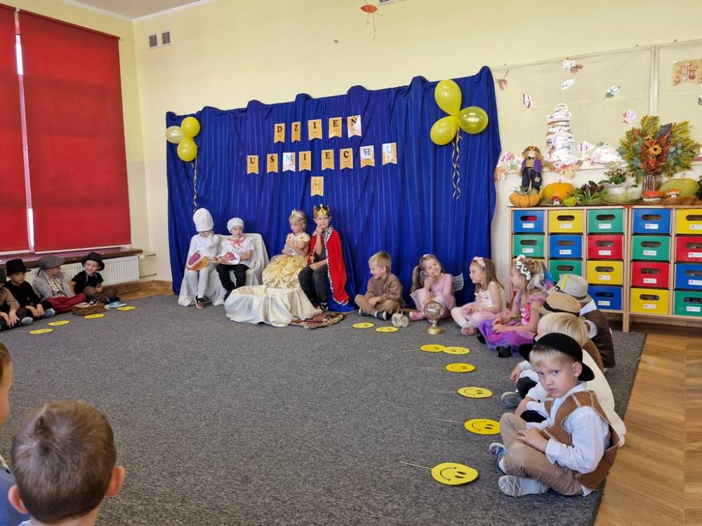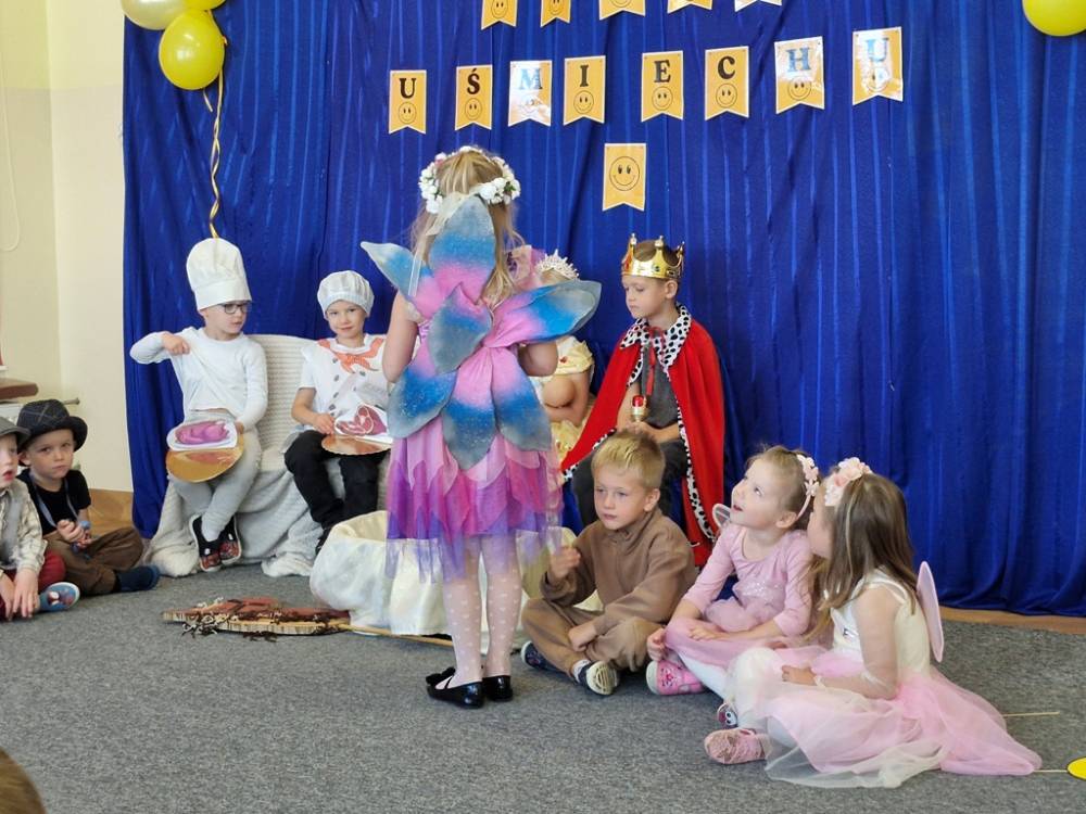 Z okazji Dnia Uśmiechu dzieci z grupy "Skrzaty" miały okazję obejrzeć w dniu 3 października 2025 roku przedstawienie "Usmiech królewny" w wykonaniu starszych przedszkolaków z grup "Zuchy" i "Motyle". Przedstawienie bylo okazją do doświadczania radości i usmiechu, o czym świadczyły miny dzieci oglądających bajkę. Na zakończenie dzieci podziękowały za zaproszenie i nagrodziły małych aktorów gromkimi brawami.