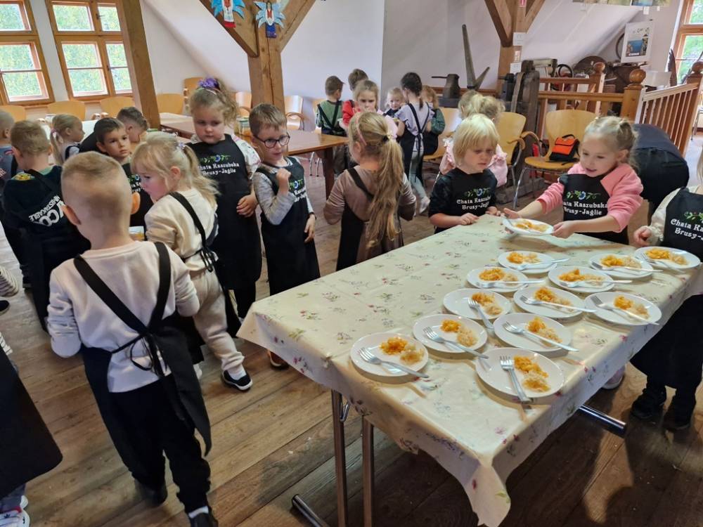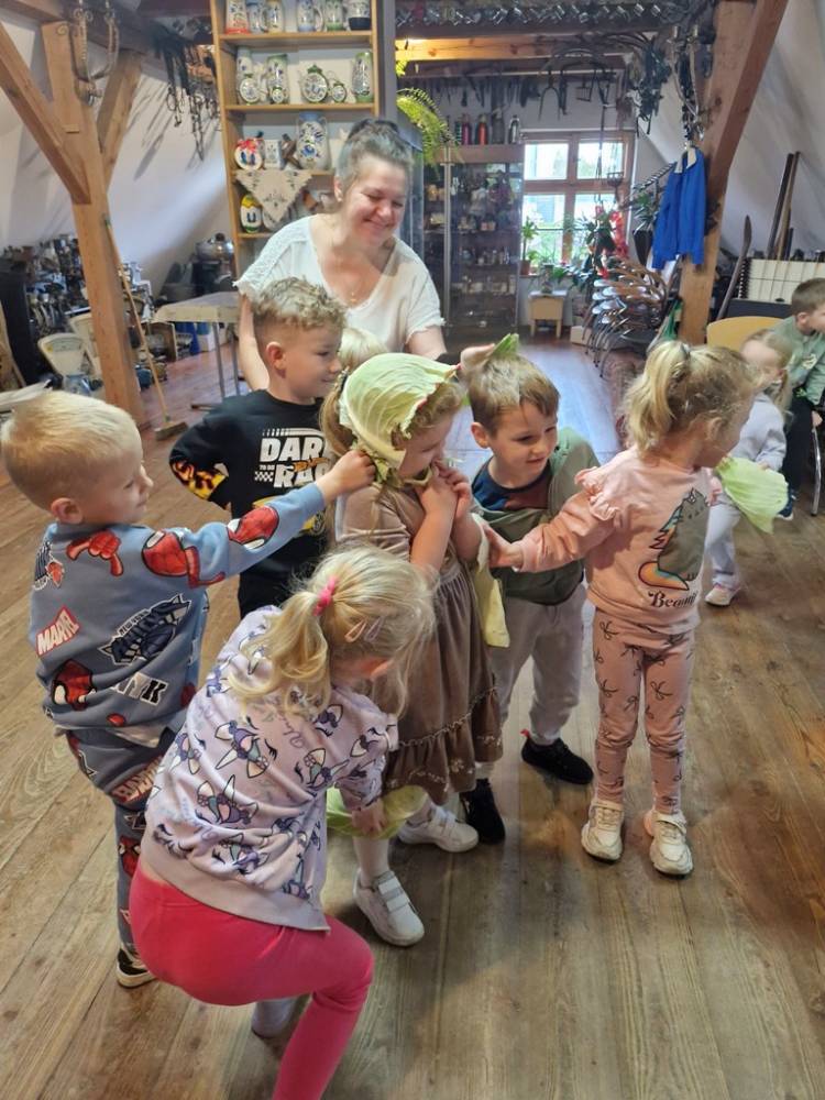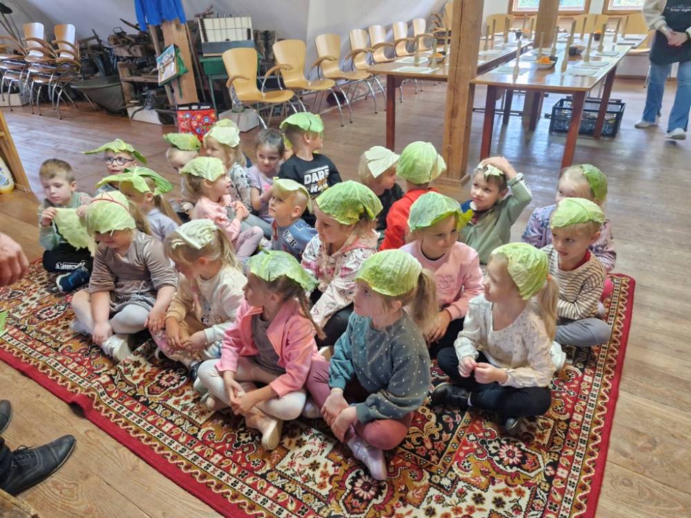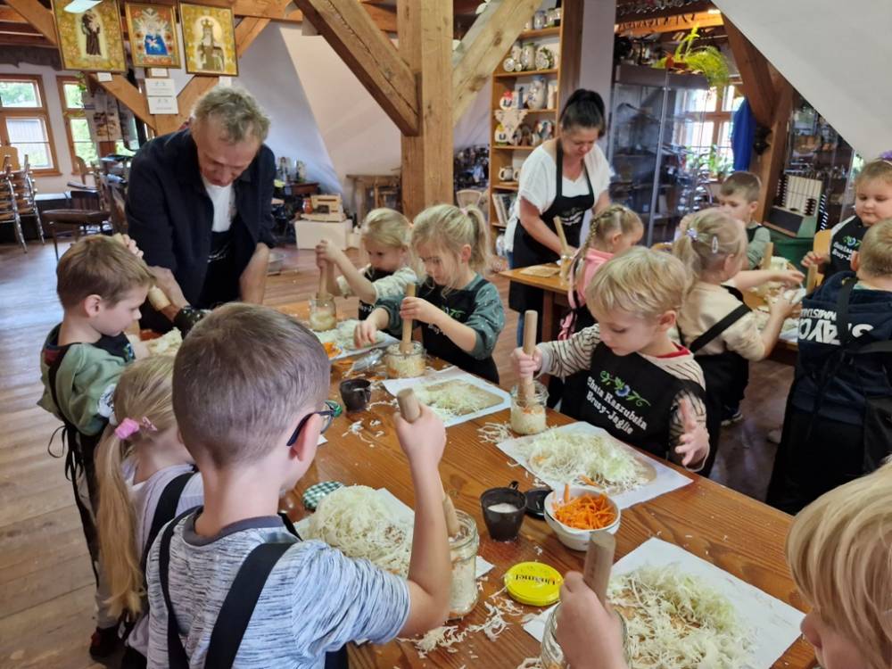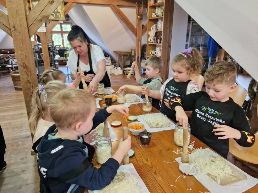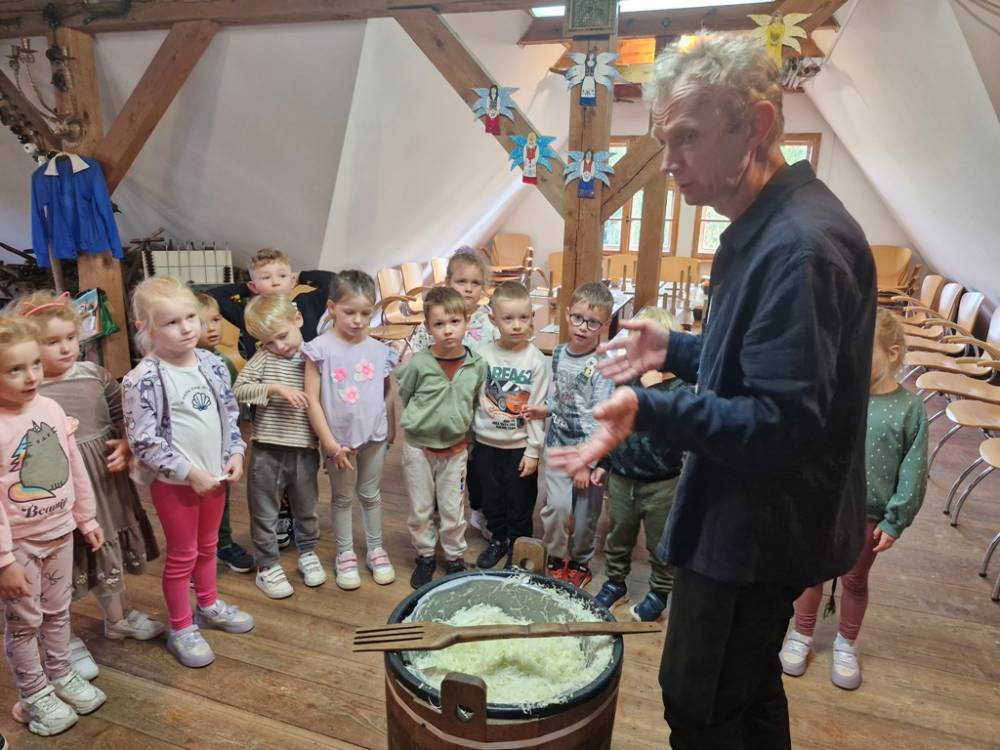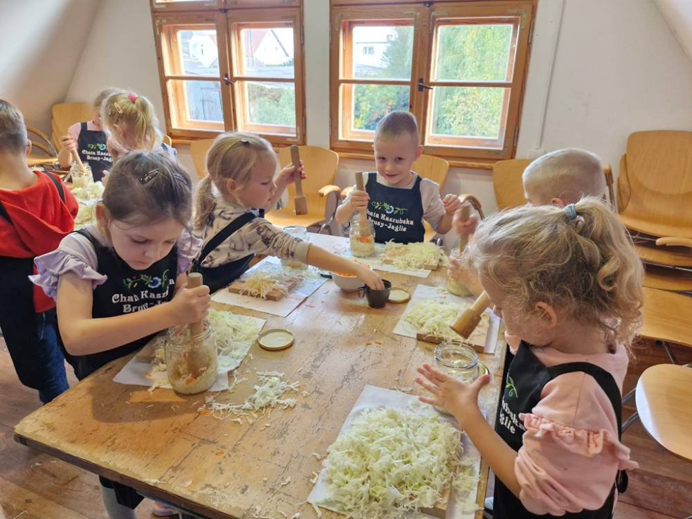 W dniu 10 października 2025 roku dzieci z grupy "Skrzaty" pojechały do Chaty Kaszubskiej, aby w praktyce poznać tradycyjny sposób kiszenia kapusty. Prowadzący warsztaty, Pan Krzysztof, zapoznał dzieci z warzywami kapustnymi i wykorzystaniem kapusty w leczeniu niektórych dolegliwości. Był też czas na zabawny relaks. Po założeniu "czapek" z listków kapusty zabrał dzieci w podróż "latającym" dywanem. Każde dziecko "lecąc wysoko", poczuło powiew delikatnego wiatru. Po zabawie dzieci oglądały naczynia i narzędzia wykorzystywane dawniej do kiszenia kapusty. Dużym wyzwaniem dla każdego dziecka i sprawdzianem siły było szatkowanie kapusty szatkownicą. Po umyciu rąk i założeniu fartuszków dzieci wkładały do słoików pokrojoną kapustę,a następnie ubijały trampkiem, pamiętając o dodaniu marchwi i soli. Tak przygotowaną kapustę zabrały do domu, aby po ukiszeniu zrobić z niej smaczną surówkę. Na zakończenie "kapuścianej przygody" dzieci smakowały surówki z kiszonej kapusty i z dodatkiem jabłka. Za mile spędzony czas, zdobytą w praktyczny sposób wiedzę dzieci z grupy "Skrzaty" podziękowały pracownikom Chaty Kaszubskiej (Pani Dorocie i Panu Krzysztofowi) piosenką "Kapuściana piosenka".