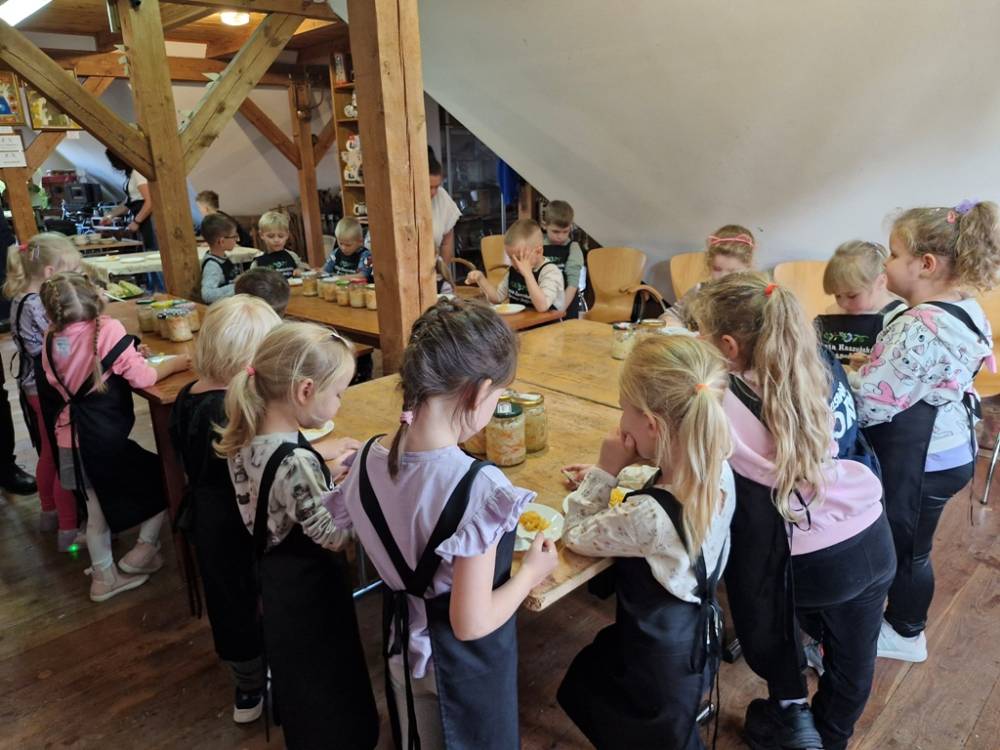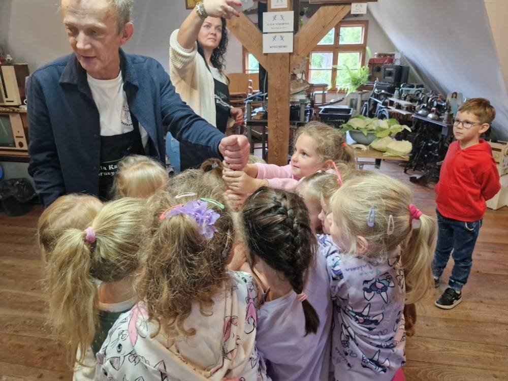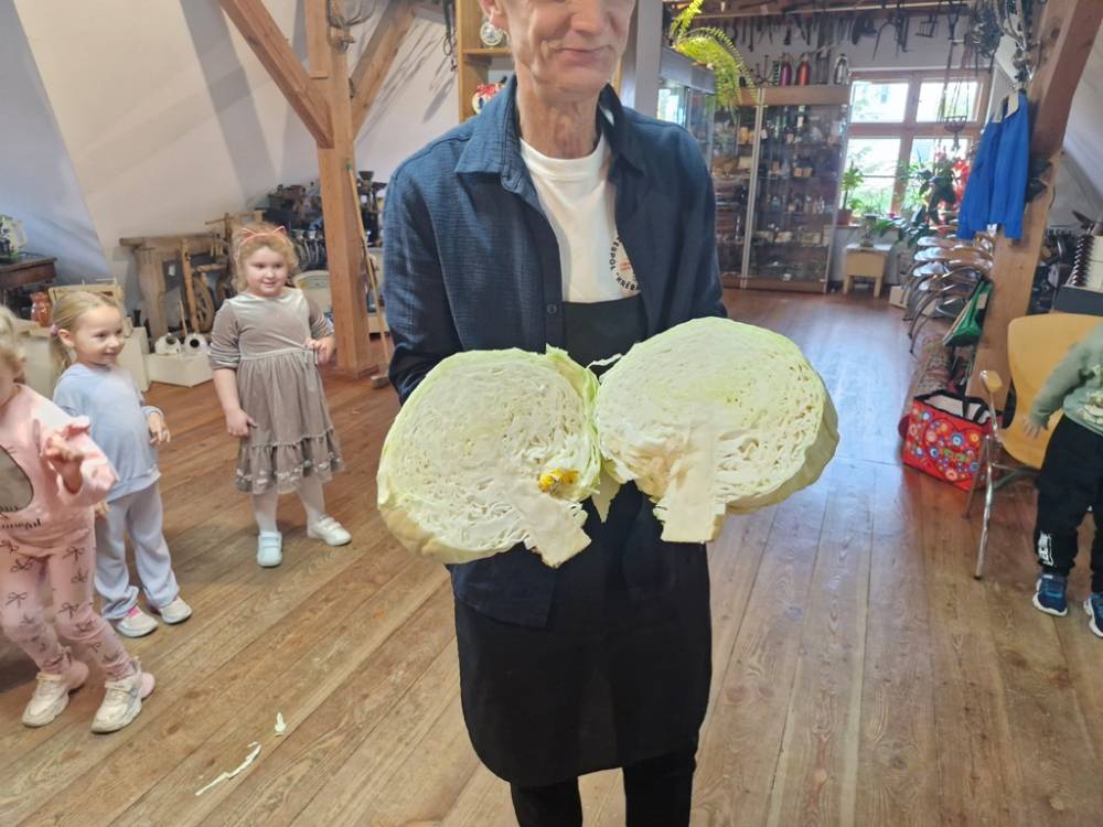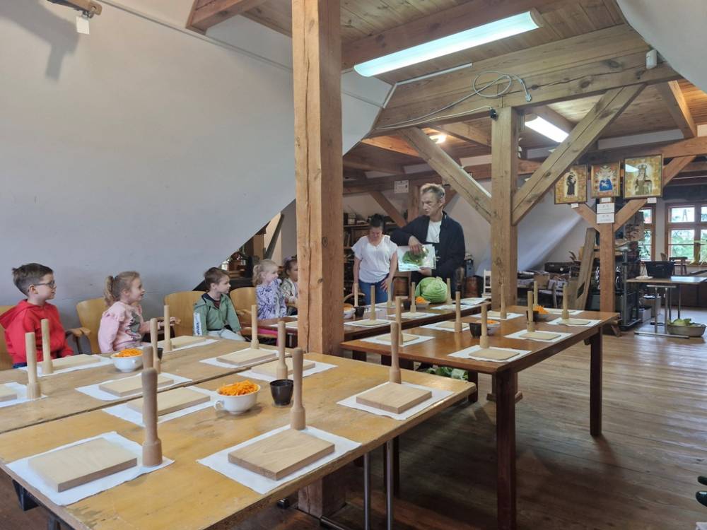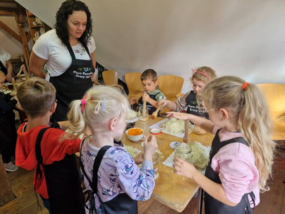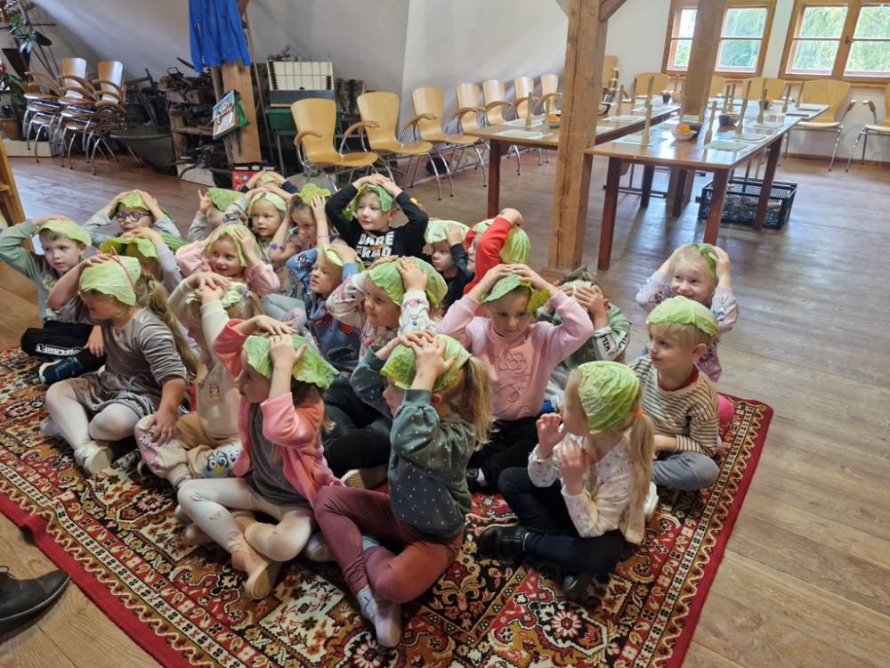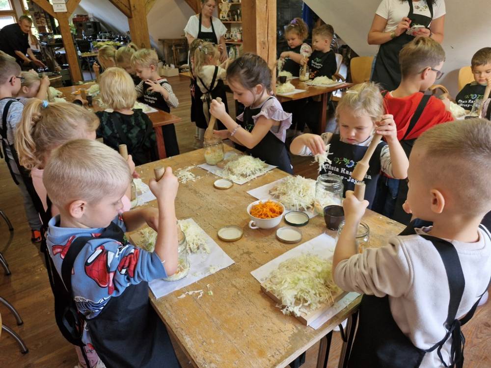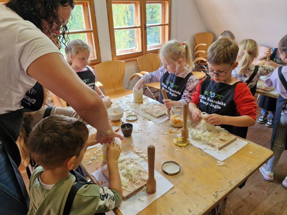 W dniu 10 października 2025 roku dzieci z grupy "Skrzaty" pojechały do Chaty Kaszubskiej, aby w praktyce poznać tradycyjny sposób kiszenia kapusty. Prowadzący warsztaty, Pan Krzysztof, zapoznał dzieci z warzywami kapustnymi i wykorzystaniem kapusty w leczeniu niektórych dolegliwości. Był też czas na zabawny relaks. Po założeniu "czapek" z listków kapusty zabrał dzieci w podróż "latającym" dywanem. Każde dziecko "lecąc wysoko", poczuło powiew delikatnego wiatru. Po zabawie dzieci oglądały naczynia i narzędzia wykorzystywane dawniej do kiszenia kapusty. Dużym wyzwaniem dla każdego dziecka i sprawdzianem siły było szatkowanie kapusty szatkownicą. Po umyciu rąk i założeniu fartuszków dzieci wkładały do słoików pokrojoną kapustę,a następnie ubijały trampkiem, pamiętając o dodaniu marchwi i soli. Tak przygotowaną kapustę zabrały do domu, aby po ukiszeniu zrobić z niej smaczną surówkę. Na zakończenie "kapuścianej przygody" dzieci smakowały surówki z kiszonej kapusty i z dodatkiem jabłka. Za mile spędzony czas, zdobytą w praktyczny sposób wiedzę dzieci z grupy "Skrzaty" podziękowały pracownikom Chaty Kaszubskiej (Pani Dorocie i Panu Krzysztofowi) piosenką "Kapuściana piosenka".