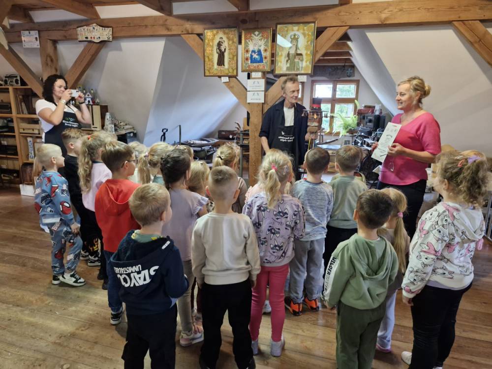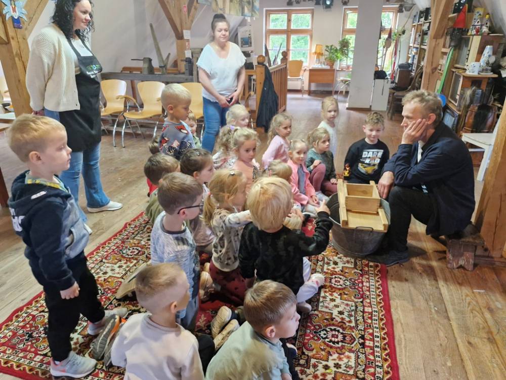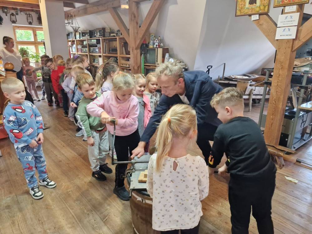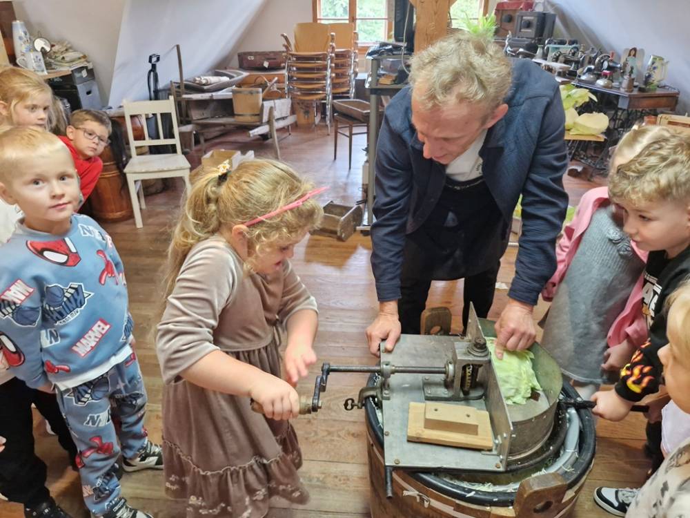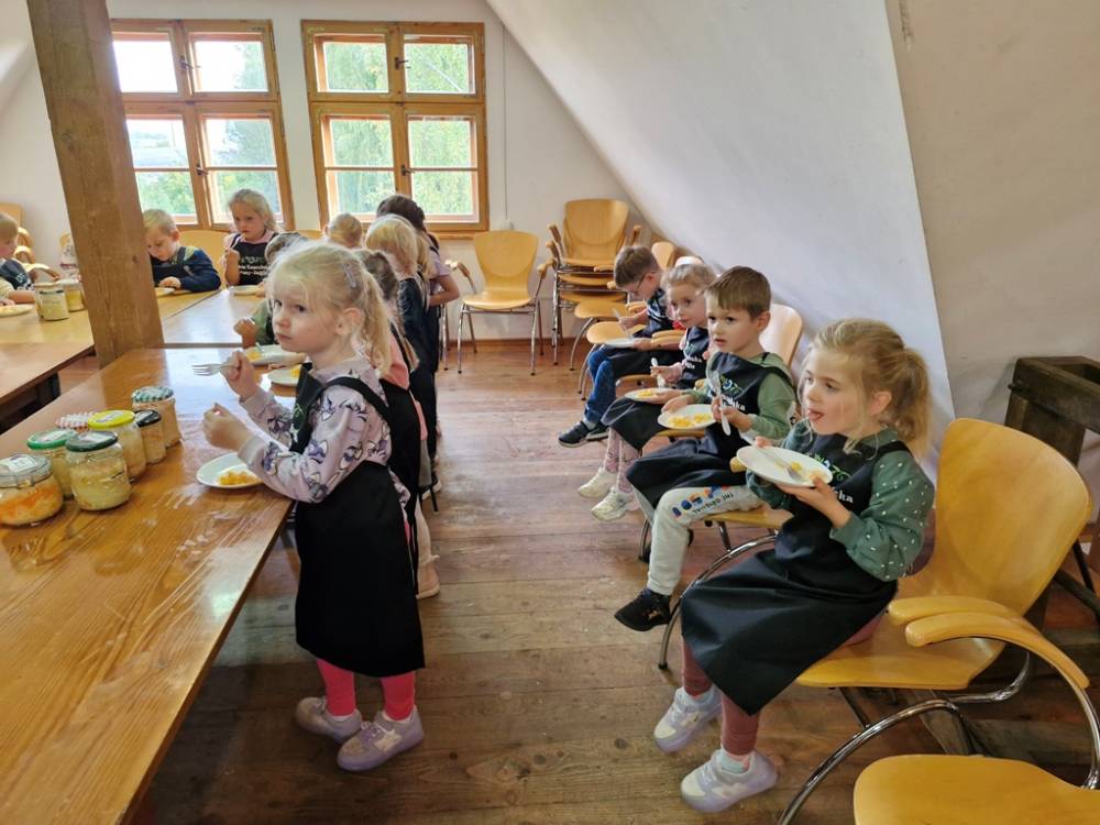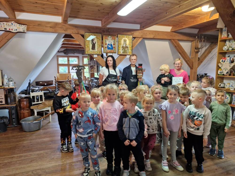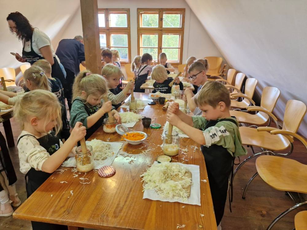 W dniu 10 października 2025 roku dzieci z grupy "Skrzaty" pojechały do Chaty Kaszubskiej, aby w praktyce poznać tradycyjny sposób kiszenia kapusty. Prowadzący warsztaty, Pan Krzysztof, zapoznał dzieci z warzywami kapustnymi i wykorzystaniem kapusty w leczeniu niektórych dolegliwości. Był też czas na zabawny relaks. Po założeniu "czapek" z listków kapusty zabrał dzieci w podróż "latającym" dywanem. Każde dziecko "lecąc wysoko", poczuło powiew delikatnego wiatru. Po zabawie dzieci oglądały naczynia i narzędzia wykorzystywane dawniej do kiszenia kapusty. Dużym wyzwaniem dla każdego dziecka i sprawdzianem siły było szatkowanie kapusty szatkownicą. Po umyciu rąk i założeniu fartuszków dzieci wkładały do słoików pokrojoną kapustę,a następnie ubijały trampkiem, pamiętając o dodaniu marchwi i soli. Tak przygotowaną kapustę zabrały do domu, aby po ukiszeniu zrobić z niej smaczną surówkę. Na zakończenie "kapuścianej przygody" dzieci smakowały surówki z kiszonej kapusty i z dodatkiem jabłka. Za mile spędzony czas, zdobytą w praktyczny sposób wiedzę dzieci z grupy "Skrzaty" podziękowały pracownikom Chaty Kaszubskiej (Pani Dorocie i Panu Krzysztofowi) piosenką "Kapuściana piosenka".
