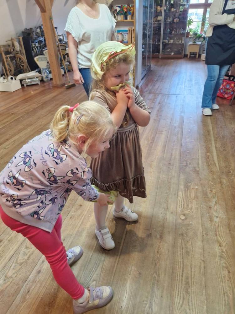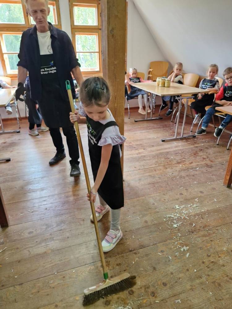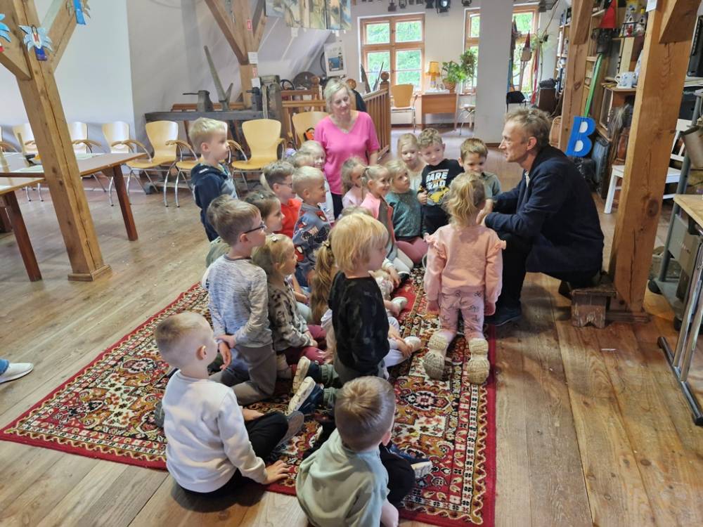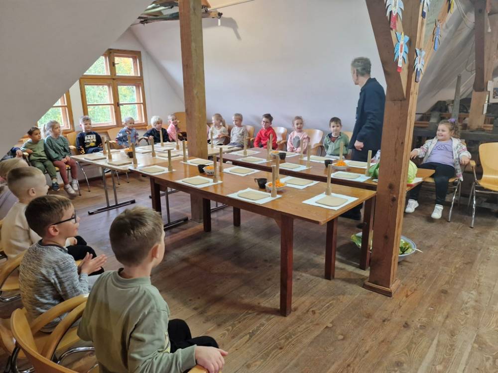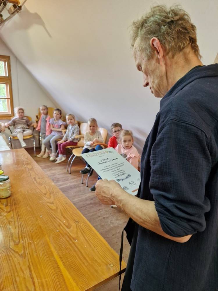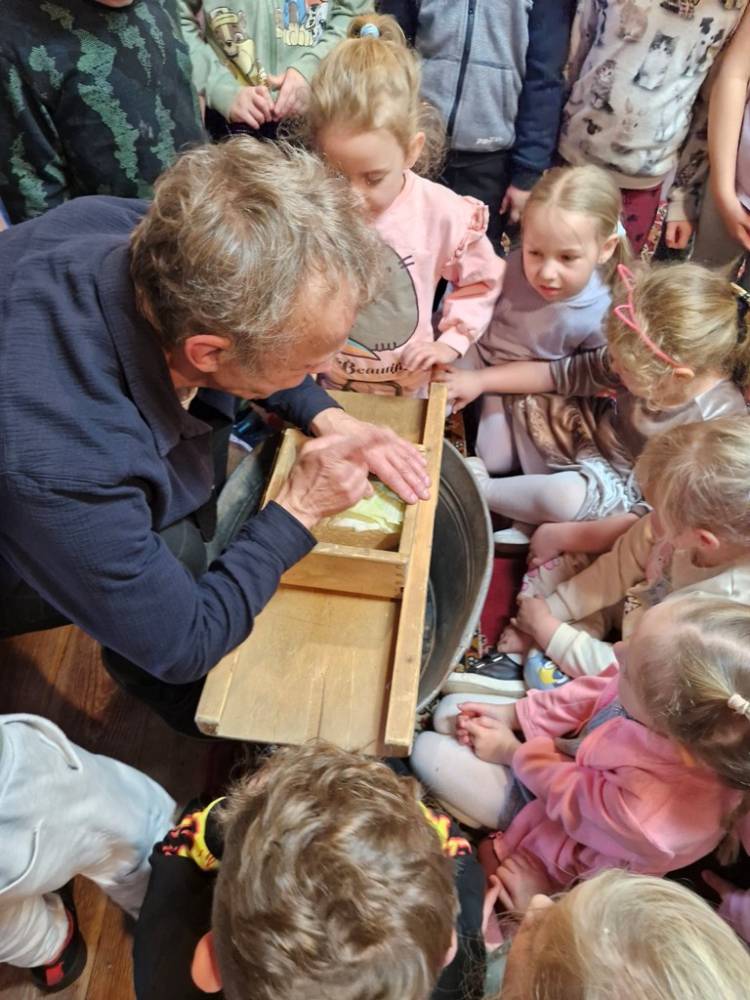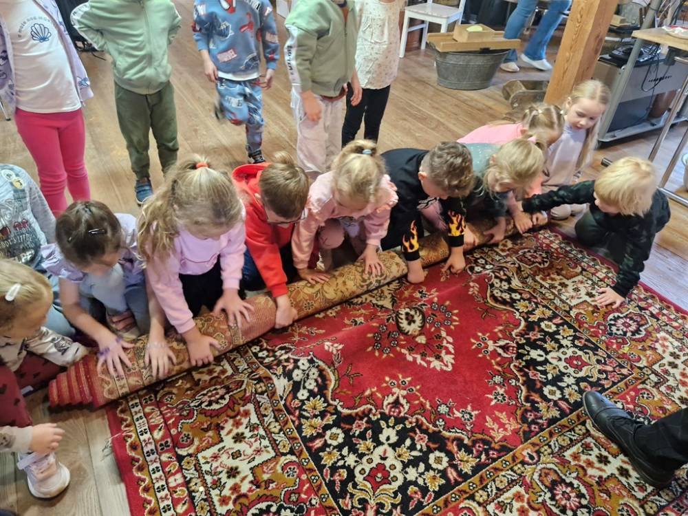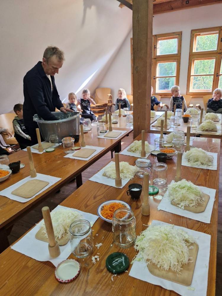 W dniu 10 października 2025 roku dzieci z grupy "Skrzaty" pojechały do Chaty Kaszubskiej, aby w praktyce poznać tradycyjny sposób kiszenia kapusty. Prowadzący warsztaty, Pan Krzysztof, zapoznał dzieci z warzywami kapustnymi i wykorzystaniem kapusty w leczeniu niektórych dolegliwości. Był też czas na zabawny relaks. Po założeniu "czapek" z listków kapusty zabrał dzieci w podróż "latającym" dywanem. Każde dziecko "lecąc wysoko", poczuło powiew delikatnego wiatru. Po zabawie dzieci oglądały naczynia i narzędzia wykorzystywane dawniej do kiszenia kapusty. Dużym wyzwaniem dla każdego dziecka i sprawdzianem siły było szatkowanie kapusty szatkownicą. Po umyciu rąk i założeniu fartuszków dzieci wkładały do słoików pokrojoną kapustę,a następnie ubijały trampkiem, pamiętając o dodaniu marchwi i soli. Tak przygotowaną kapustę zabrały do domu, aby po ukiszeniu zrobić z niej smaczną surówkę. Na zakończenie "kapuścianej przygody" dzieci smakowały surówki z kiszonej kapusty i z dodatkiem jabłka. Za mile spędzony czas, zdobytą w praktyczny sposób wiedzę dzieci z grupy "Skrzaty" podziękowały pracownikom Chaty Kaszubskiej (Pani Dorocie i Panu Krzysztofowi) piosenką "Kapuściana piosenka".