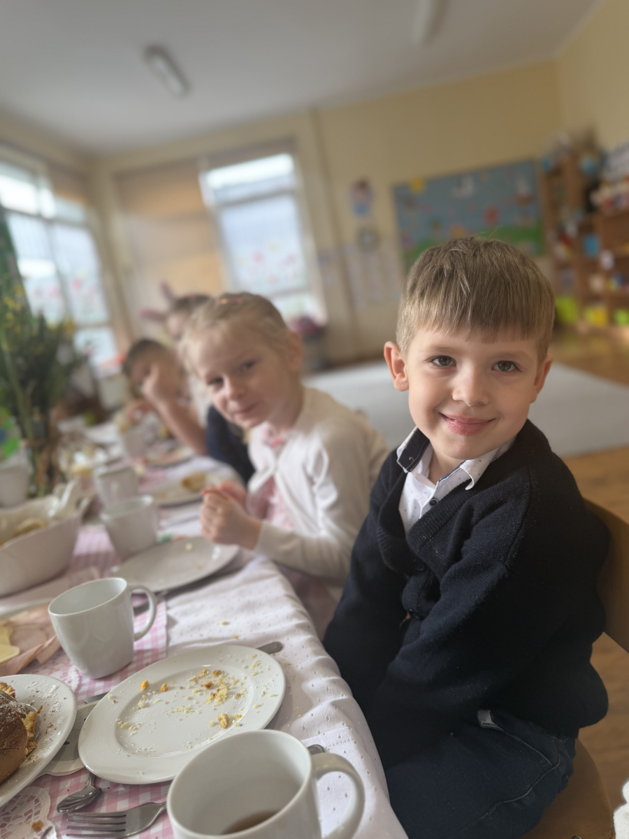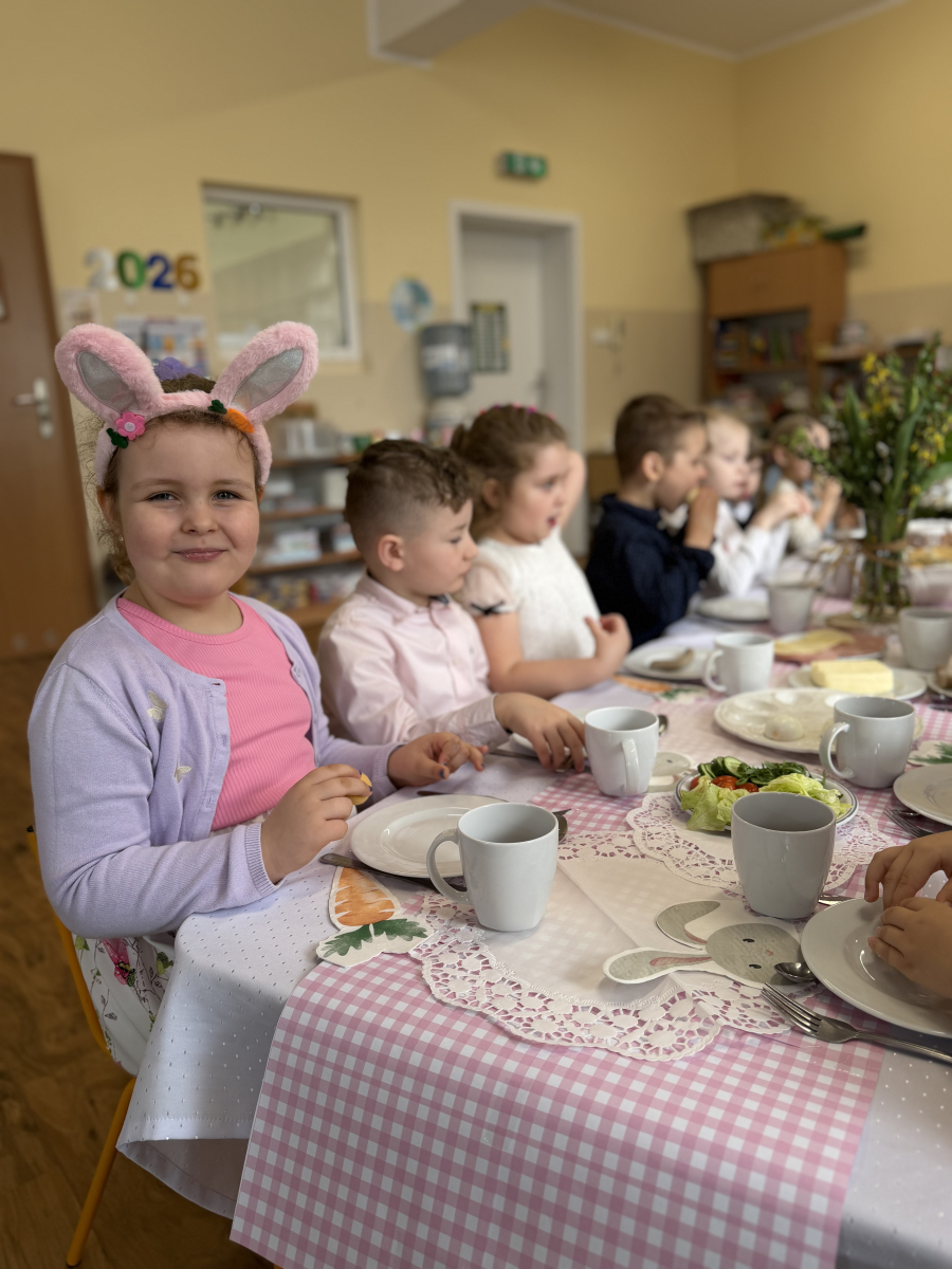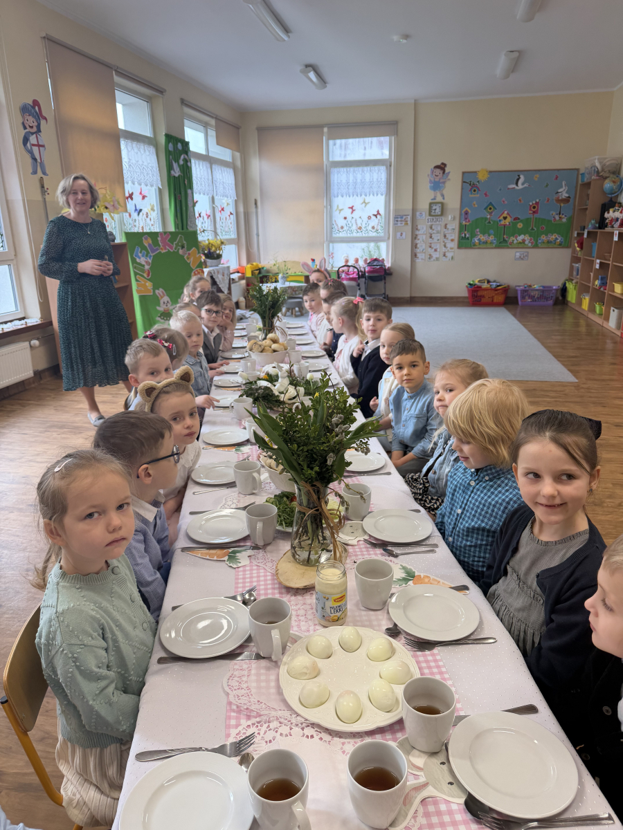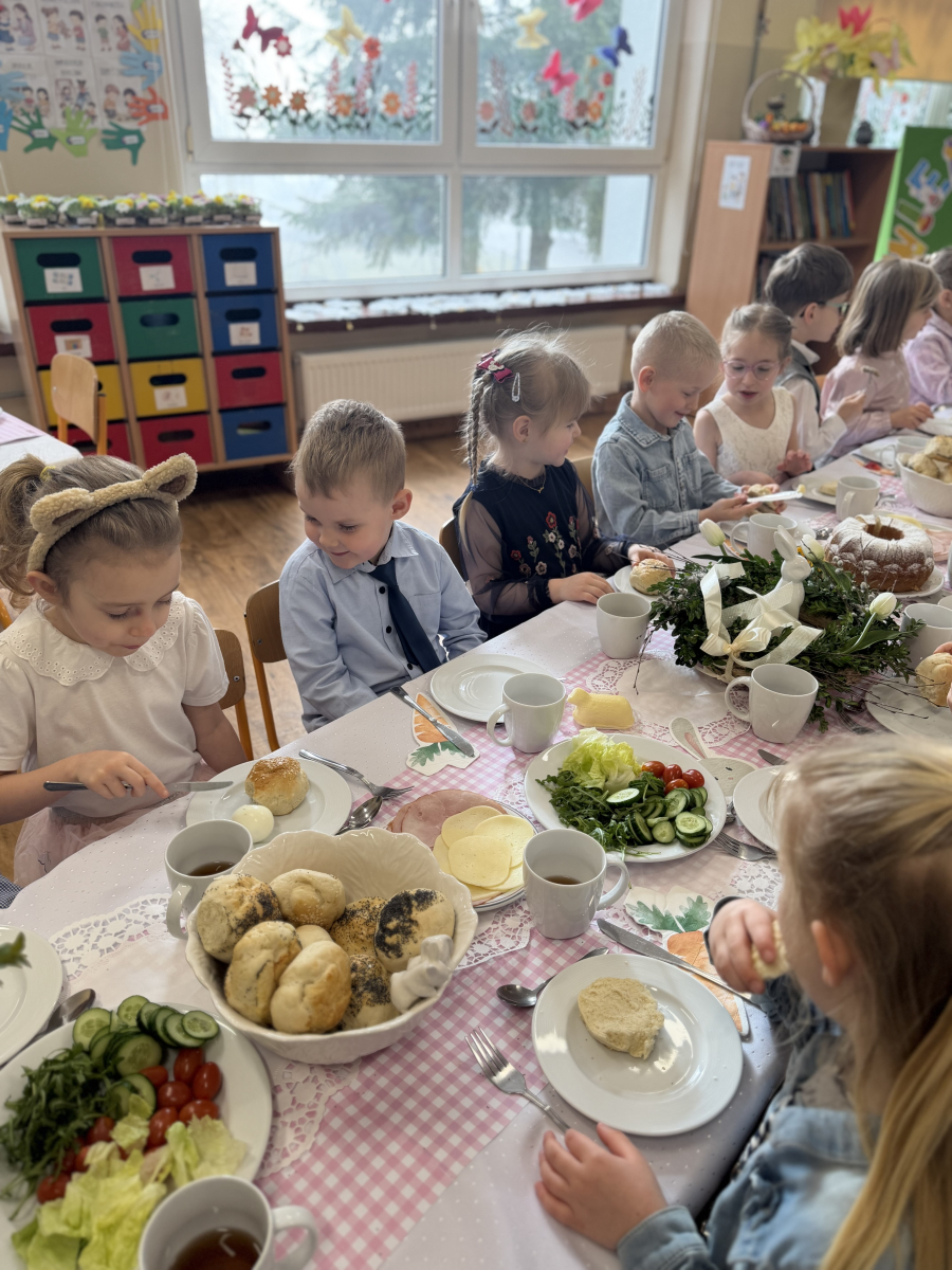 Kulminacyjnym momentem tych dni było Wielkanocne śniadanie. W odświętnych strojach dzieci usiadły przy stole przygotowanym wspólnie z rodzicami. Na stołach znalazły się wędliny, jajka, babki i sery – wszystko zgodnie z wielkanocną tradycją. Serdeczne podziękowania kierujemy do rodziców, którzy wsparli nas w przygotowaniach i zapewnili smaczne potrawy, dzięki czemu śniadanie było wyjątkowe i pełne radości.