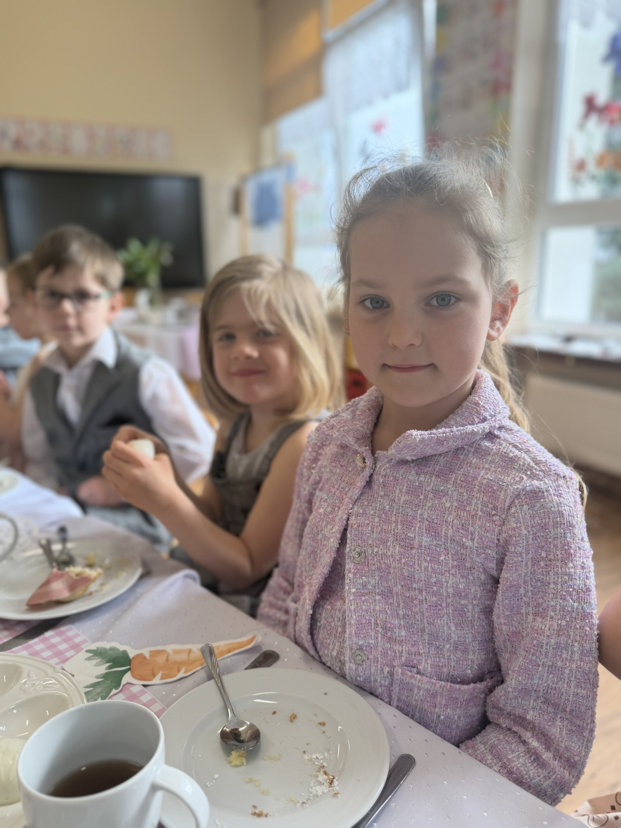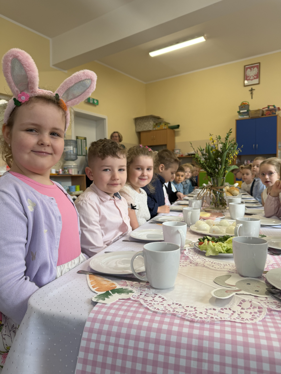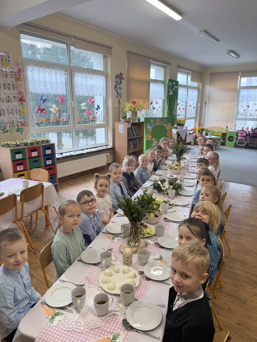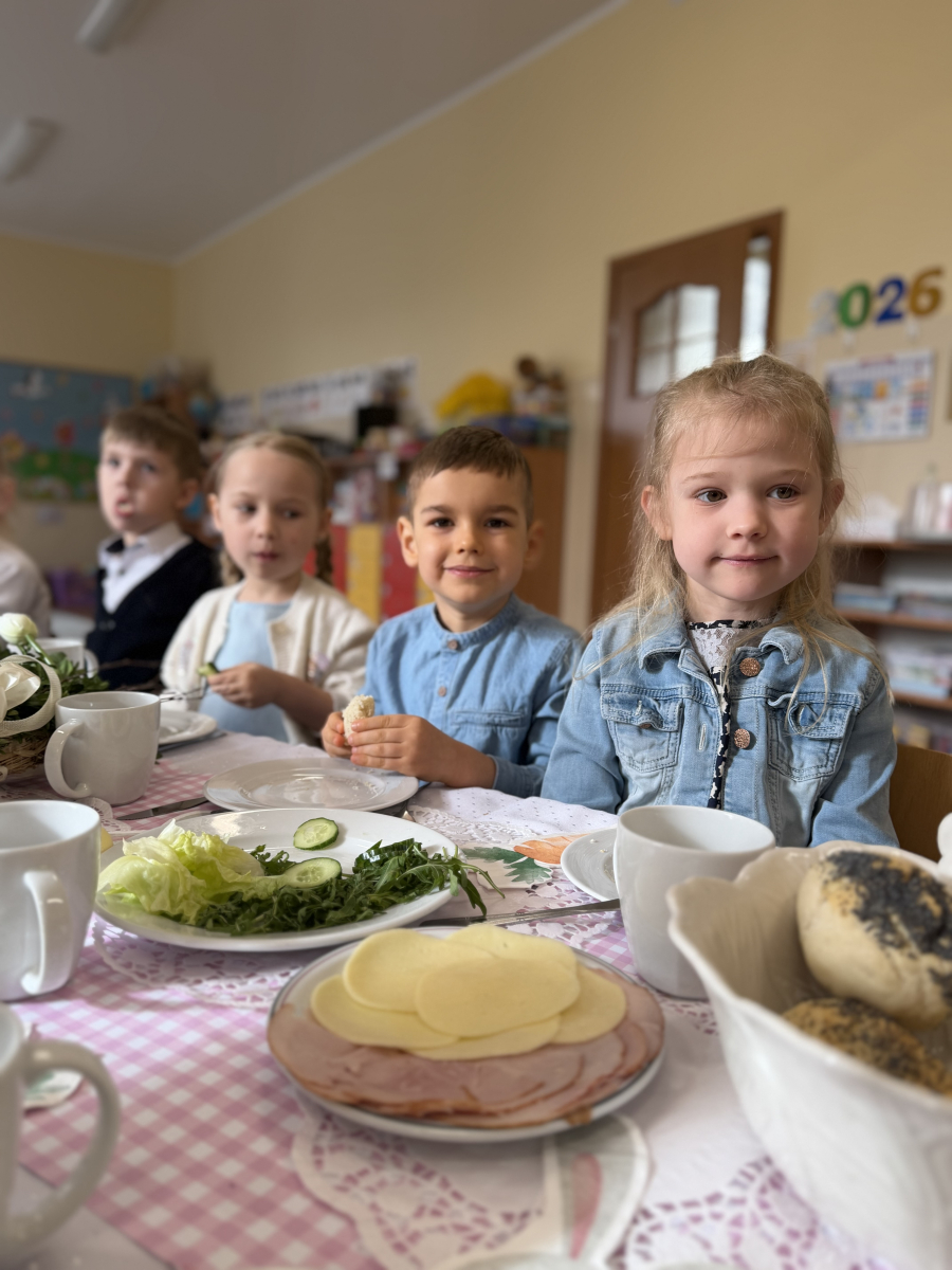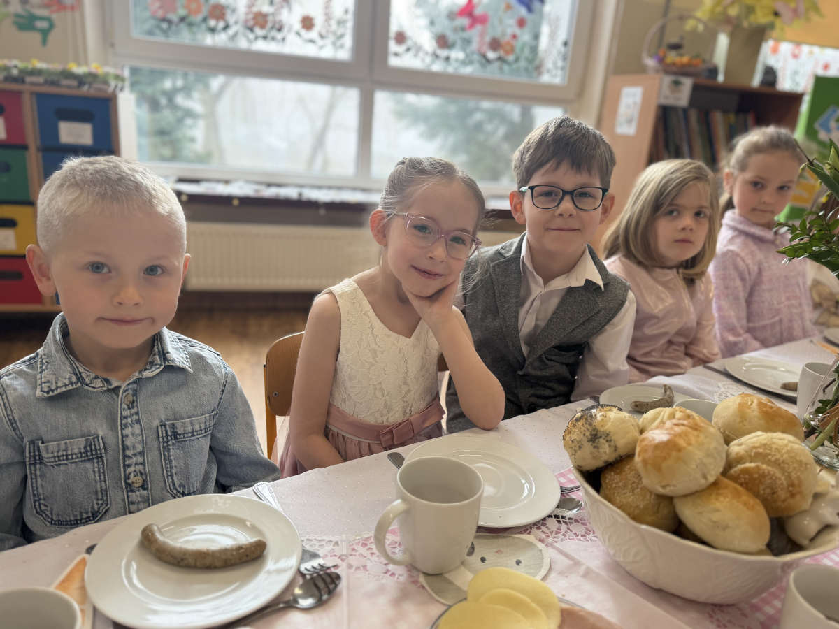 Kulminacyjnym momentem tych dni było Wielkanocne śniadanie. W odświętnych strojach dzieci usiadły przy stole przygotowanym wspólnie z rodzicami. Na stołach znalazły się wędliny, jajka, babki i sery – wszystko zgodnie z wielkanocną tradycją. Serdeczne podziękowania kierujemy do rodziców, którzy wsparli nas w przygotowaniach i zapewnili smaczne potrawy, dzięki czemu śniadanie było wyjątkowe i pełne radości.