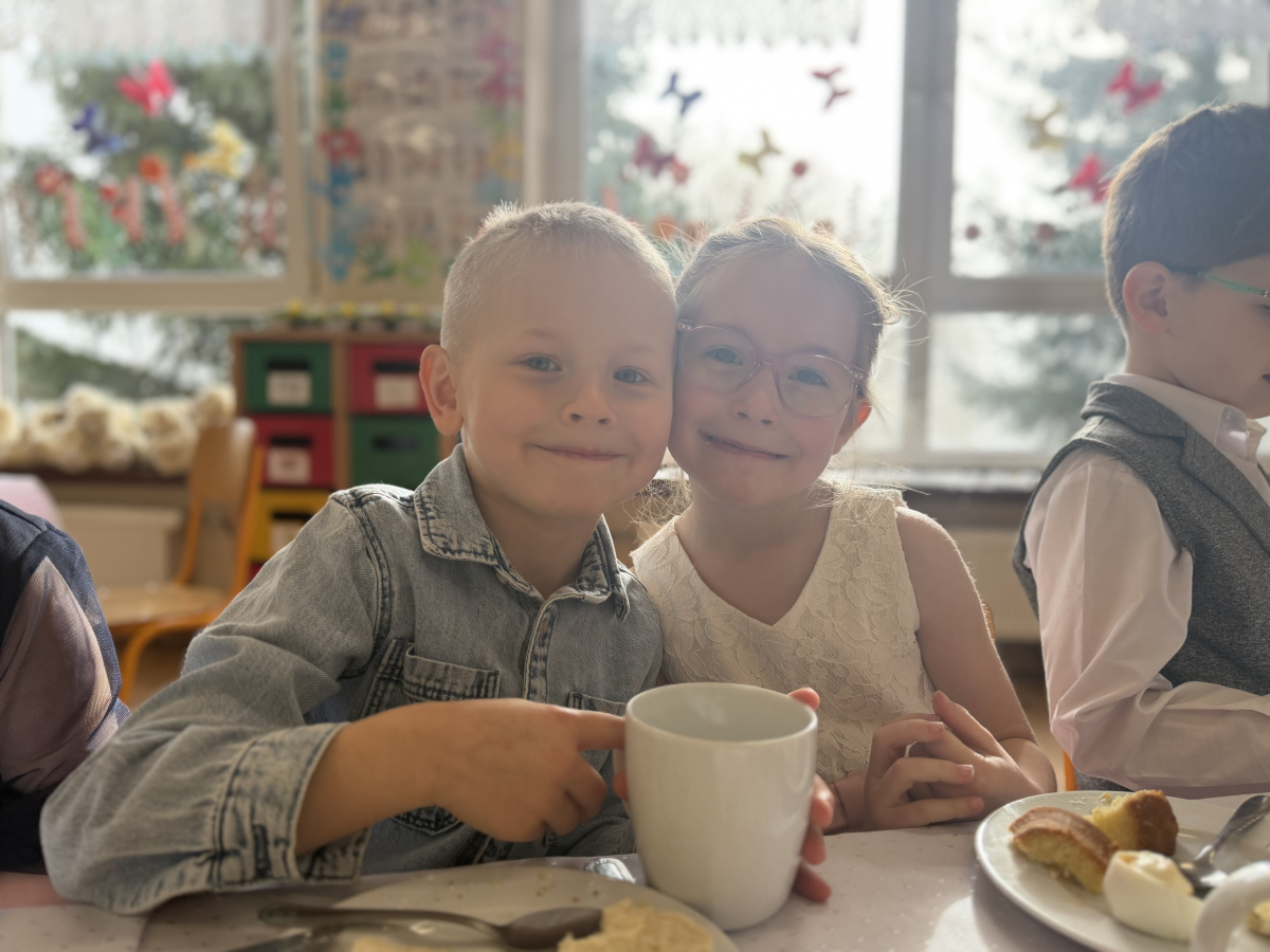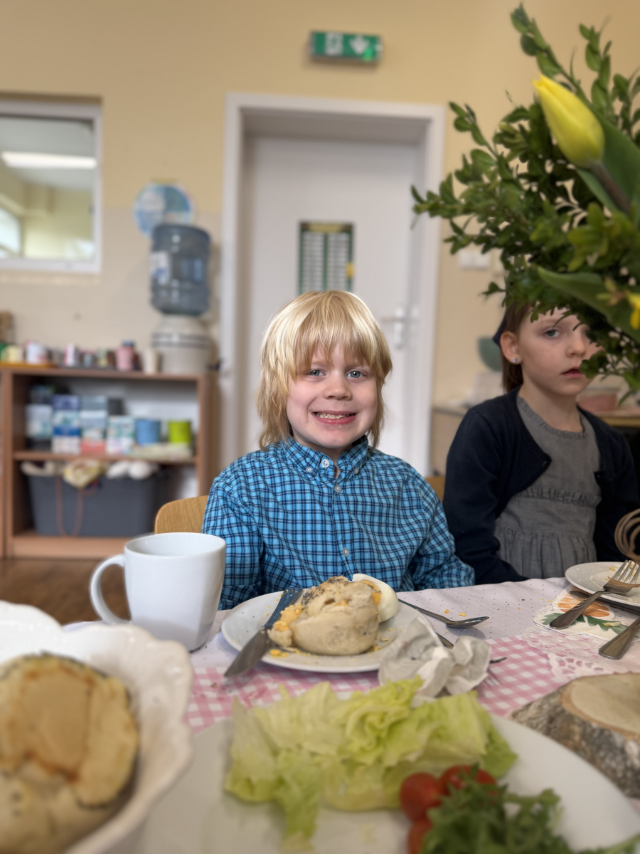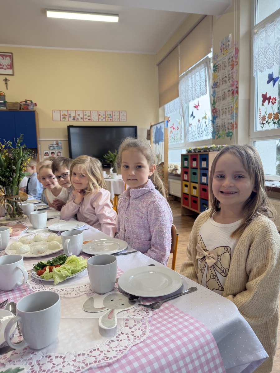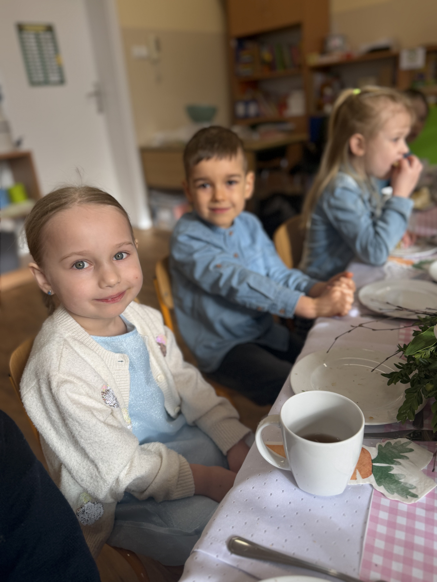 Przed rozpoczęciem posiłku Pani Marysia wygłosiła krótkie przemówienie, składając dzieciom serdeczne życzenia – życzyła im zdrowia, radości, uśmiechu każdego dnia oraz wspaniałych, pełnych ciepła Świąt Wielkanocnych. Dzieci z uwagą słuchały słów wychowawczyni, a atmosfera przy stole była ciepła i pełna wzajemnej życzliwości.