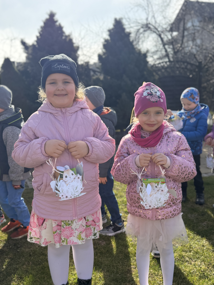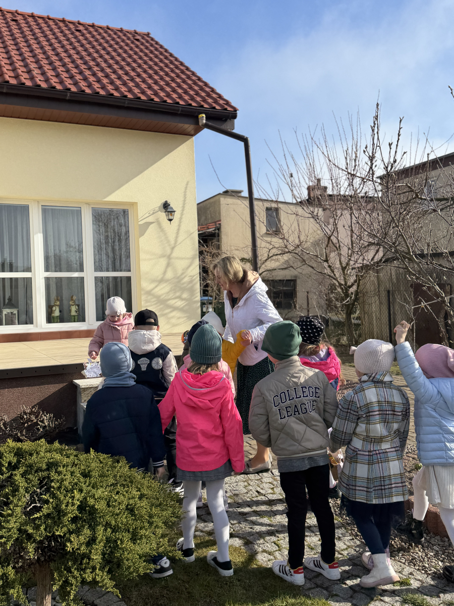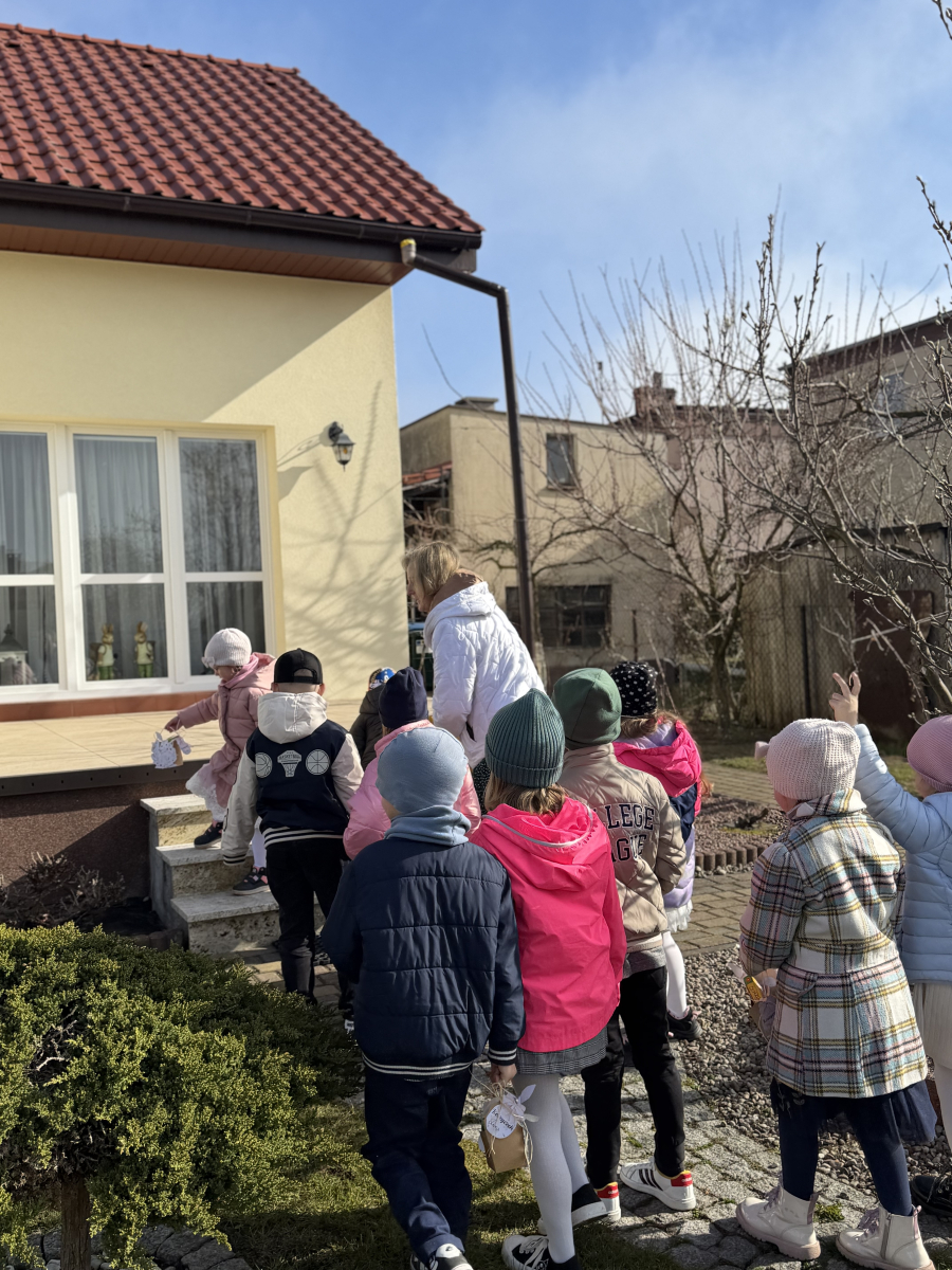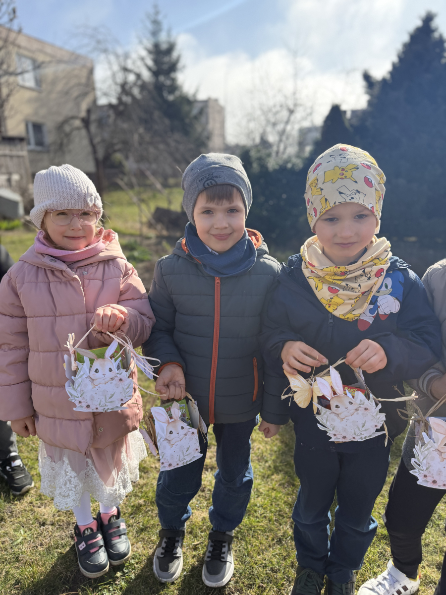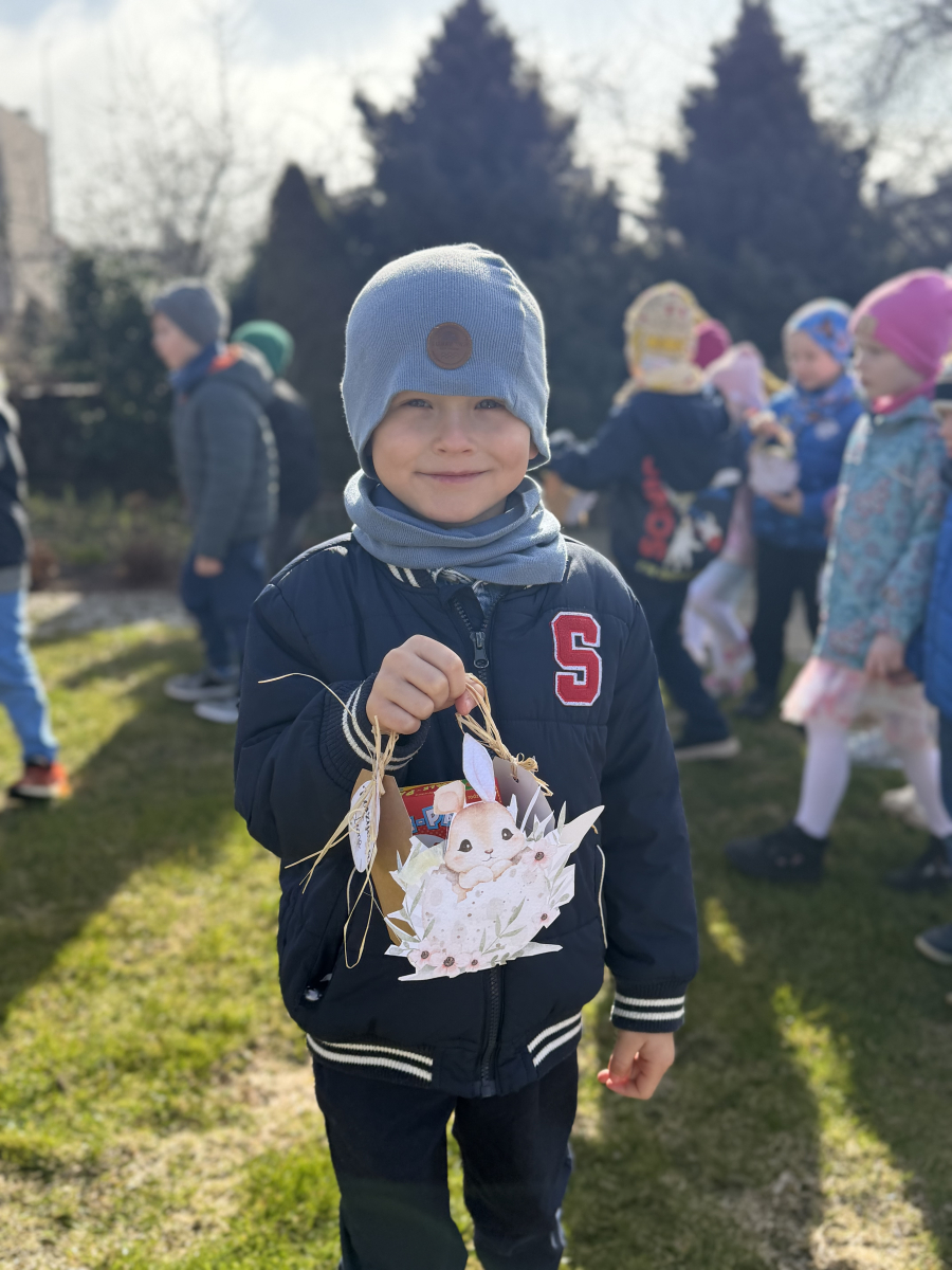 Po śniadaniu przedszkolaki wyruszyły na wesołe poszukiwanie śladów Wielkanocnego Zajączka. Tropy prowadziły je do ogródka Pani Marysi, gdzie czekały przygotowane dla dzieci prezenty. Radość, ekscytacja i uśmiechy towarzyszyły każdemu krokowi, a wspólna zabawa pokazała, jak wielką frajdę sprawia odkrywanie świątecznych niespodzianek.