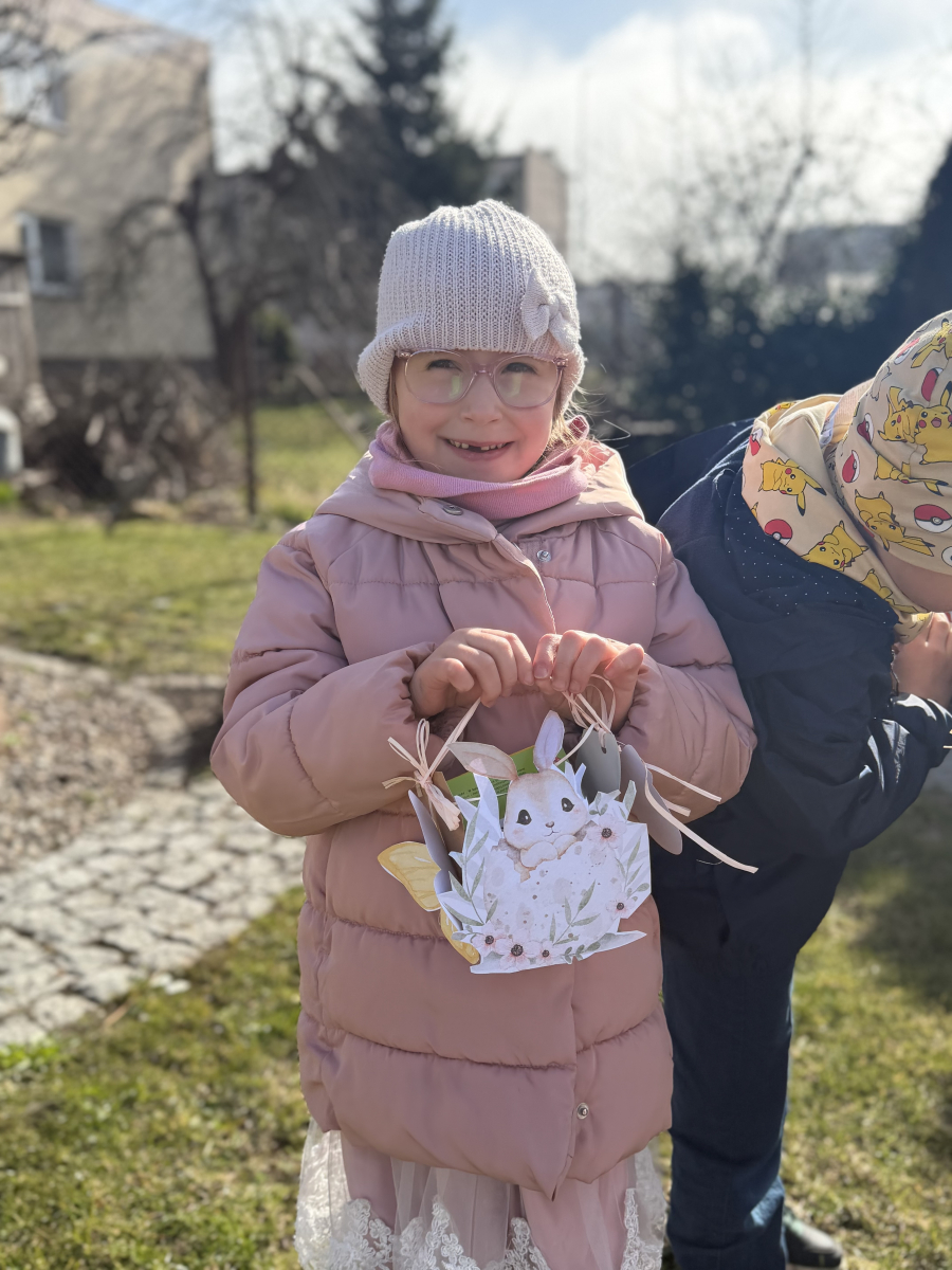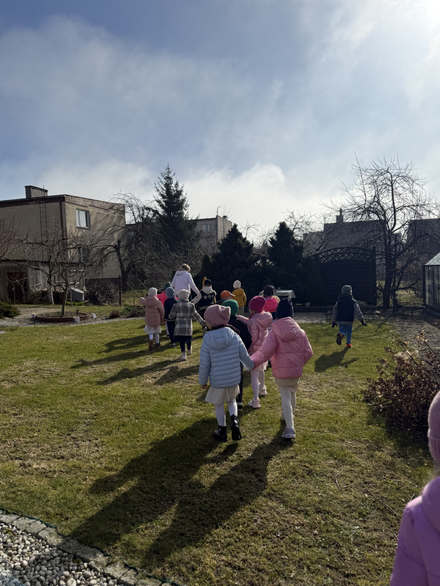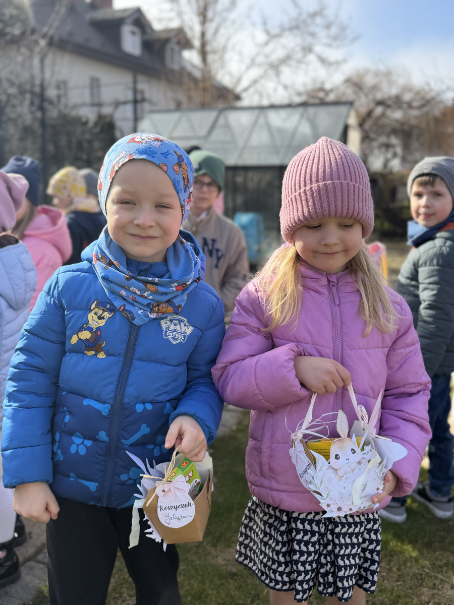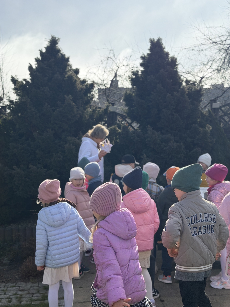 Po śniadaniu przedszkolaki wyruszyły na wesołe poszukiwanie śladów Wielkanocnego Zajączka. Tropy prowadziły je do ogródka Pani Marysi, gdzie czekały przygotowane dla dzieci prezenty. Radość, ekscytacja i uśmiechy towarzyszyły każdemu krokowi, a wspólna zabawa pokazała, jak wielką frajdę sprawia odkrywanie świątecznych niespodzianek.