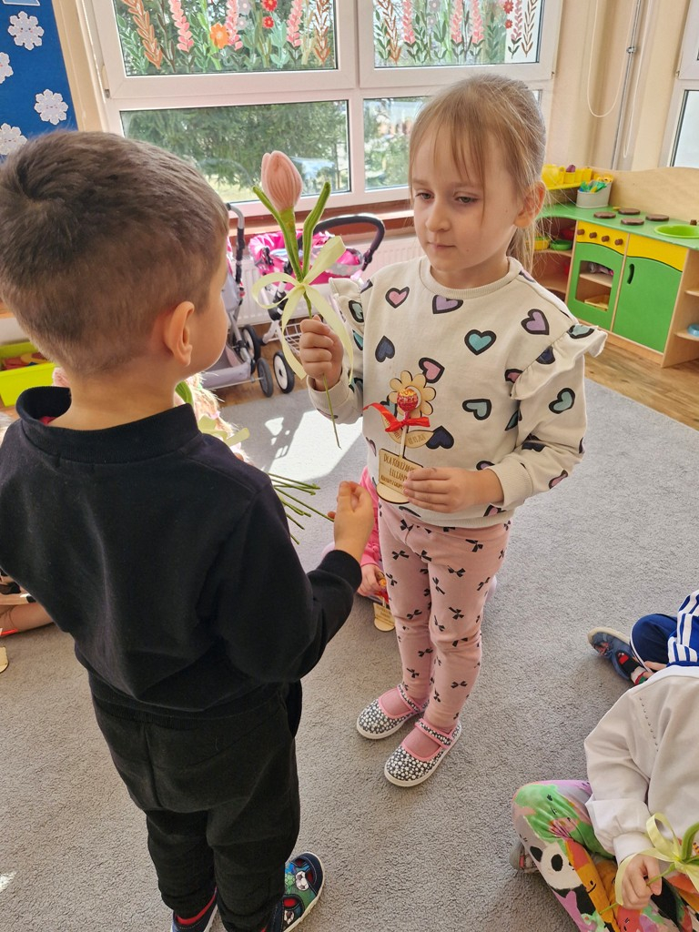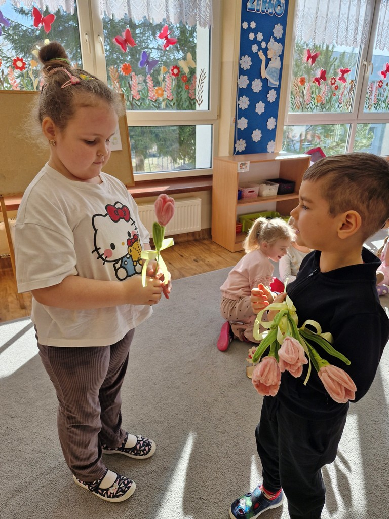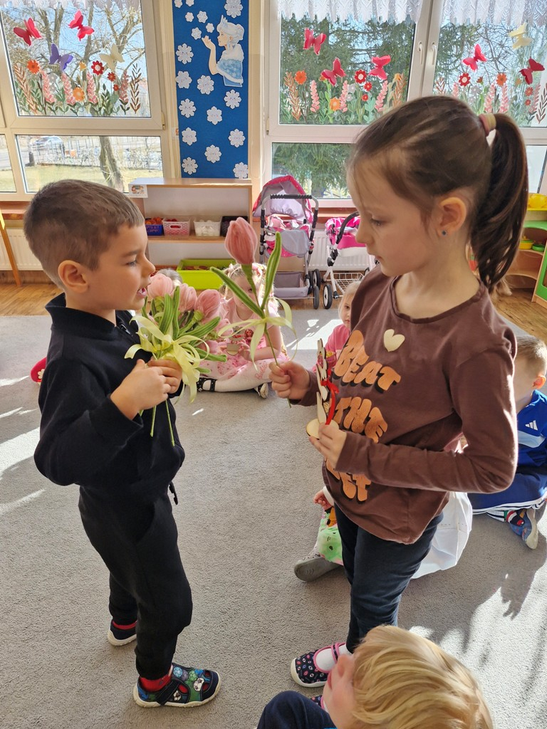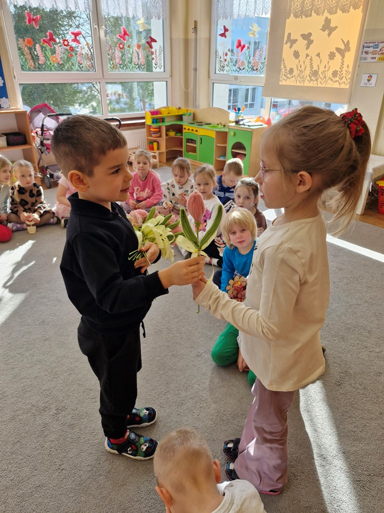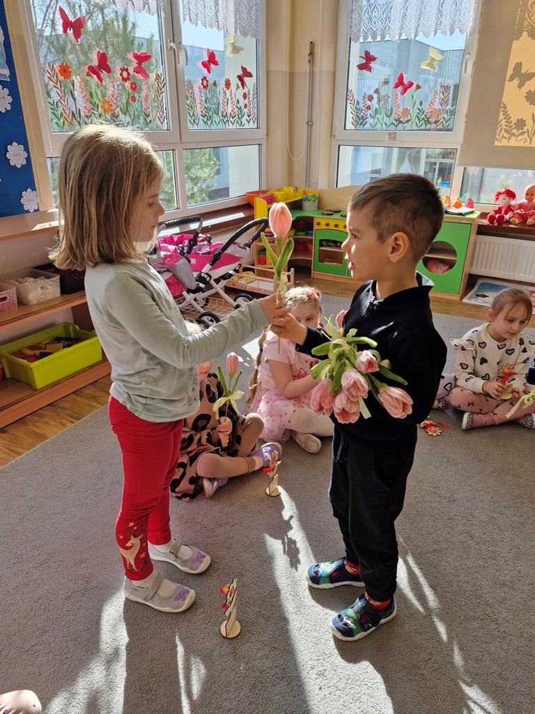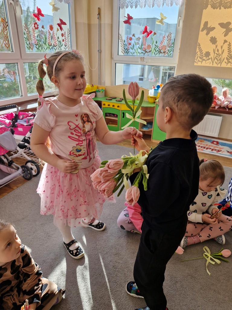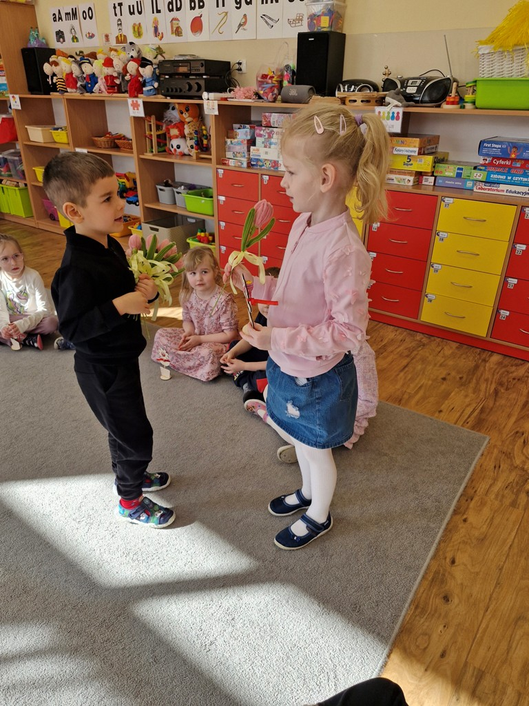 8 marca to wyjątkowy dzień w roku, gdyż swoje święto obchodzą wszystkie kobiety, zarówno te duże, jak i małe. W tym szczególnym dniu dzieci bawiły się przy piosence Słoneczne życzenia, wcielając się w role solistów, a także bawiły się przy muzyce. Wszyscy chłopcy skladali dziewczynkom życzenia, wręczając im kwiatki wykonane z drewna, a kolega Szymon podarował każdej dziewczynce tulipana wykonanego z drucika kreatywnego. Radość i uśmiech towarzyszyły dziewczynkom w tym świątecznym dniu. Dziewczynki równiez obdarowały chłopców upominkami, wręczajac im drewniane rakiety z lizakami z okazj Dnia Mężczyzny przypadajacego dwa dni później. Przedszkolaki pamiętały również o swoich mamach, przygotowując na zajeciach plastycznych niespodziankę - obrazek na ścianę z okazj Dnia Kobiet. Panie i dziewczynki serdecznie dziękują chłopcom za życzenia, kwiaty i promienny uśmiech. Dziękujemy również Pani Kasi - mamie Julki za przygotowanie upominków dla dzieci.