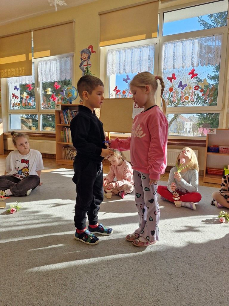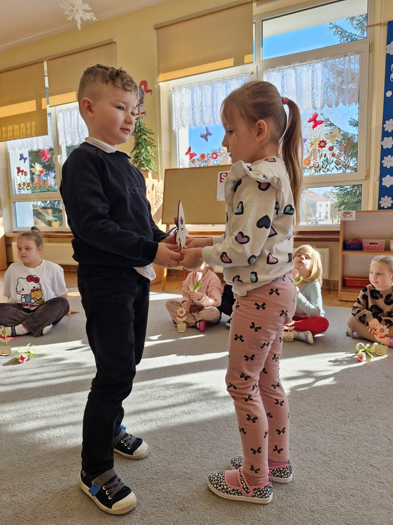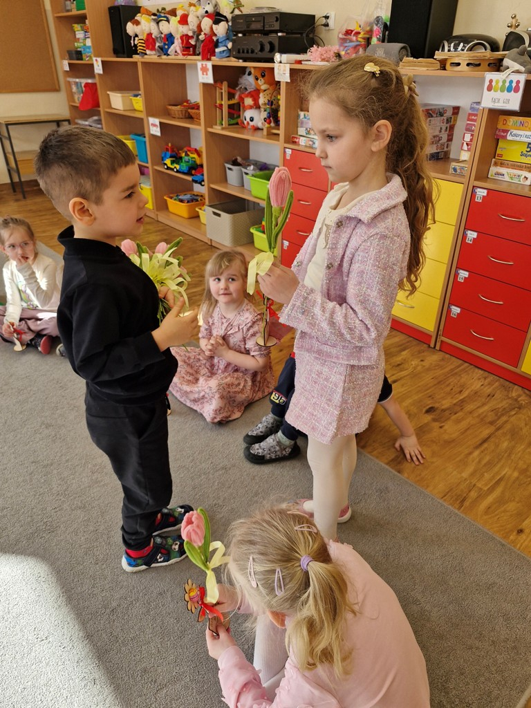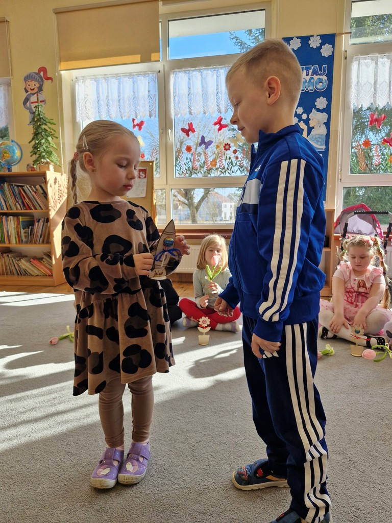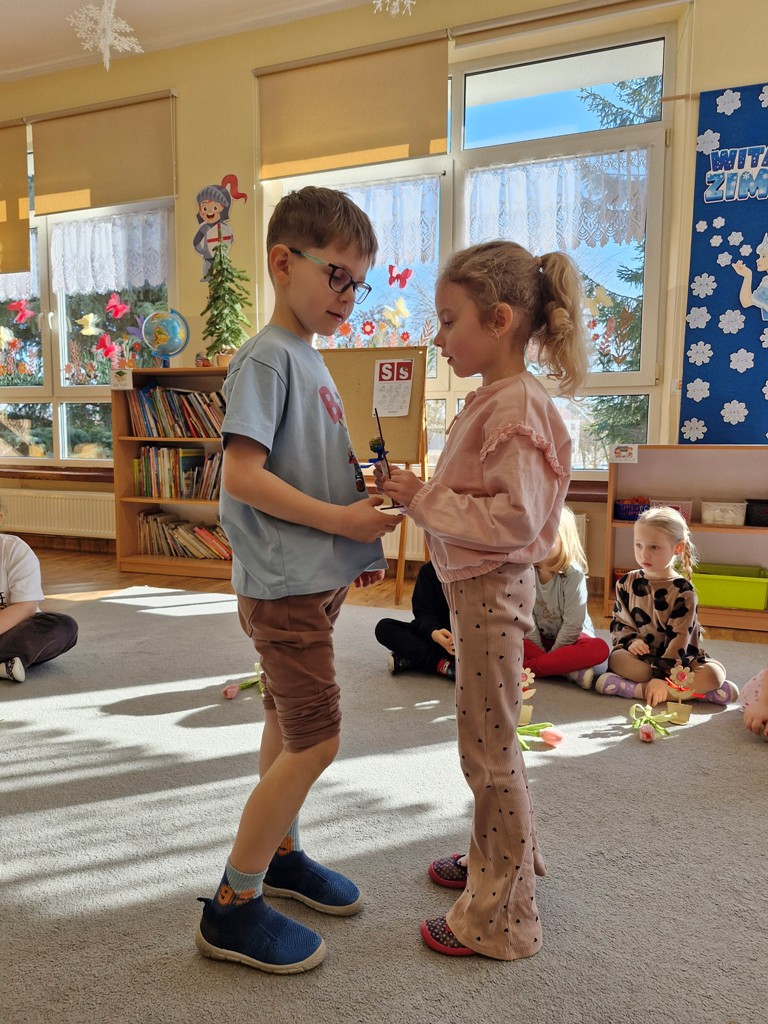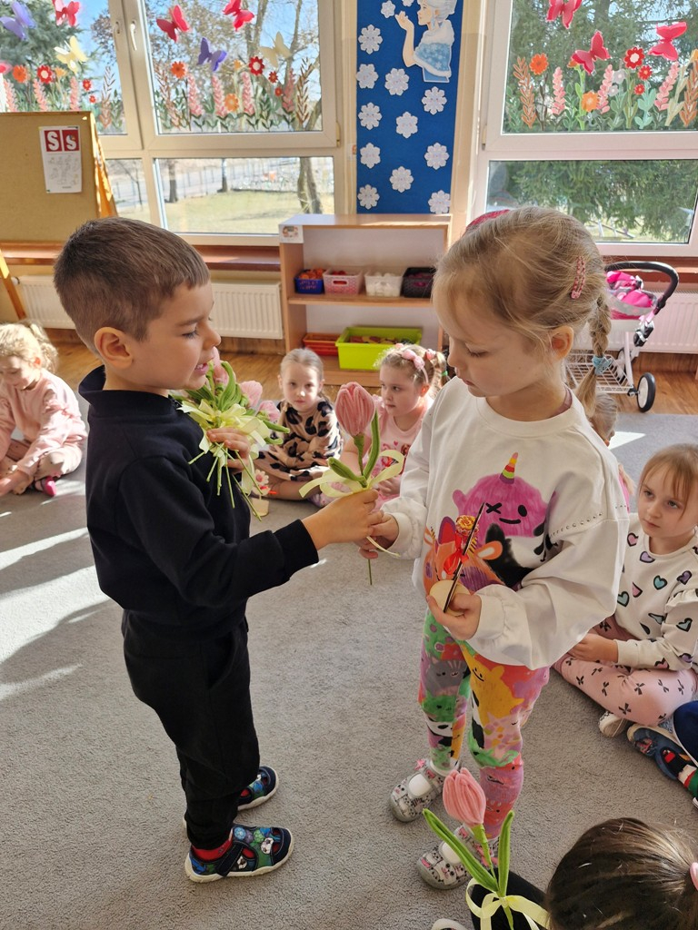 8 marca to wyjątkowy dzień w roku, gdyż swoje święto obchodzą wszystkie kobiety, zarówno te duże, jak i małe. W tym szczególnym dniu dzieci bawiły się przy piosence Słoneczne życzenia, wcielając się w role solistów, a także bawiły się przy muzyce. Wszyscy chłopcy skladali dziewczynkom życzenia, wręczając im kwiatki wykonane z drewna, a kolega Szymon podarował każdej dziewczynce tulipana wykonanego z drucika kreatywnego. Radość i uśmiech towarzyszyły dziewczynkom w tym świątecznym dniu. Dziewczynki równiez obdarowały chłopców upominkami, wręczajac im drewniane rakiety z lizakami z okazj Dnia Mężczyzny przypadajacego dwa dni później. Przedszkolaki pamiętały również o swoich mamach, przygotowując na zajeciach plastycznych niespodziankę - obrazek na ścianę z okazj Dnia Kobiet. Panie i dziewczynki serdecznie dziękują chłopcom za życzenia, kwiaty i promienny uśmiech. Dziękujemy również Pani Kasi - mamie Julki za przygotowanie upominków dla dzieci.