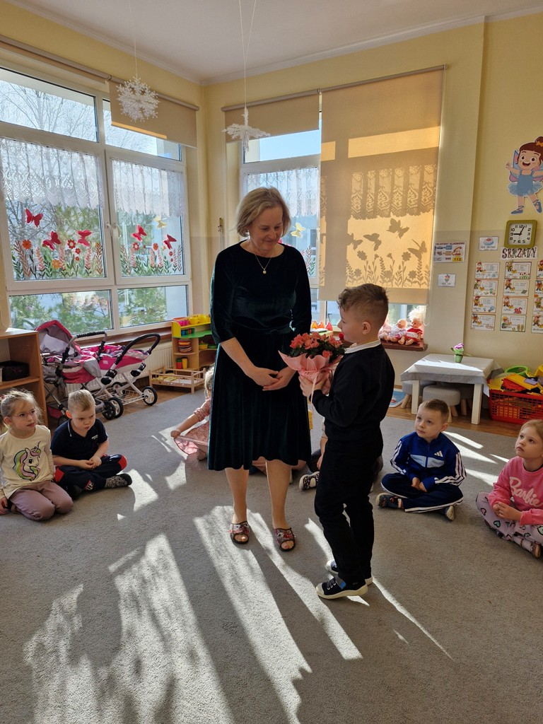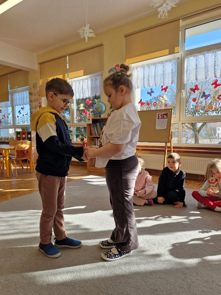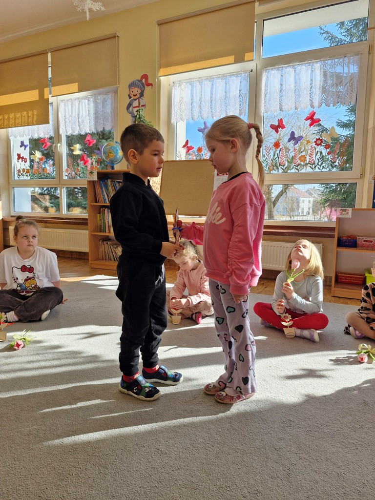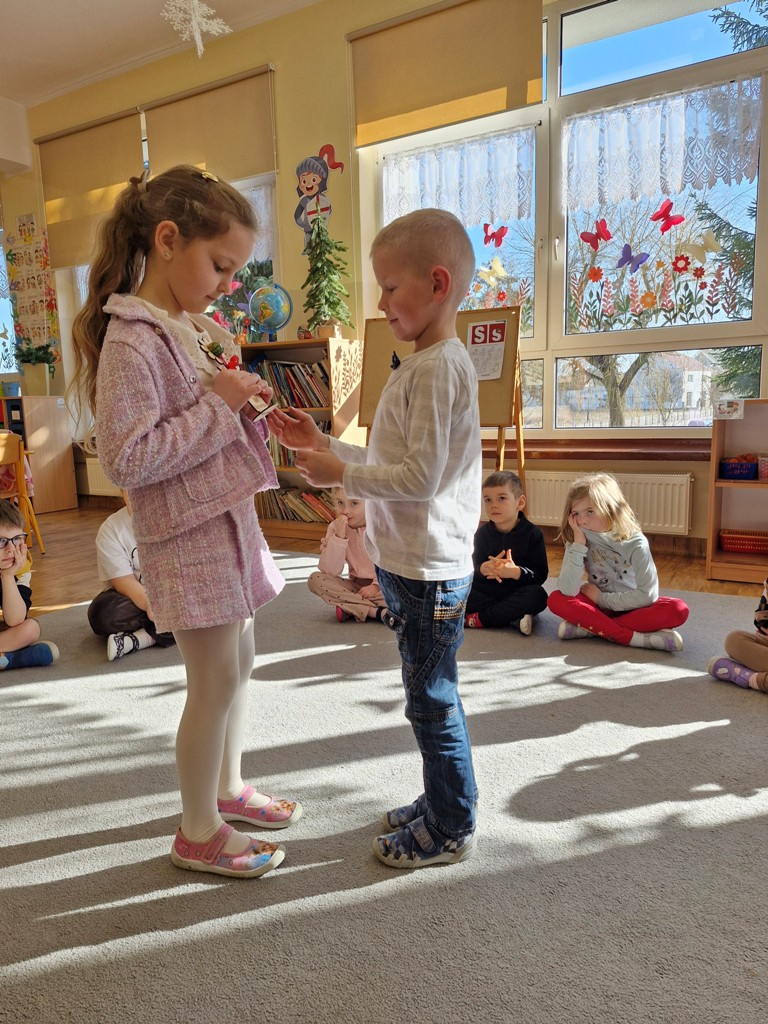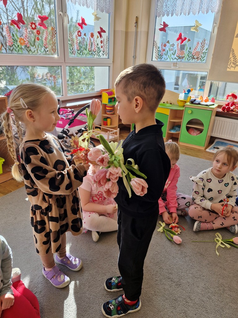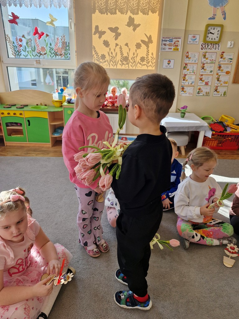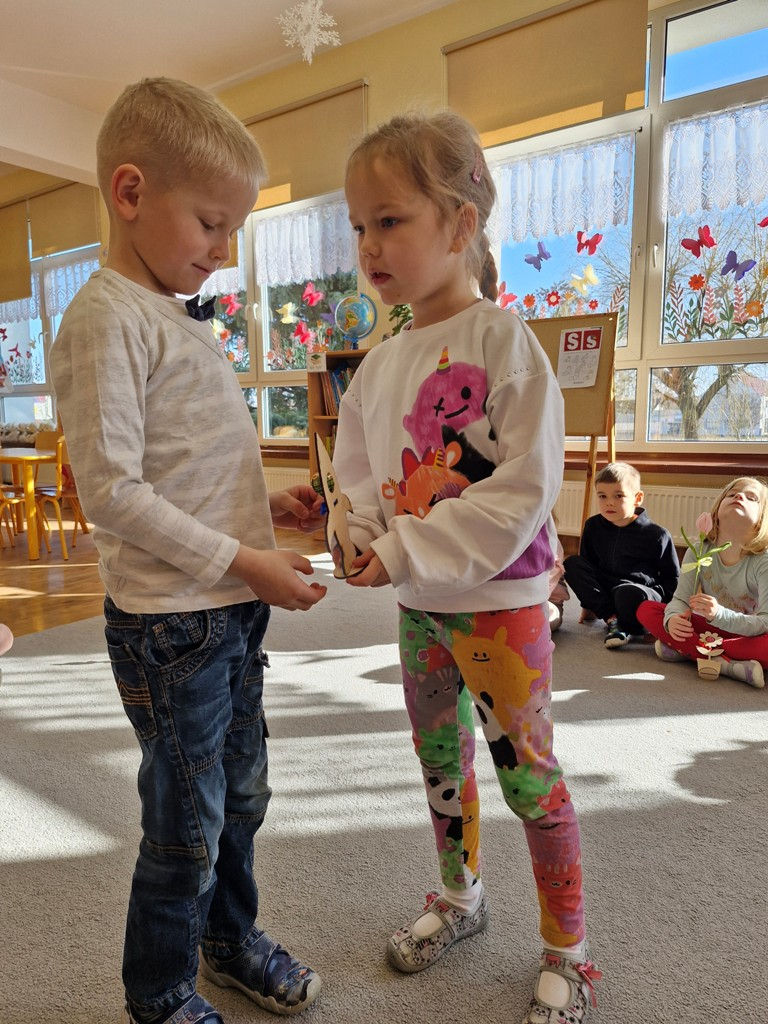 8 marca to wyjątkowy dzień w roku, gdyż swoje święto obchodzą wszystkie kobiety, zarówno te duże, jak i małe. W tym szczególnym dniu dzieci bawiły się przy piosence Słoneczne życzenia, wcielając się w role solistów, a także bawiły się przy muzyce. Wszyscy chłopcy skladali dziewczynkom życzenia, wręczając im kwiatki wykonane z drewna, a kolega Szymon podarował każdej dziewczynce tulipana wykonanego z drucika kreatywnego. Radość i uśmiech towarzyszyły dziewczynkom w tym świątecznym dniu. Dziewczynki równiez obdarowały chłopców upominkami, wręczajac im drewniane rakiety z lizakami z okazj Dnia Mężczyzny przypadajacego dwa dni później. Przedszkolaki pamiętały również o swoich mamach, przygotowując na zajeciach plastycznych niespodziankę - obrazek na ścianę z okazj Dnia Kobiet. Panie i dziewczynki serdecznie dziękują chłopcom za życzenia, kwiaty i promienny uśmiech. Dziękujemy również Pani Kasi - mamie Julki za przygotowanie upominków dla dzieci.