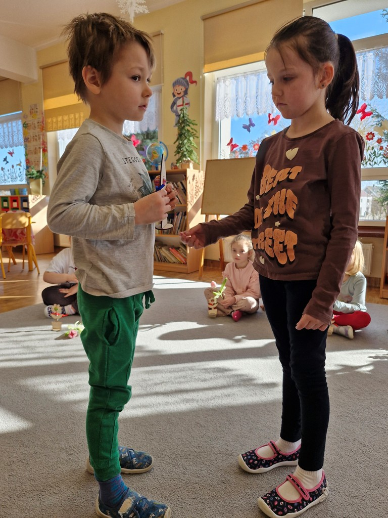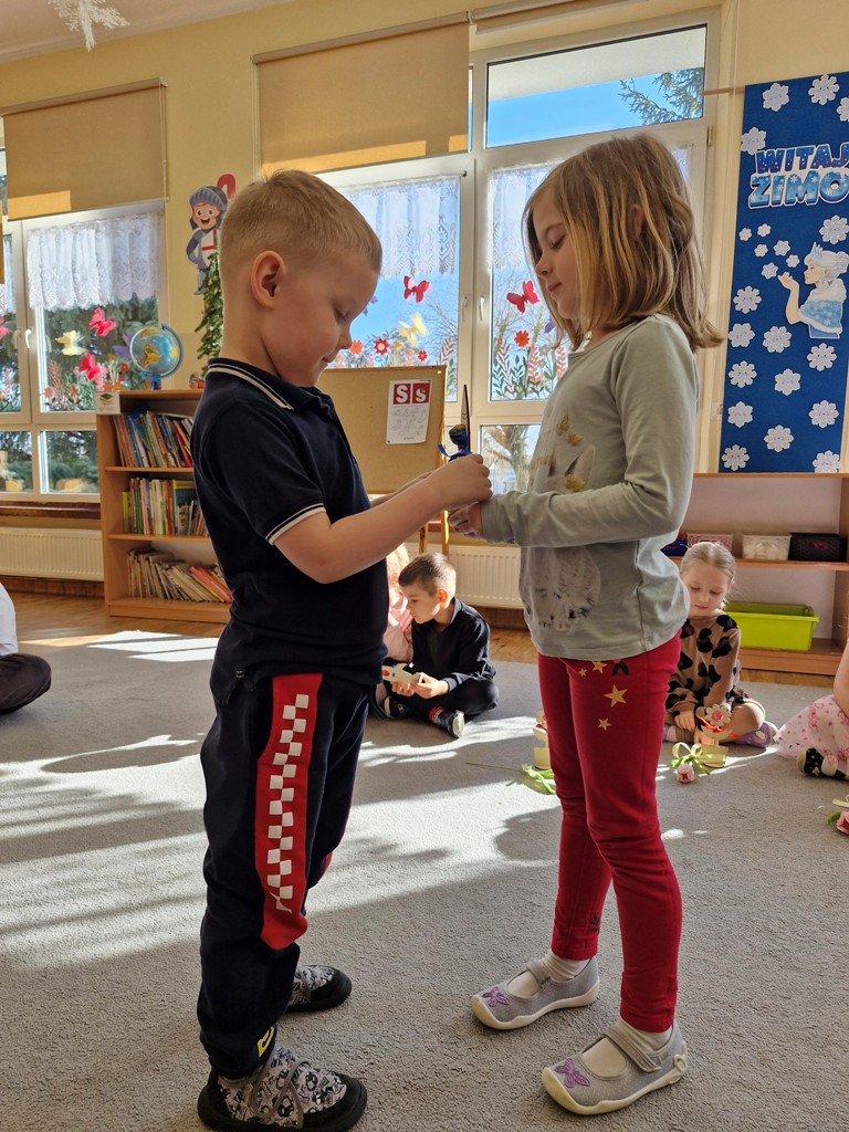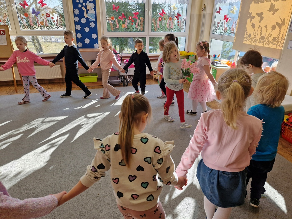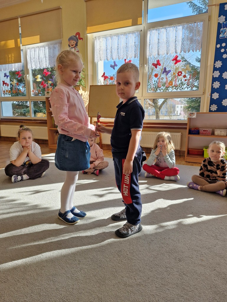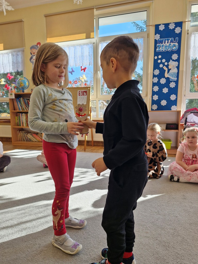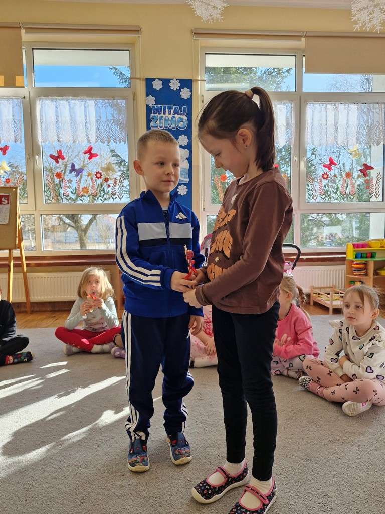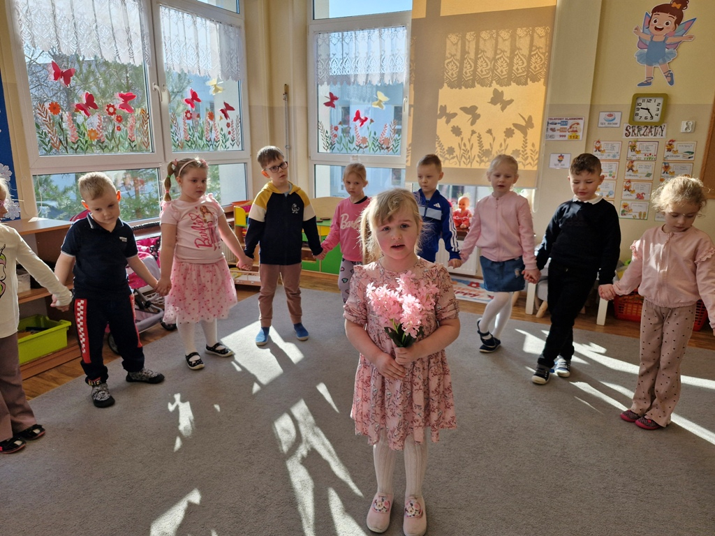 8 marca to wyjątkowy dzień w roku, gdyż swoje święto obchodzą wszystkie kobiety, zarówno te duże, jak i małe. W tym szczególnym dniu dzieci bawiły się przy piosence Słoneczne życzenia, wcielając się w role solistów, a także bawiły się przy muzyce. Wszyscy chłopcy skladali dziewczynkom życzenia, wręczając im kwiatki wykonane z drewna, a kolega Szymon podarował każdej dziewczynce tulipana wykonanego z drucika kreatywnego. Radość i uśmiech towarzyszyły dziewczynkom w tym świątecznym dniu. Dziewczynki równiez obdarowały chłopców upominkami, wręczajac im drewniane rakiety z lizakami z okazj Dnia Mężczyzny przypadajacego dwa dni później. Przedszkolaki pamiętały również o swoich mamach, przygotowując na zajeciach plastycznych niespodziankę - obrazek na ścianę z okazj Dnia Kobiet. Panie i dziewczynki serdecznie dziękują chłopcom za życzenia, kwiaty i promienny uśmiech. Dziękujemy również Pani Kasi - mamie Julki za przygotowanie upominków dla dzieci.