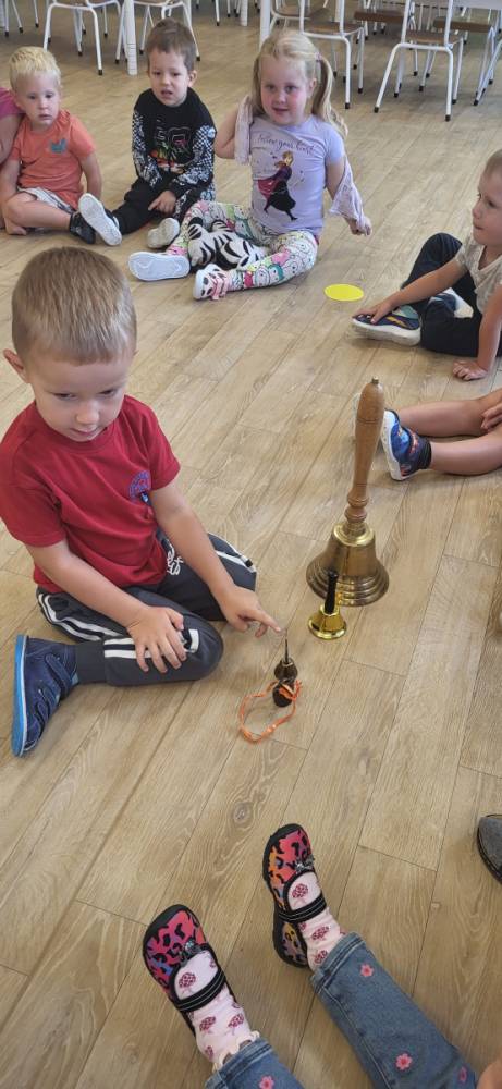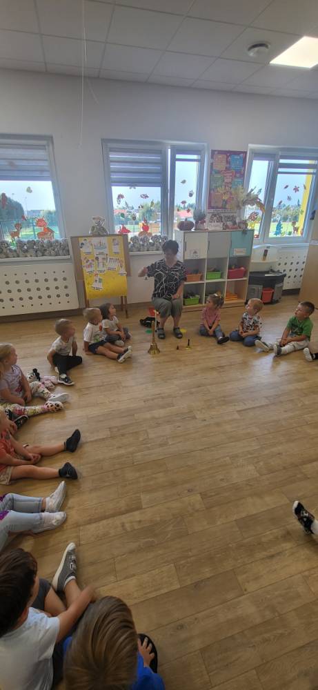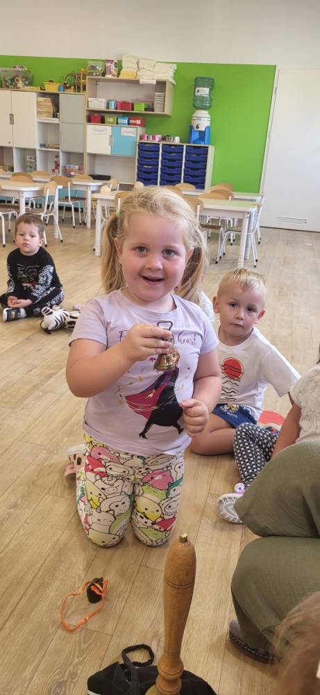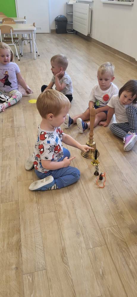 W trakcie zajęć dzieci słuchały różnych dźwięków – cichych i głośnych, małych i dużych dzwonków – ucząc się rozróżniać ich brzmienie.