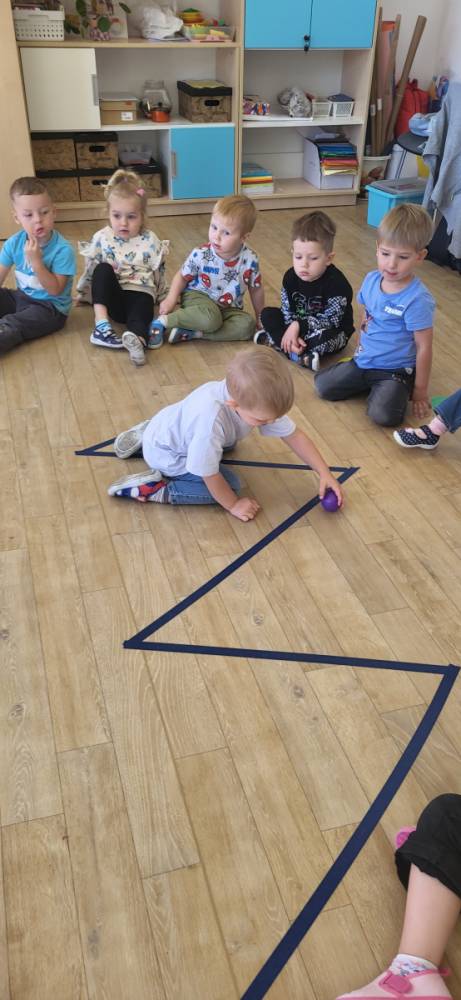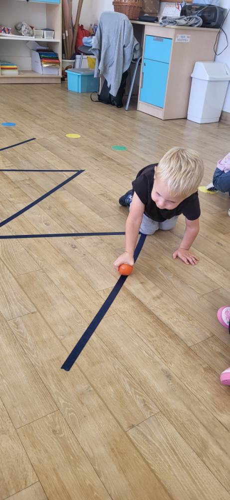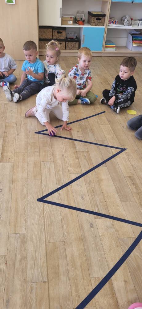 Słoneczka podczas trwania zajęć rozwijały sprawność manualno-manipulacyjną poprzez zabawę z piłeczkami. Dzieci z dużym skupieniem turlały piłeczki po wyznaczonym śladzie, starając się, by nie zjechały z toru.