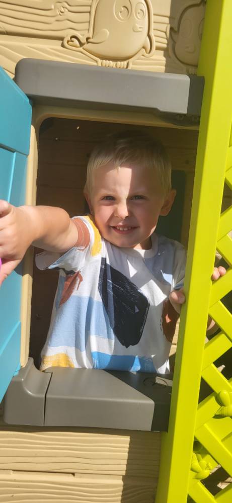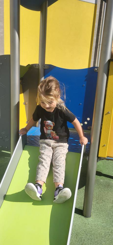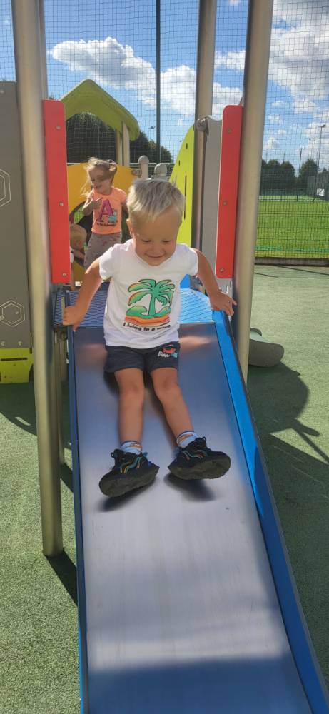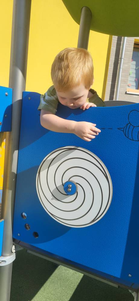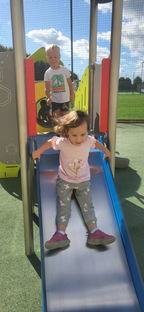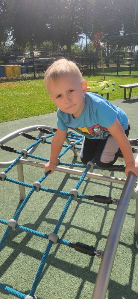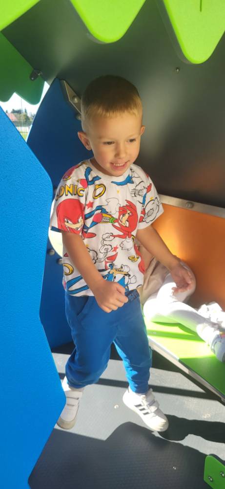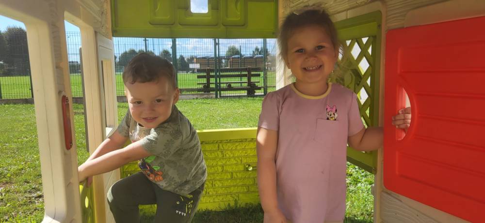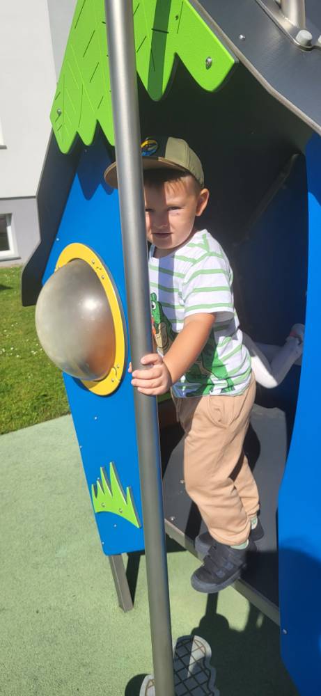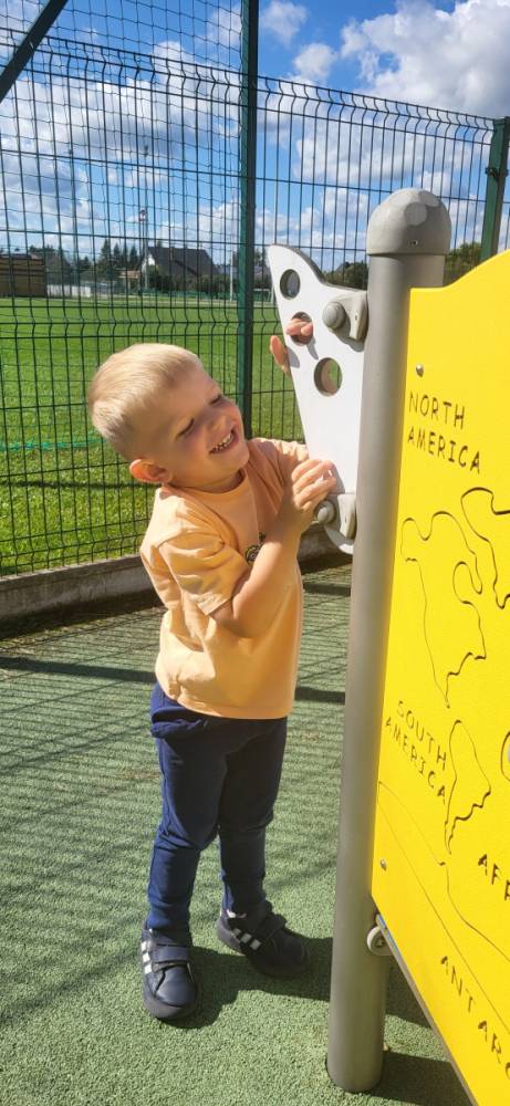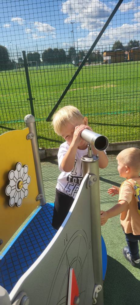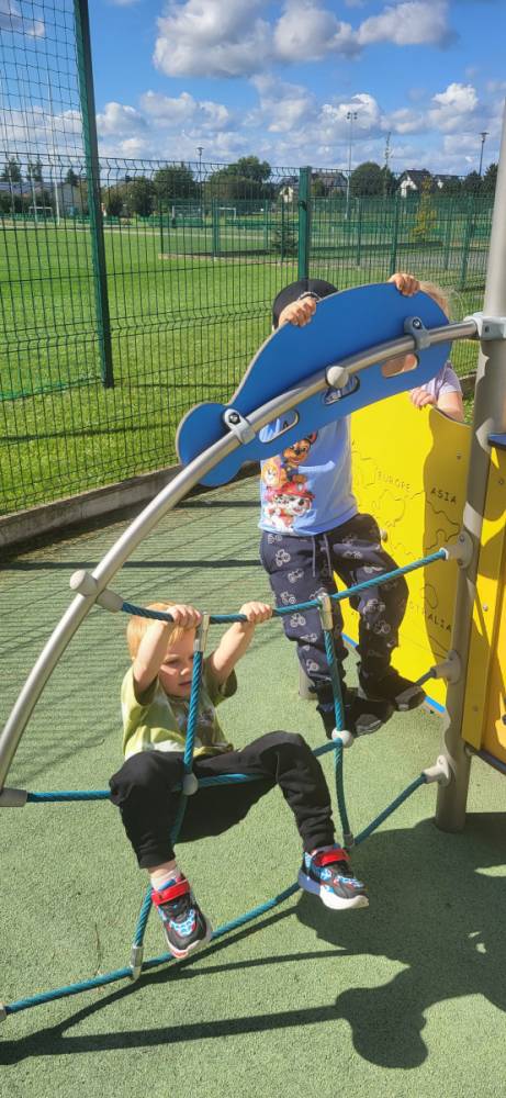 Piękna, słoneczna pogoda zachęciła nasze przedszkolaki do wspólnej zabawy na placu zabaw. Dzieci z radością korzystały z domków, zjeżdżalni i wspinaczek. Wspólnie biegały i ćwiczyły równowagę na sprzętach terenowych.